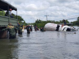 เมื่อวันที่ 9 ต.ค.65 ผู้สื่อข่าวรายงานว่า ที่บริเวณสะพานข้ามแม่น้ำมูล ต.กุดเมืองฮาม อ.ยางชุมน้อย จ.ศรีสะเกษ ซึ่งเป็นที่ตั้งของหาดบ้านแก้ง สถานที่ท่องเที่ยวทางน้ำชื่อดังของ จ.ศรีสะเกษ มีแพจำหน่ายอาหารจำนวนมากให้กับนักท่องเที่ยวที่มาเล่นน้ำ ปรากฏว่าน้ำจากแม่น้ำมูลได้เอ่อล้นไหลทะลักท่วมหาดบ้านแก้ง ทำให้บ้านเรือนของชาวบ้านและแพจำหน่ายอาหารถูกน้ำท่วม บรรดาเจ้าของแพต้องพากันนำเอาเชือกมาผูกกับแพของตน แล้วนำเอาไปโยงกับต้นยางใหญ่ที่ขึ้นอยู่ตามธรรมชาติจำนวนมาก เพื่อดึงแพเอาไว้ ไม่ให้ไหลไปตามน้ำ ส่วนบ้านเรือนหลายสิบหลังถูกน้ำท่วมเห็นแต่หลังคาบ้าน โดยขณะนี้ระดับน้ำท่วมถึงคอสะพานบ้านแก้งแล้ว ชาวบ้านต้องพากันนำเอาข้าวของและสัตว์เลี้ยงขึ้นมาอยู่บริเวณคอสะพานบ้านแก้ง ส่วนชาวบ้านคนใดมีญาติพี่น้องอยู่ในบ้านแก้งหรือหมู่บ้านต่างๆ ก็จะพากันอพยพไปอยู่ที่บ้านเรือนของญาติพี่น้องเป็นการชั่วคราว
