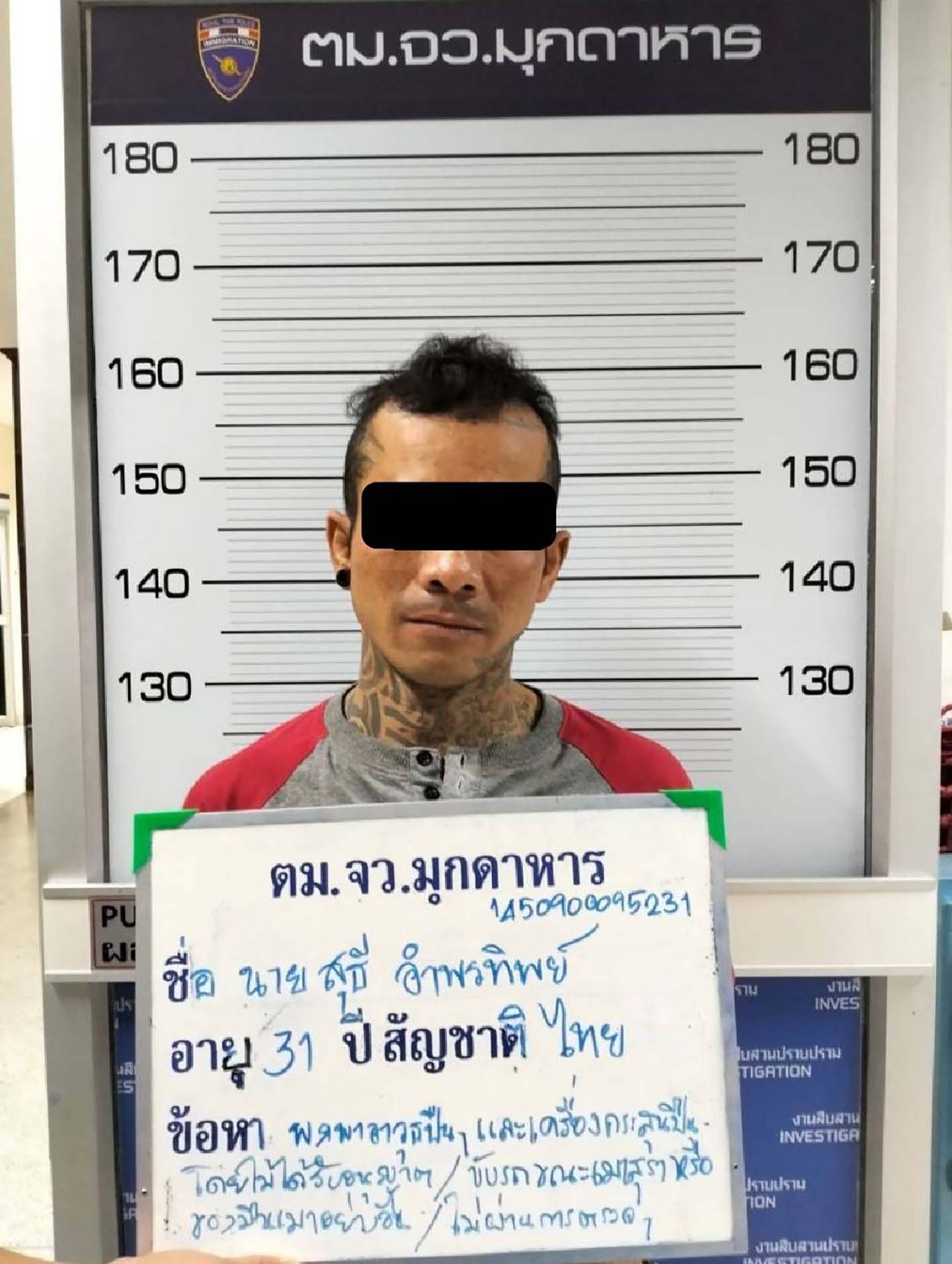 สืบเนื่องจากเมื่อเวลา 19.30 น. วันที่ 23 ม.ค. ตม.จว.มุกดาหาร ร่วมกับหน่วยงานความมั่นคงในพื้นที่ ได้ร่วมกันทำการจับกุมตัว นายสุธี อำพรทิพย์ อายุ 31 ปี สัญชาติ ไทย โดยกล่าวหาว่ากระทำความผิดฐาน1. เป็นบุคคลซึ่งเดินทางออกไปนอกราชอาณาจักรโดยไม่ผ่านการตรวจอนุญาตของเจ้าหน้าที่ของด่านตรวจคนเข้าเมืองประจำเส้นทางนั้น 2. เป็นผู้ขับขี่(รถจักรยานยนต์)เสพหรือรับเข้าร่างกายไม่ว่าด้วยวิธีใด ๆ ซึ่งวัตถุที่ออกฤทธิ์ต่อจิตและประสาทกลุ่มแอมเฟตามีน หรือวัตถุที่ออกฤทธิ์ต่อจิตและประสาทอย่างอื่น 3.พกพาอาวุธปืนและเครื่องกระสุนปืนไปในที่สาธารณะโดยไม่ได้รับอนุญาต 4.มีอาวุธปืนและเครื่องกระสุนปืนไว้ในครอบครองโดยไม่ได้รับอนุญาตจากนายทะเบียนท้องที่