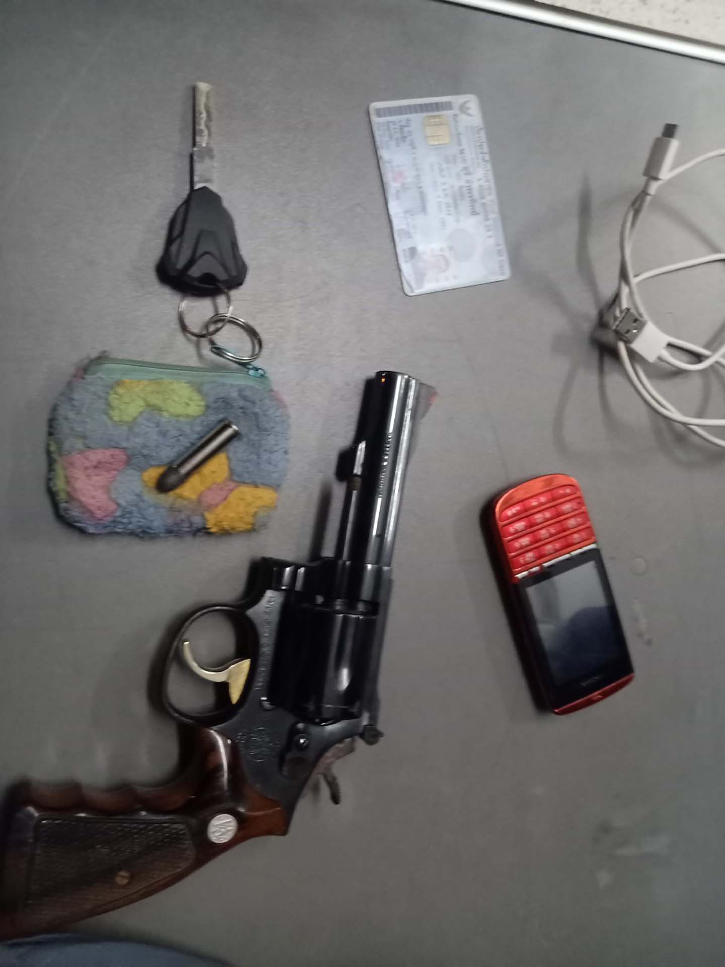 พร้อมด้วยของกลางและตำแหน่งที่พบของกลาง 1.อาวุธปืนลูกโม่ ขนาด .38 มม. ยี่ห้อ smith and wesson จำนวน 1 กระบอก เลขทะเบียน กท 3200034 พบที่บริเวณหัวกางเกงด้านในข้างขวาของผู้ต้องหาขณะถูกจับกุม 2.เครื่องกระสุนปืน ขนาด .38 มม. จำนวน 1 นัด พบบรรจุอยู่ภายในอาวุธปืนขณะถูกจับกุม