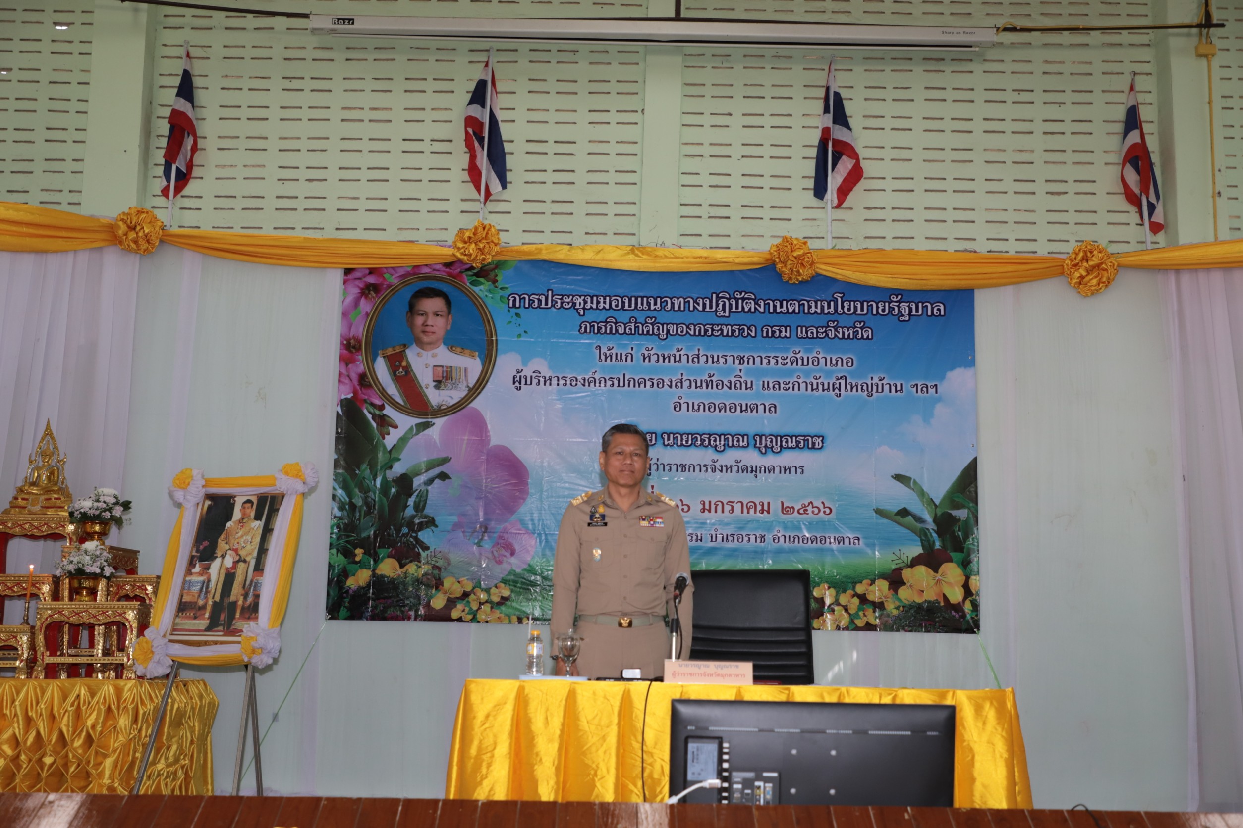 มุกดาหาร/เมื่อวันที่ 26 มกราคม 2566 เวลา 10.00 น. นายวรญาณ บุญณราช ผู้ว่าราชการจังหวัดมุกดาหาร มอบแนวทางการปฏิบัติงาน ให้แก่หัวหน้าส่วนราชการ หัวหน้าหน่วยงานรัฐวิสาหกิจ ผู้บริหารองค์กรปกครองส่วนท้องถิ่น กำนันผู้ใหญ่บ้าน และผู้ปฏิบัติงานในพื้นที่ โดยมีนางอัญชลี กัลมาพิจิตร นายกเหล่ากาชาดจังหวัดมุกดาหาร นางกัลยกร สุขสานต์ รองนายกองค์การบริหารส่วนจังหวัดมุกดาหารและส่วนราชการที่เกี่ยวข้อง เข้าร่วม ณ หอประชุมสุธรรมบำเรอราช อำเภอดอนตาล จังหวัดมุกดาหาร