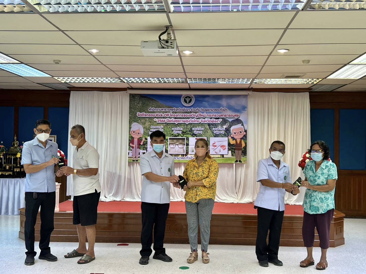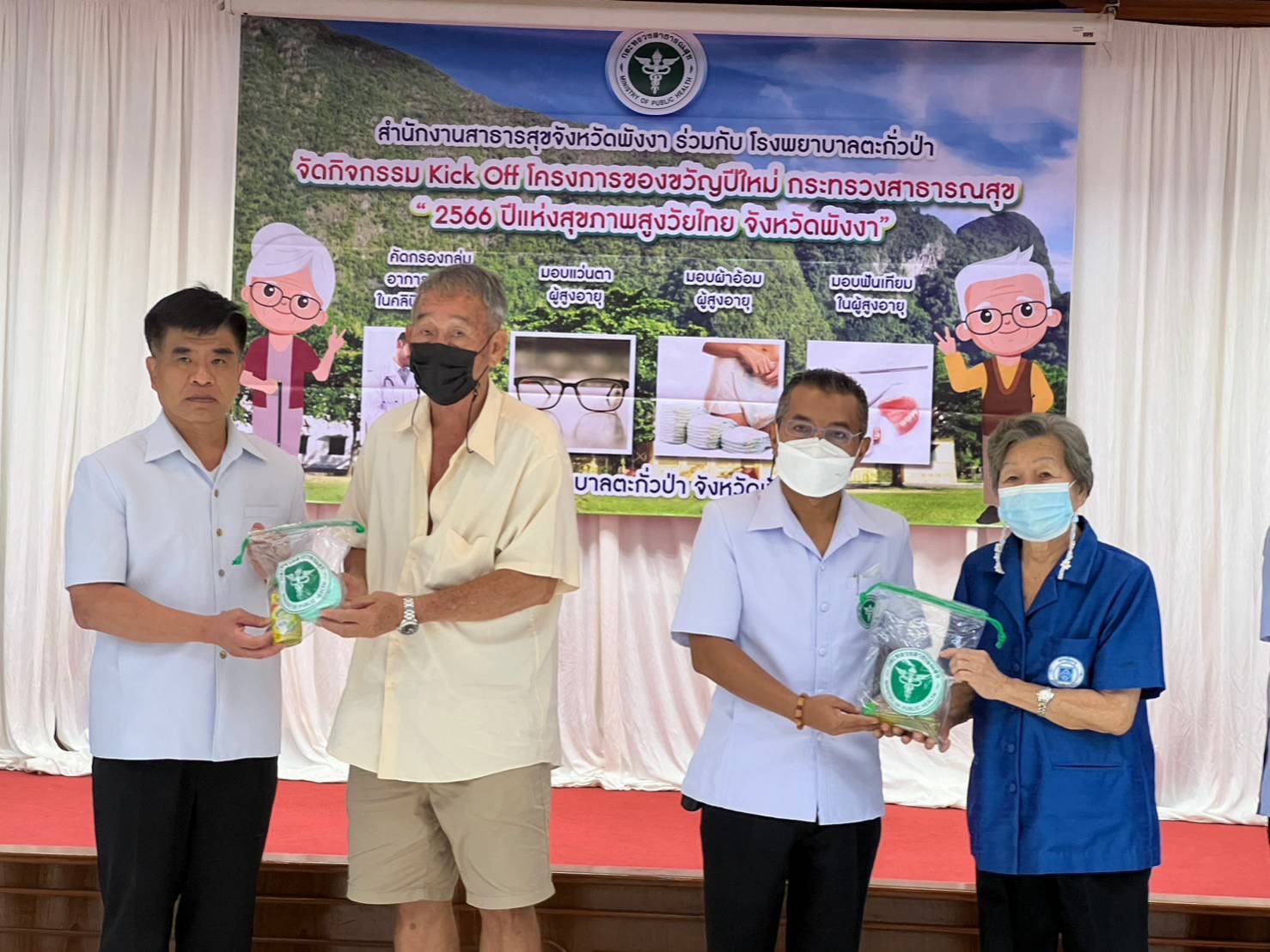 วันที่ 27 มกราคม 2566 ณ ห้องประชุมชั้น 4 โรงพยาบาลตะกั่วป่า นายแพทย์วิทยา วัฒนเรืองโกวิท นายแพทย์สาธารณสุขจังหวัดพังงา เป็นประธานเปิดกิจกรรม Kick off โครงการของขวัญปีใหม่ กระทรวงสาธารณสุข “พ.ศ.2566 ปีแห่งสุขภาพสูงวัยไทย จังหวัดพังงา” โดยมีนายแพทย์สงกรานต์ จันทร์มุณี ผู้อำนวยการโรงพยาบาลตะกั่วป่า เป็นผู้กล่าวรายงาน ด้วยกระทรวงกำหนดให้ปี 2566 เป็นปีแห่งผู้สูงวัยไทยจึงมีนโยบายการดำเนินโครงการมอบของขวัญผู้สูงอายุ ภายในงานประกอบด้วยกิจกรรมหลัก 6 ประเด็น ดังนี้