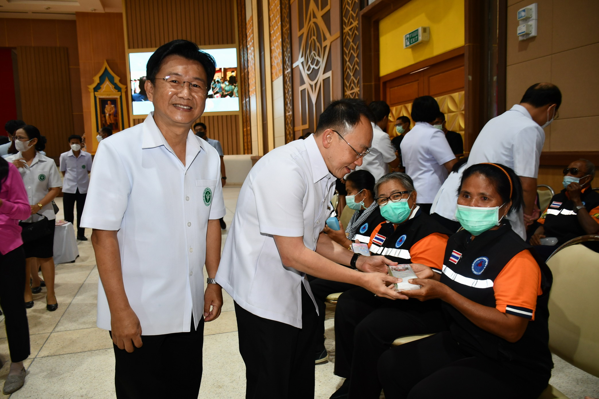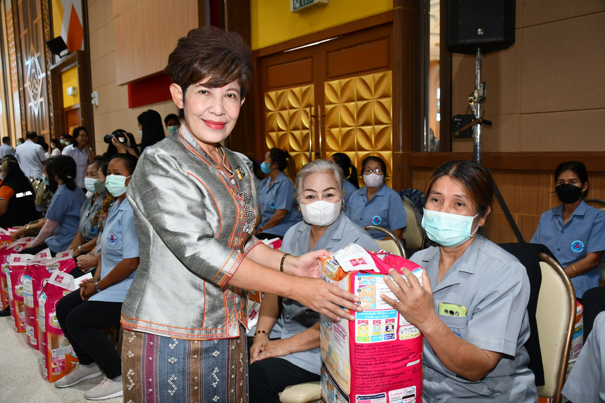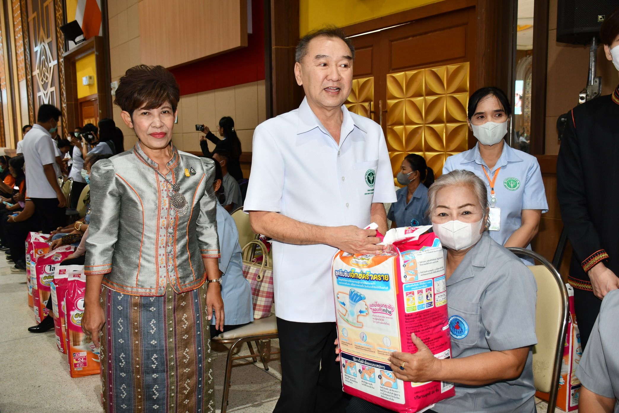 นายแพทย์ประพนธ์ ตั้งศรีเกียรติกุล ผู้ช่วยรัฐมนตรีประจำสำนักนายกรัฐมนตรี กล่าวด้วยว่า แต่จริงๆแล้วเราก็ทำงานร่วมกับ อสม.และเป้าหมายจริงๆในปีนี้ก็คือ ของขวัญปีใหม่ซึ่งกระทรวงสาธารณสุขได้มอบให้กับพี่น้องในกลุ่มผู้สูงอายุ คือเป็นปีแห่งสุขภาพของผู้สูงวัยไทย เพราะฉะนั้นเราก็มองว่าเป็นปัญหาที่จะเกิดขึ้นคือปัญหาเรื่องของการมองเห็น เรื่องของการกินเป็นเรื่องของปัญหาที่เกิดจากการใช้มานาน ๆ และมีเรื่องของแว่นตา การแก้ไขสายตาเพื่อให้มองเห็น มีฟันเทียมเพราะว่าฟันเก่าหายไปหมดแล้วเนื่องจากใช้มายาวนานก็ต้องเปลี่ยนฟันเทียม และเมื่อได้ฟันเทียมมาแล้วหากฟันเทียมไม่ยึดมั่น เราก็มีการฝังรากฟันเทียมเพื่อให้ฟันเทียมที่ได้มายึดแน่นก็สามารถที่จะเคี้ยวอาหารได้ อีกกลุ่มหนึ่งของผู้สูงอายุที่ มีสุขภาวะหรือมีโรคประจำจนกระทั่งล้มป่วยติดบ้านติดเตียง กลุ่มนี้ก็จะมีปัญหาเรื่องการขับถ่ายเราก็จะส่งมอบผ้าอ้อมเพื่อให้ได้ใช้เพื่อเป็นการลดค่าใช้จ่ายในครัวเรือน เราอยากให้ผู้สูงอายุมีสุขภาพแข็งแรง เราจะคัดกรองผู้สูงอายุทั่วประเทศไทยก็มีกว่า 12,000,000 คนนี้ เราก็จะคัดกรองเพื่อจำแนกผู้สูงอายุว่า เป็นผู้สูงอายุที่มีสุขภาพดีเพื่อขอให้ท่านรักษาสุขภาพที่ดีให้ยืนยาวที่สุด ผู้สูงอายุที่มีปัญหาด้านสุขภาพเราก็แก้ไขเช่นฟันเทียม เรื่องสายตาและผู้สูงอายุที่ติดเตียงเราก็จะดูแลด้วยโดยผ่านทางพี่น้อง อสม.เพราะฉะนั้นจึงเป็นการทำงานร่วมกันซึ่งในวันนี้ก็เป็นการพบปะระหว่างผู้ที่ทำงานในโรงพยาบาลกับพี่น้อง อสม.เพื่อให้เข้าใจว่า รัฐบาลไทยโดยกระทรวงสาธารณสุขได้มอบของขวัญและมีความเป็นห่วงญาติผู้ใหญ่ของเราที่อยู่ในครอบครัวไทย////////////