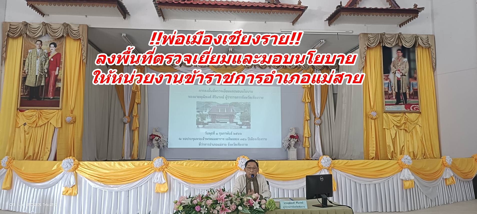 เมื่อวันที่ 1 ก.พ.66 เวลา 13.30 น. นายพุฒิพงศ์ ศิริมาตย์ ผู้ว่าราชการจังหวัดเชียงราย พร้อมคณะได้เดินทางมาลงพื้นที่ตรวจเยี่ยมและมอบนโยบายให้หน่วยงานข้าราชการ อ.แม่สาย จ.เชียงราย โดยมี นายณรงค์พล คิดอ่าน นายอำเภอแม่สาย พ.ต.อ.พิพัฒน์ นาระเดช ผกก.สภ.แม่สาย พ.ต.อ.เขมชาติ วัฒนนภาเกษมผกก. ตม.จ.เชียงราย นางสาวประภาพรรณ ดวงชัย นายด่านศุลกากรแม่สาย พร้อมหน่วยงานข้าราชการ องค์กรปกครองส่วนท้องถิ่น และหน่วยงานภาคเอกชน ให้การตอนรับการลงพื้นที่ตรวจเยี่ยมและมอบนโยบายของผู้ว่าราชการจังหวัดเชียงรายในครั้งนี้ ณ หอประชุมพระเจ้าพรหมมหาราชเฉลิมฉลอง 750 ปี ที่ว่าการอำเภอแม่สาย
