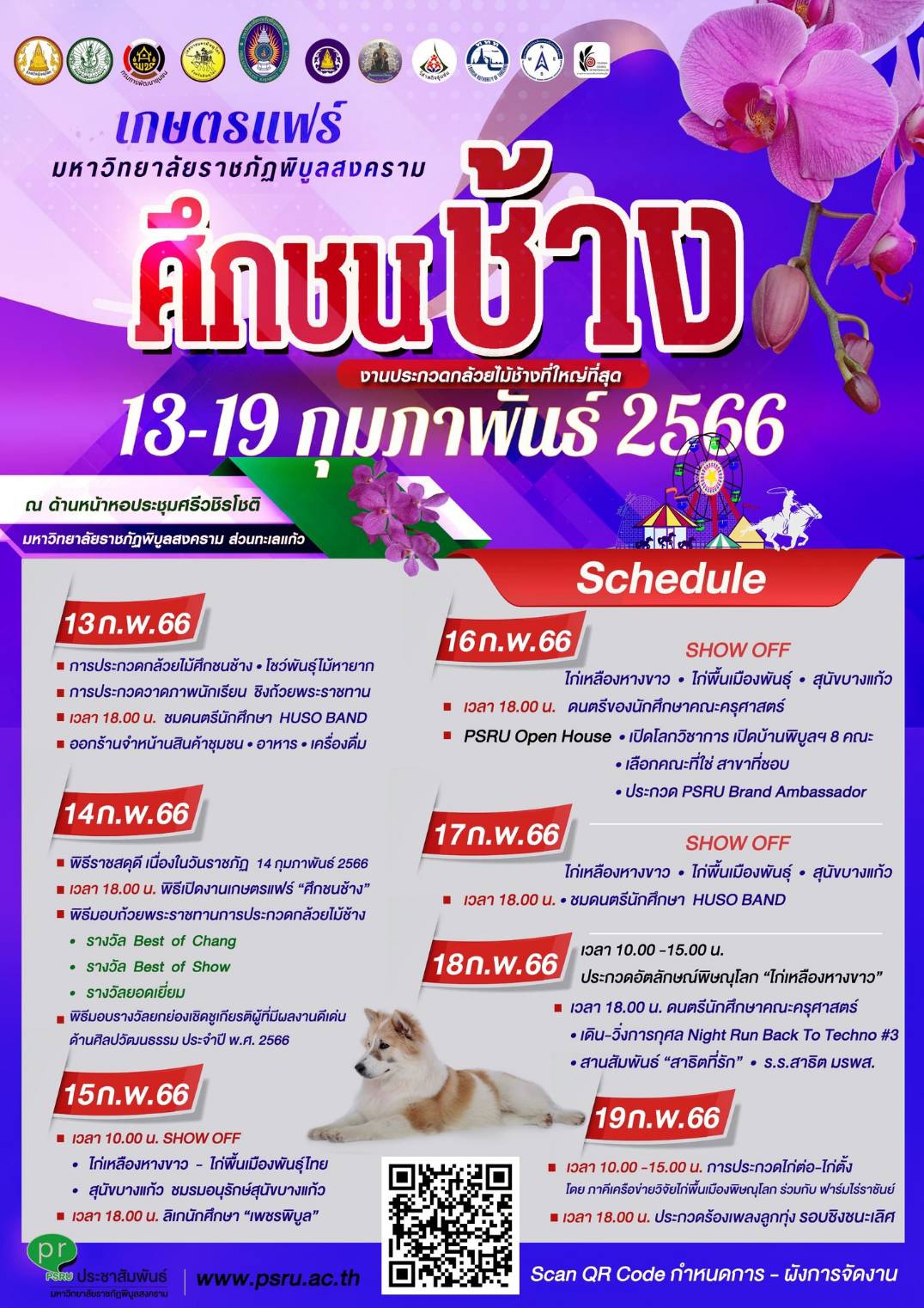 นางศศิวัณย์ ศรีพรหม ประธานสภาอุตสาหกรรมท่องเที่ยวจังหวัดพิษณุโลก และ สมาคมสหพันธ์ท่องเที่ยวภาคเหนือจังหวัดพิษณุโลก เปิดเผยว่า ระหว่างวันที่ 13-19 กุมภาพันธ์ 2566 ที่มหาวิทยาลัยราชภัฏพิบูลสงคราม ส่วนทะเลแก้ว จะมีการจัดงาน เกษตรแฟร์ “ศึกช้างชนช้าง” ขึ้น โดยมหาวิทยาลัยราชภัฎพิบูลสงครามร่วมกับหลายภาคส่วนจัดขึ้น ภายในงานจะมีไฮไลน์ที่น่าสนใจคืองานประกวดกล้วยไม้ที่ใหญ่ที่สุด ชิงถ้วยประทานพระเจ้าววรวงศ์เธอพระองค์เจ้าสิริภาจุฑาภรณ์ เพื่อเผยแพร่ผลงานวิจัยและนวัตกรรมของมหาวิทยาลัยออกสู่สังคม เปิดการเรียนรู้ให้กับนักศึกษา บุคลากร และอาจารย์ โดยใช้งานเกษตรแฟร์ “ศึกช้างชนช้าง” เป็นห้องปฏิบัติการภาคสนามเพื่อถ่ายทอดความรู้ทุกมิติจากห้องเรียน อีกทั้งยังเป็นช่องทางในการช่วยเหลือเกษตรกร ผู้ประกอบการให้มีรายได้จากการจำหน่ายผลิตผลทางการเกษตร ทำให้เกิดเศรษฐกิจหมุนเวียนกลับไปสู่ชุมชนและสังคม สร้างความสุขให้กับครอบครัว เพื่อสร้างความมั่นคงให้กับประเทศชาติ และเพื่อกระตุ้นให้มีการปลููกเลี้ยงกล้วยไม้ ขยายพันธุ์กล้วยไม้ เป็นศูนย์การพัฒนาพันธุ์และเป็นศูนย์กางเศรษฐกิจการค้ากล้วยไม้