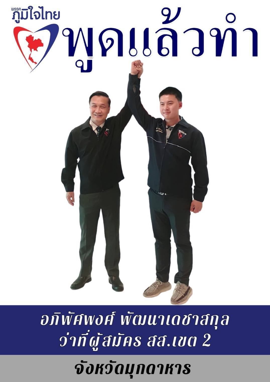 ได้มีการลงพื้นที่เพื่อแนะนำตัวและรับฟังปัญหาของประชาชนทุกพื้นที่ในเขตเลือกตั้งที่ 1 ซึ่งได้รับการตอบรับจากประชาชนในพื้นที่เป็นอย่างดี ส่วนเขตเลือกตั้งที่ 2 คือ นายอภิพัฒพงศ์ พัฒนาเดชาสกุล (บิ๊กบอส ) อายุ 26 ปี เป็นชาวอำเภอดงหลวงโดยกำเนิด ว่าที่ผู้สมัครสมาชิกสภาผู้แทนราษฎรจังหวัดมุกดาหาร เขต 2 พรรคภูมิใจไทย อดีตเคยรับราชการตำรวจ ที่ สภ. ดงหลวง 5 ปี แล้วลาออก เพื่อเตรียมตัวลงการเมือง เพื่อรับใช้ประชาชน อย่างจริงจัง การศึกษาจบ ปริญญาตรี นิติศาสตร์ ปริญญาโท บริหารธุรกิจ มุ่งมั่นเพื่อพัฒนาภายใต้สโลแกน อภิพัฒน์พงศ์ ขอรับใช้ ด้วยจิต ใจซื่อ มุ่งยึดถือภูมิใจไทย นำสนองเพื่อปากท้องพี่น้องด้วยใจปอง เพื่อสนองนโยบาย พูดแล้วทำ เป็นลูกชายหัวแก้วหัวแหวน ดร.คงสกล จึงพัฒนา อดีต สมาชิกสภาองค์การบริหารส่วนจังหวัดมุกดาหาร ในการลงพื้นที่ของนายอภิพัฒน์พงศ์ (บิ๊กบอส) ด้วยความเป็นคนหนุ่มไฟแรงหน้าตาดี ดีกรีปริญญาโท ทำให้การลงพื้นที่แนะนำตัวได้รับการตอบรับจากประชาชนในพื้นที่เป็นอย่างดีและมีเสียงเชียร์พร้อมขอถ่ายรูปร่วม เอกลักษณ์ที่โดยเด่นอีกประการคือสามารถใช้ภาษาถิ่นได้หลายภาษาจึงเป็นที่สนใจและยอมรับ พื้นที่ในเขตเลือกตั้งที่ 2 มี 4 อำเภอ แต่ละอำเภอมีภาษาถิ่นที่เป็นเอกลักษณ์ของตนเอง ซึ่งประกอบด้วย อำเภอดงหลวง อำเภอหนองสูง อำเภอคำชะอี และอำเภอนิคมคำสร้อย ในการลงพื้นที่ของว่าที่ผู้สมัครทั้ง 2 เขต พรรคภูมิใจไทย ได้ชูนโยบาย พูดแล้วทำ พักหนี้ 3 ปี หยุดต้น ปลอดดอกคนละไม่เกิน 1 ล้านบาท เกษตรร่ำรวย รู้ราคาก่อนปลูก รับเงินก่อนขาย เสียหายมีประกัน เครื่องฉายรังสีฟรี ทุกจังหวัด รักษามะเร็ง ศูนย์ฟอกไตฟรี ทุกอำเภอ ลดรายจ่าย เพิ่มรายได้
