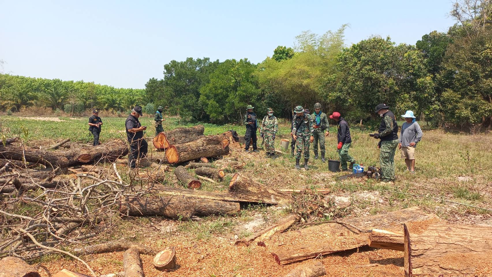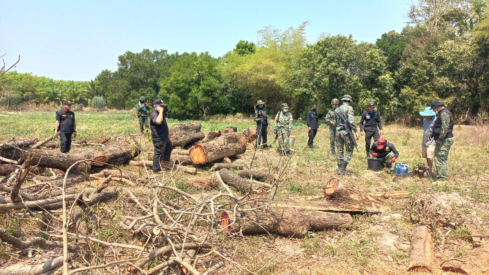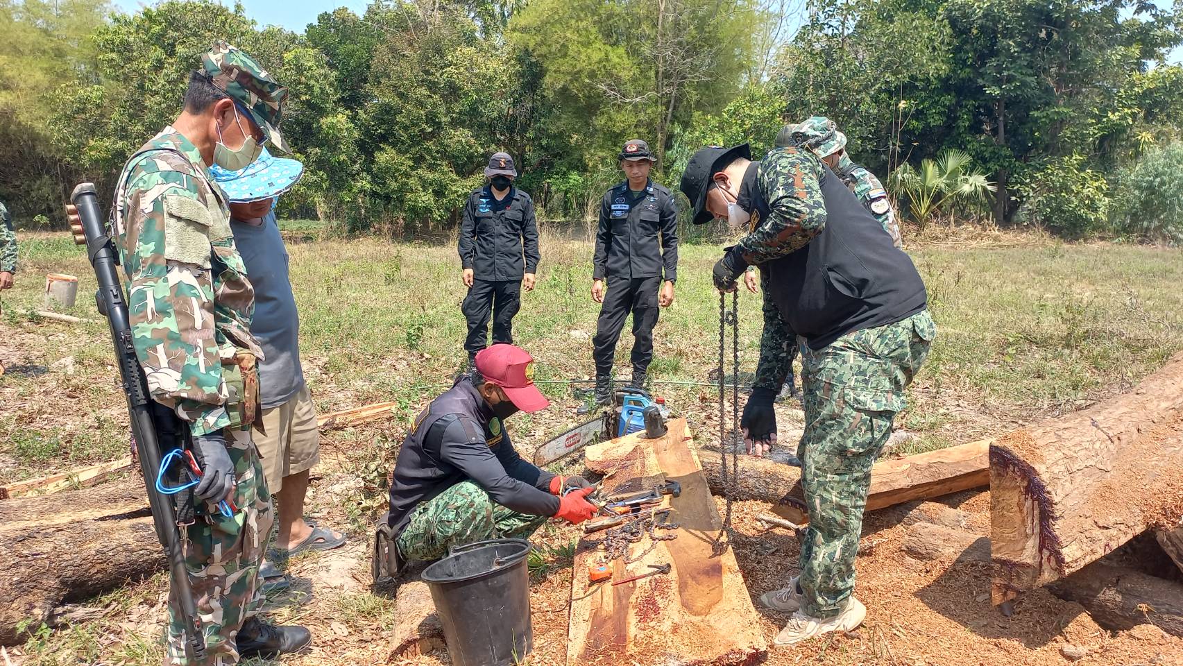 เมื่อวันที่ 18 ก.พ. 2566 ผู้สื่อข่าวรายงานว่า ที่บริเวณกลางทุ่งนาด้านทิศเหนือบ้านเสาธงชัย ม.1 ต.เสาธงชัย อ.กันทรลักษ์ จ.ศรีสะเกษ เจ้าหน้าที่อุทยานแห่งชาติเขาพระวิหาร พร้อมด้วยเจ้าหน้าที่หน่วยป้องกันรักษาป่าศรีสะเกษที่ 6 เจ้าหน้าที่หน่วยเฉพาะกิจกรมทหารพรานที่23 เจ้าหน้าที่ทหารหน่วยเฉพาะกิจที่1 และเจ้าหน้าที่ฝ่ายปกครองอำเภอกันทรลักษ์ ได้ร่วมกันเข้าไปทำการตรวจสอบที่บริเวณดังกล่าว หลังจากที่ได้รับแจ้งจากพลเมืองดี ว่ามีการลักลอบตัดต้นประดู่ขนาดใหญ่ใกล้หมู่บ้านเสาธงชัย ซึ่งอยู่ติดกับแนวชายแดนไทย – กัมพูชาด้านปราสาทพระวิหาร เมื่อเจ้าหน้าที่เดินทางไปใกล้ถึงจุดที่เกิดเหตุ คนร้ายจำนวน 2 คนที่กำลังตัดไม้ได้ไหวตัวทิ้งเลื่อยยนต์และอุปกรณ์ต่าง ๆ เอาไว้และวิ่งหลบหนีเข้าป่า เจ้าหน้าที่ได้จัดกำลังออกไล่ติดตามไปแต่ไม่พบ