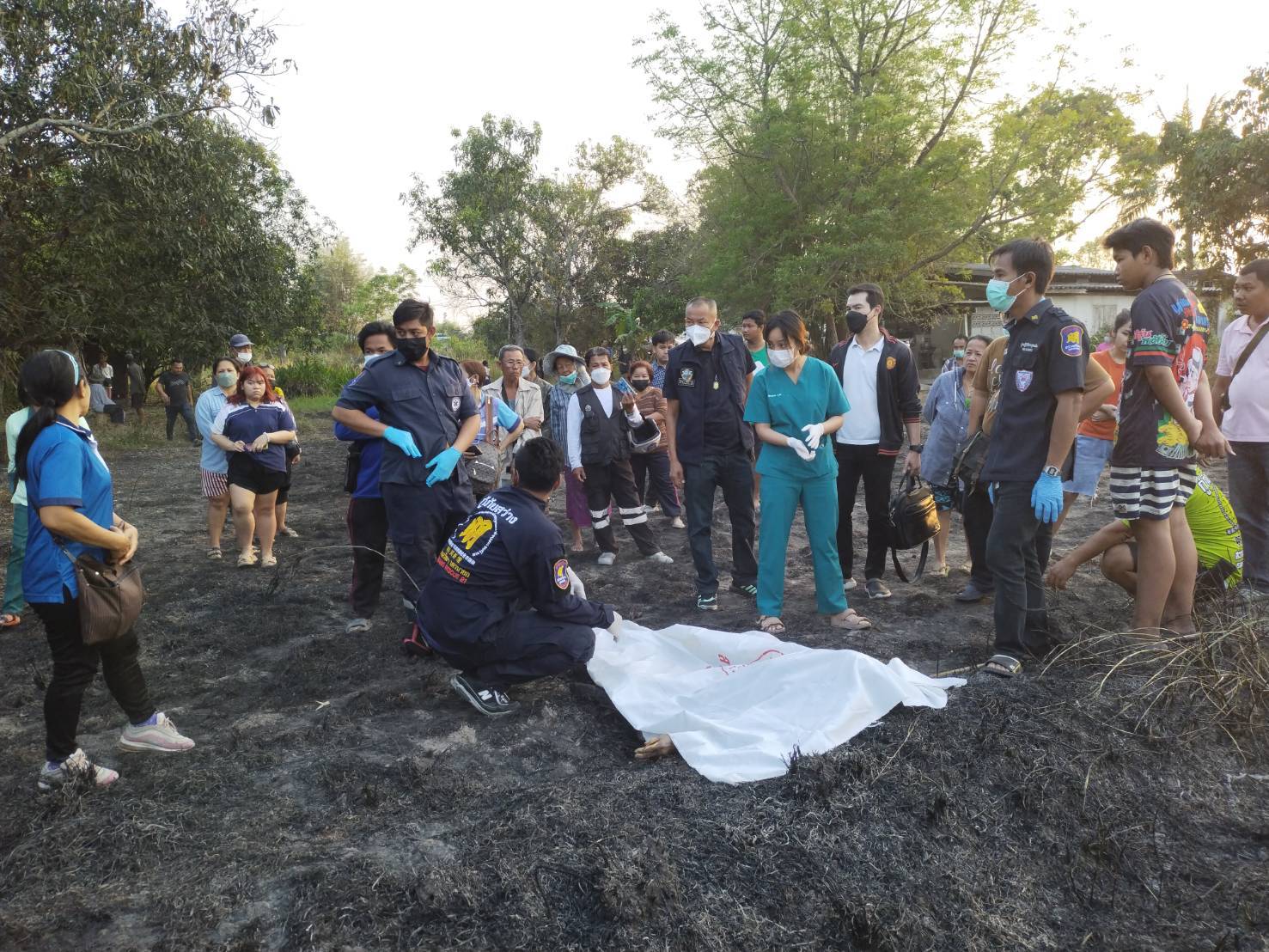 นอนเสียชีวิตอยู่กลางทุ่งนาที่ถูกไฟเผาไหม้และคอกผู้เสียชีวิตในที่เกิดเหตุเมื่อแพทย์เวรชันสูจน์พลิกศพพบว่าตามร่างกายศพ นอนหงายหน้า ถูกไฟไหม้ทั่วร่างกาย เสื้อผ้าไหม้ติดกับผิวหนัง นอนเสียชีวิตอยู่ในคันนาพื้นที่ประมาณ 1 ไร่ ส่วนทางแพทย์เวรจะได้ส่งผ่าพิสูจน์ที่โรงพยาบาล ม.ศ.ว. องครักษ์ แล้วจะได้ติดต่อญาติมารับศพไปบำเพ็ญกุศลตามประเพณี