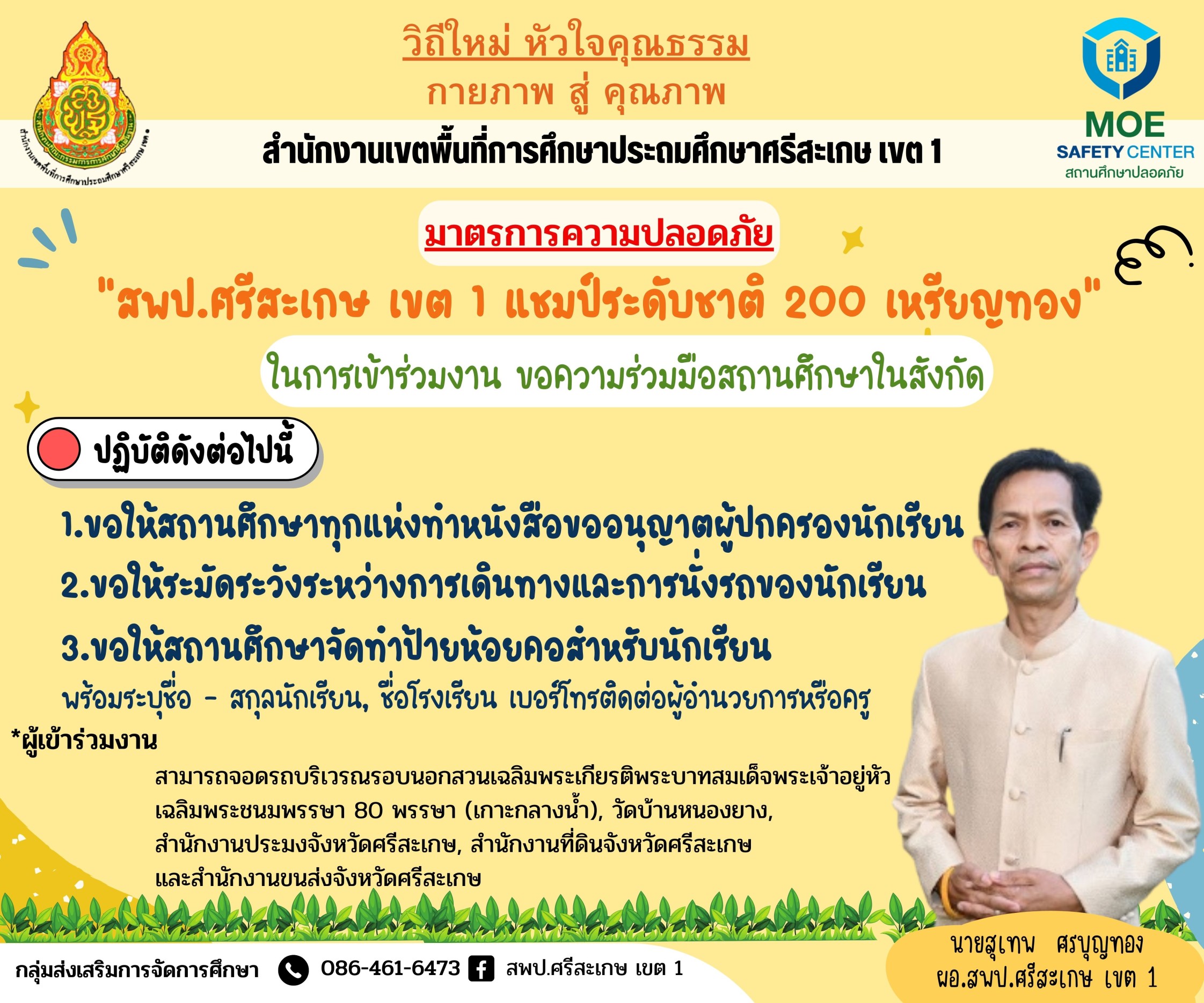 นายสุเทพ ศรบุญทอง ผอ.สพป.ศรีสะเกษ เขต 1 เปิดเผยต่อไปว่า เพื่อเป็นการแสดงความยินดีและเพื่อเป็นกำลังใจให้กับลูก ๆ น.ร.ในสังกัด สพป.ศรีสะเกษ เขต 1 ดังนั้น ตนจึงได้ร่วมกับ รอง ผอ.สพป.ศรีสะเกษ เขต 1 ผอ.ร.ร. คณะครู น.ร.ผู้ปกครอง น.ร.ทุกคน ร่วมกันจัดงาน “สพป.ศรีสะเกษ เขต 1 แชมป์ระดับชาติ 200 เหรียญทอง” งานศิลปหัตถกรรมนักเรียน ระดับชาติ ภาคตะวันออกเฉียงเหนือ ครั้งที่ 70 ปีการศึกษา 2565 ขึ้นในวันที่ 24 ก.พ. 66 ณ สวนเฉลิมพระเกียรติพระบาทสมเด็จพระเจ้าอยู่หัวเฉลิมพระชนมพรรษา 80 พรรษา (เกาะกลางน้ำ) จ.ศรีสะเกษ