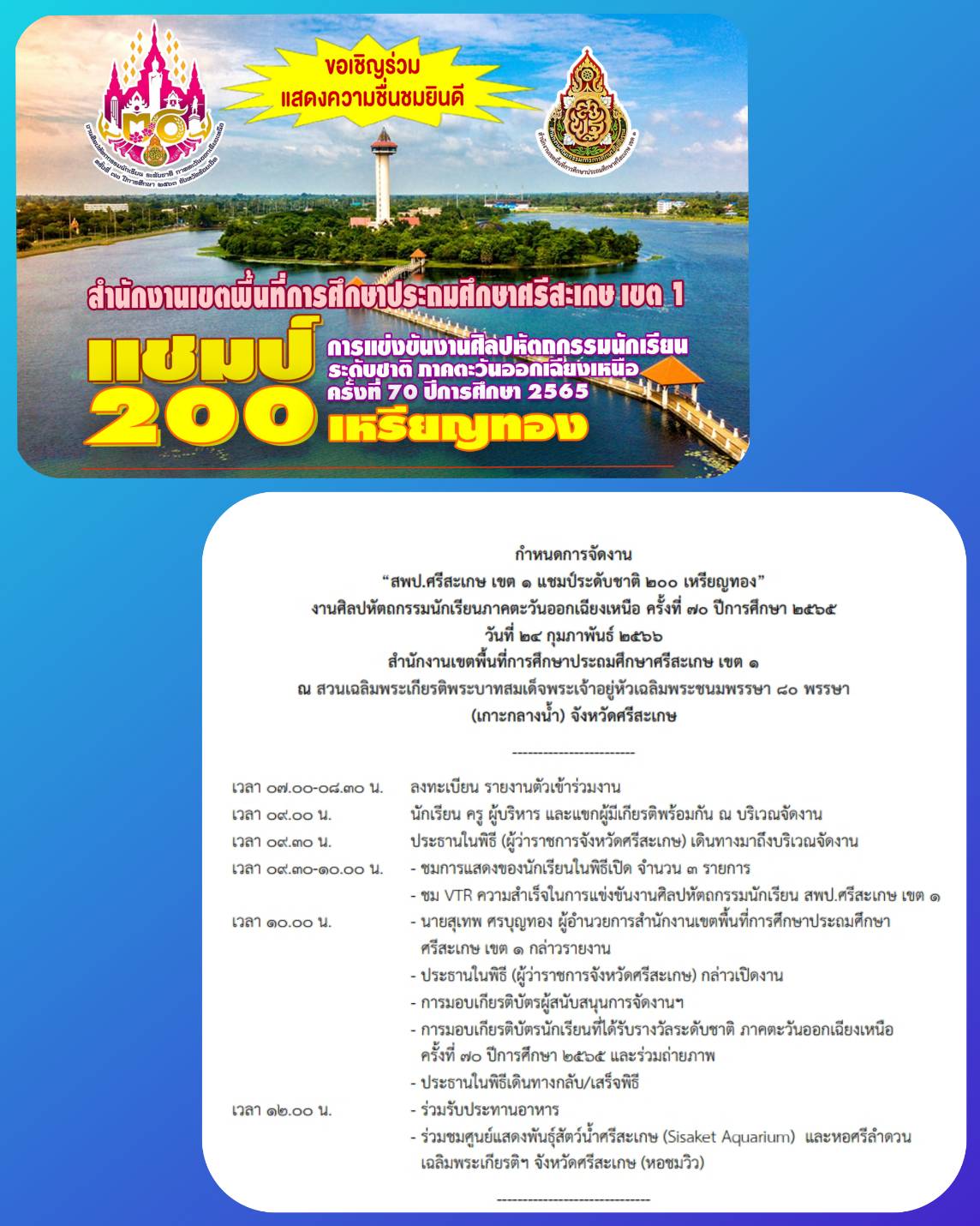 ซึ่ง สพป.ศรีสะเกษ เขต 1 ร่วมกับ กลุ่มโรงเรียนและศูนย์กลุ่มสาระการเรียนรู้ ได้ดำเนินการคัดเลือกนักเรียนตัวแทนของ สพป.ศรีสะเกษ เขต 1 เข้าร่วมการแข่งขันงานศิลปหัตถกรรมนักเรียน ระดับชาติ ภาคตะวันออกเฉียงเหนือ ครั้งที่ 70 ปีการศึกษา 2565 ระหว่างวันที่ 30 ม.ค. – 1 ก.พ. 66 ณ จ.ร้อยเอ็ด ผลการแข่งขันปรากฏว่า สพป.ศรีสะเกษ เขต 1 สามารถคว้าแชมป์ระดับชาติ ภาคตะวันออกเฉียงเหนือ ได้ 200 เหรียญทอง 36 เหรียญเงิน 20 เหรียญทองแดง ซึ่งสร้างความปลื้มปิติยินดีให้กับบุคลากรทางการศึกษาในสังกัด สพป.ศรีสะเกษ ทุกคนเป็นอย่างยิ่ง