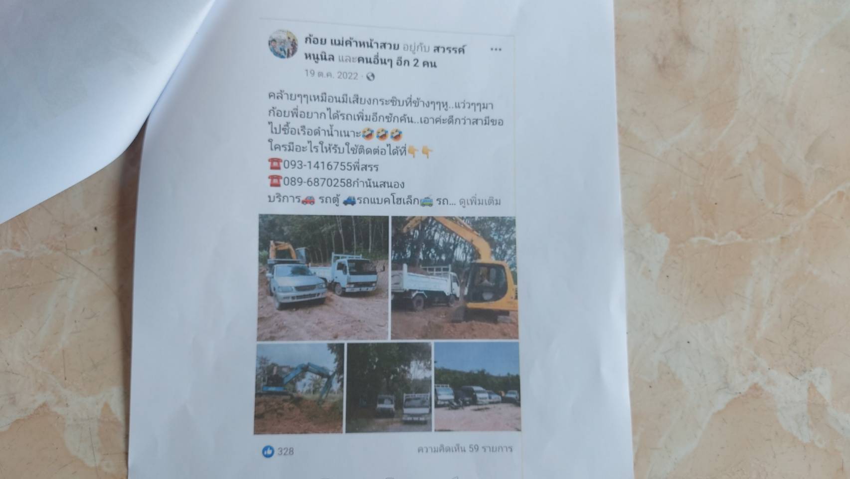 บริเวณเกิดเหตุพบรถแบคโฮ สีเหลือง ยี่ห้อ KOMATSU กำลังขุดตักดินใส่รถบรรทุกหกล้อ ยี่ห้อมิตซูบิชิ สีขาว ทะเบียน 8 3-0707 พิษณุโลก มีนายจิรวัตร ใบกุหลาบ อายุ 22 ปี เป็นคนขับ และรถบรรทุกหกล้อมิตซูบิชิ สีขาว ไม่ติดแผ่นป้ายทะเบียน ป้ายเสียภาษีระบุ ทะเบียน 81-0463 จอดรอใส่ดินเจ้าหน้าที่จึงตรวจสอบสอบถามคนขับรถแบคโฮ ชื่อนายเสกสรร ศรีรุ่งเรือง อายุ 39 ปี ให้การกับเจ้าหน้าที่ว่าตนเป็นเจ้าของรถแบคโฮ และรถบรรทุกหกล้อทั้ง 2 คัน ตนเป็นเจ้าของรถแบคโฮ และรถบรรทุกหกล้อทั้ง 2 คัน เข้า และออกไปขายให้กับชาวบ้านในเขตเทศบาลตำบลบ้านแยงคันละ 900 บาท