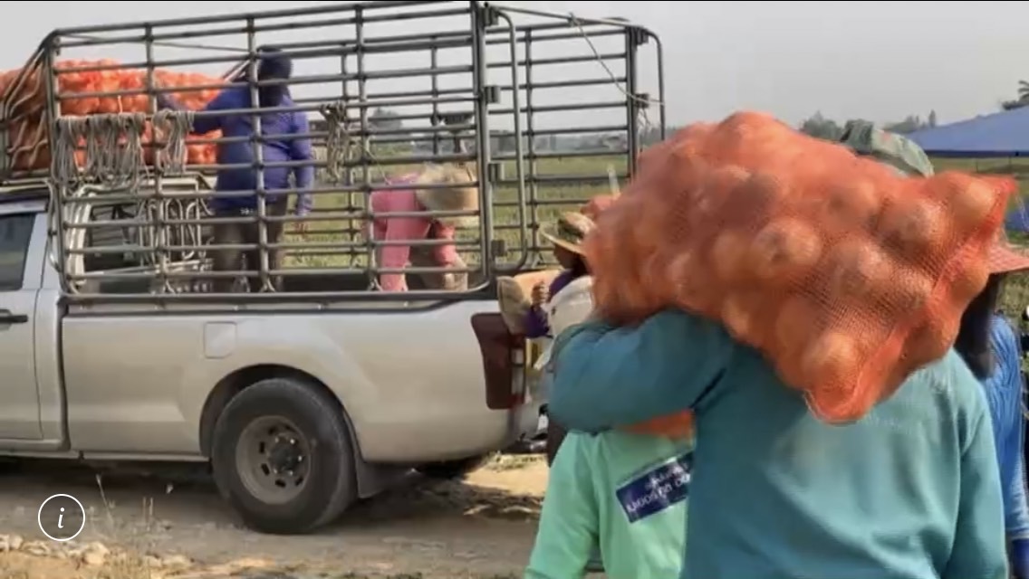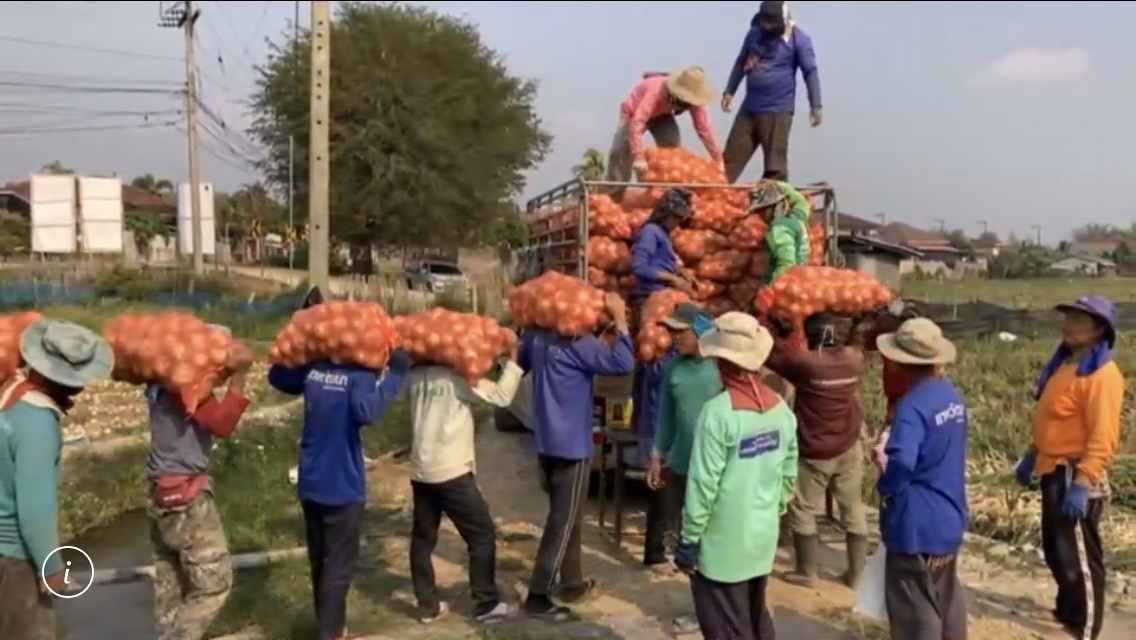 24 กุมภาพันธ์ 2566 เกษตรกรในพื้นที่อำเภอฝาง จังหวัดเชียงใหม่ ที่ปลูกหอมหัวใหญ่(หอมจีน) ที่ปลูกโดยภายใต้การควบคุมเมล็ดพันธ์จากทางสหกรณ์หอมหัวใหญ่ฝาง จำกัด นั้น ใช้เวลาปลูก130-150 วัน โดยจะหว่านเมล็ดให้ตันหอมงอกแล้วถึงนำแยกกอ มาปลูกในแปลงใหญ่ ซึ่งทั้งหมดจะใช้เวลาถึง 150 วัน ถึงจะเก็บเกี่ยวผลผลิตได้ วันนี้ที่บ้านเปียงกอก ตำบลโป่งน้ำร้อน อำเภอฝาง จังหวัดเชียงใหม่ ที่ไร่ของนางยุพิน หน่อวงค์ ที่มีที่ดินทำเกษตรมากถึง 70 กว่าไร่ ได้ทำการปลูกหอมหัวใหญ่ทั้งหมด วันนี้ได้จ้างคนงานโดยจ้างเหมาทั้งถอน ตัดใบ ขนขึ้นรถ ในราคาเหมาเป็นกิโลกรัมๆละ 50 สตางค์ จากการสอบถามผลผลิตออกมากกว่าทุกปีประมาณไร่ละ 6,000 กิโลกรัมถึง 8,000 กิโลกรัม เพราะลงหัวใหญ่มาก