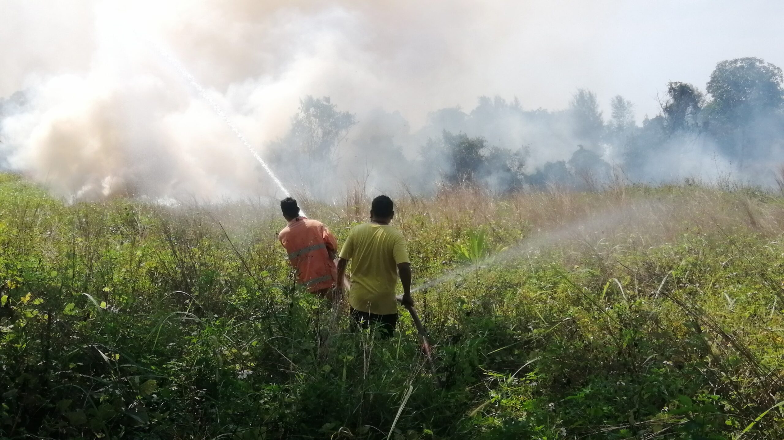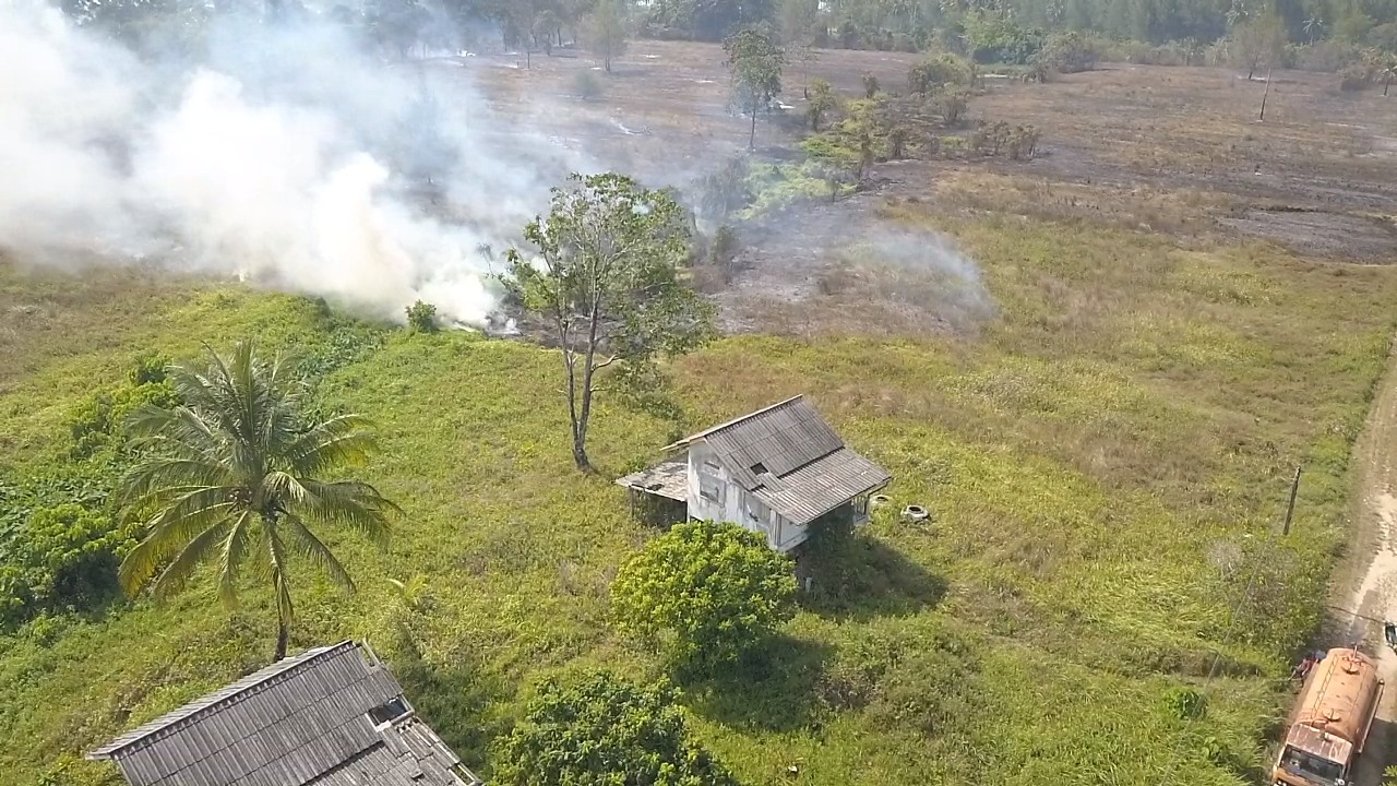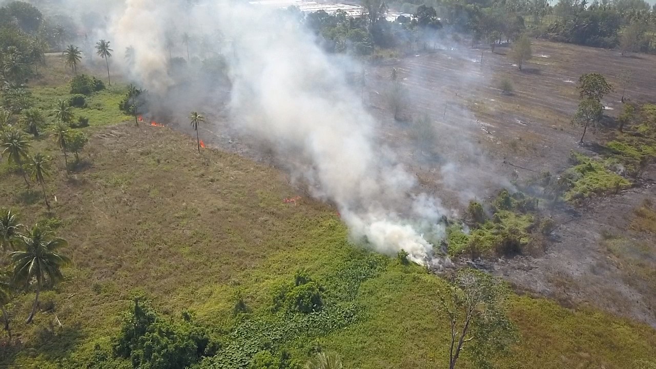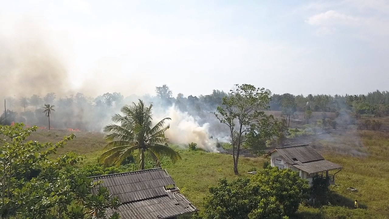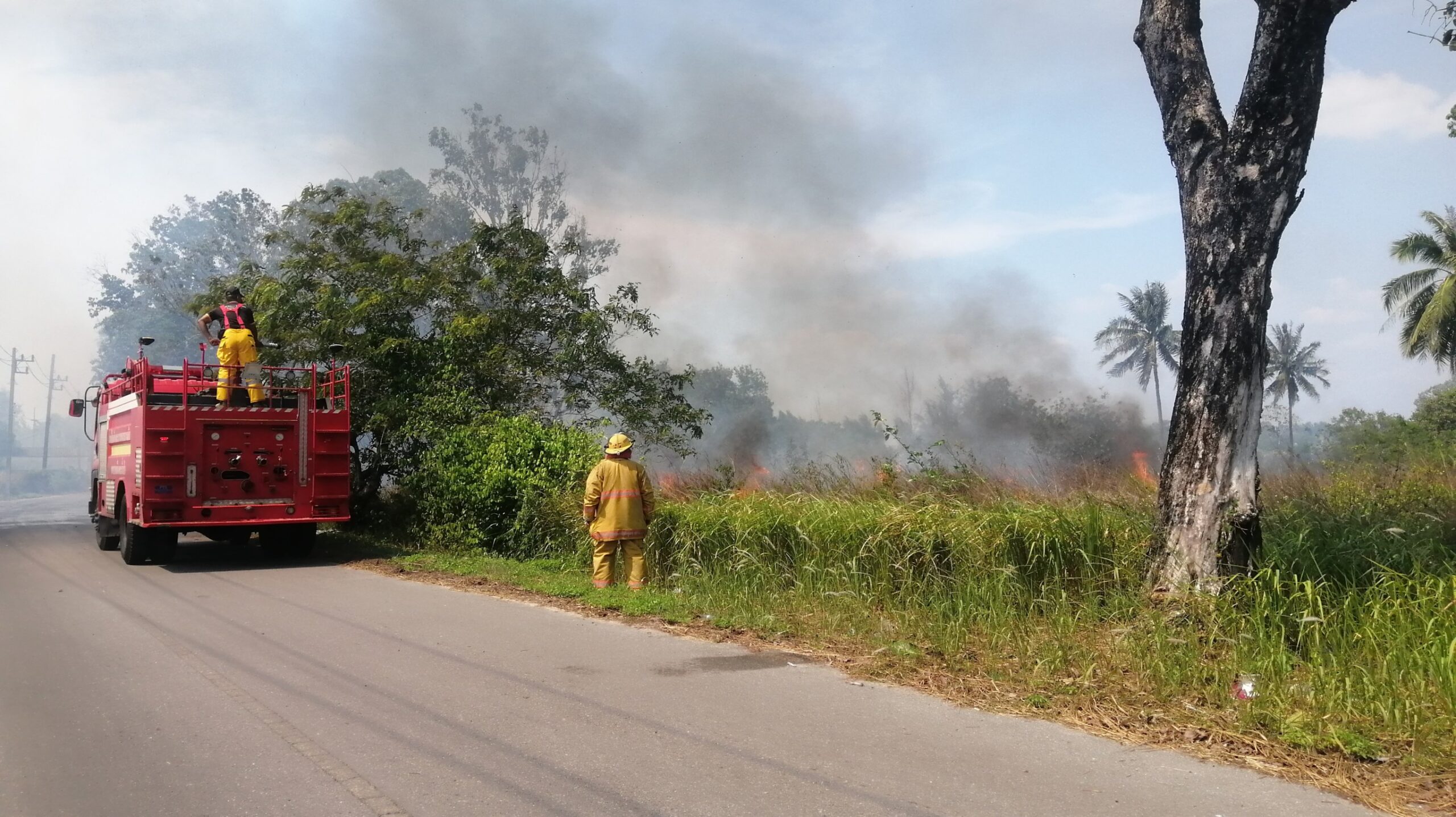 พังงา เจ้าหน้าที่ดับเพลิงเร่งควบคุมไฟไหม้หญ้าที่ดินรุกร้างกว่า 50 ไร่ ป้องกันลุกลามถึงบ้านประชาชนและโรงแรมทำให้เกิดกลุ่มควันไฟฟุ้งทั่วบริเวณ