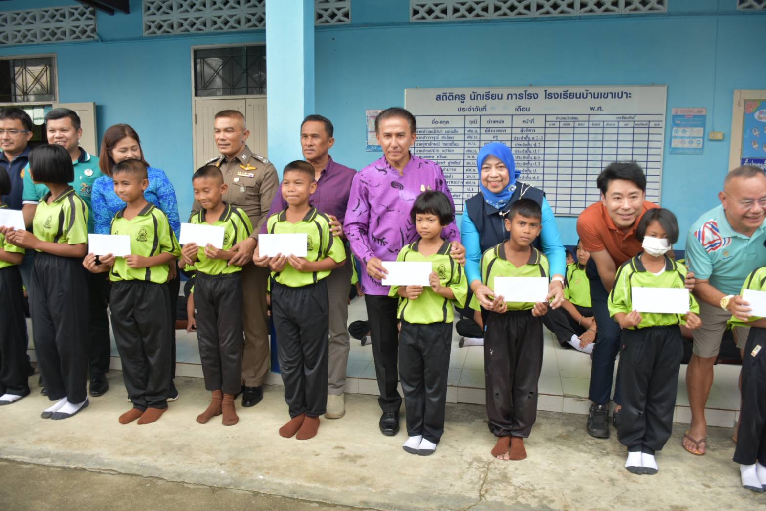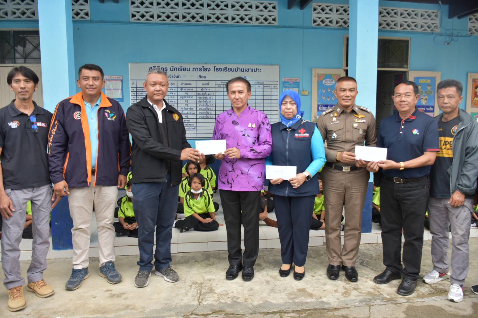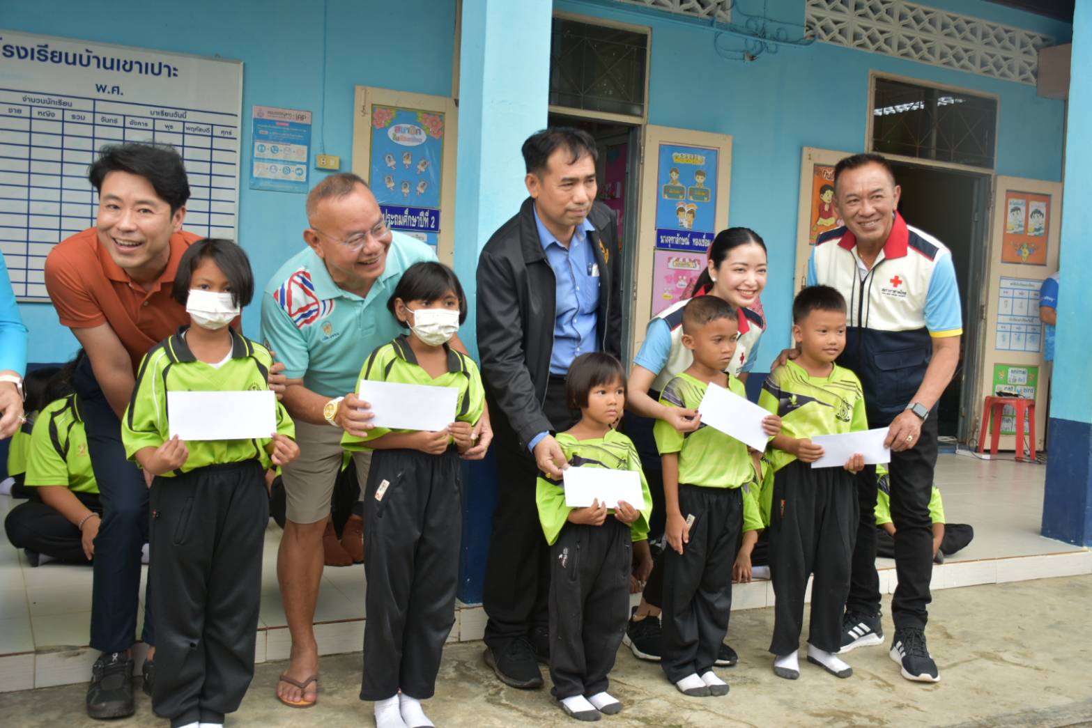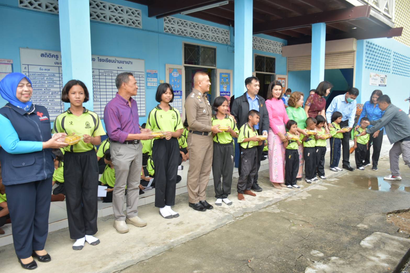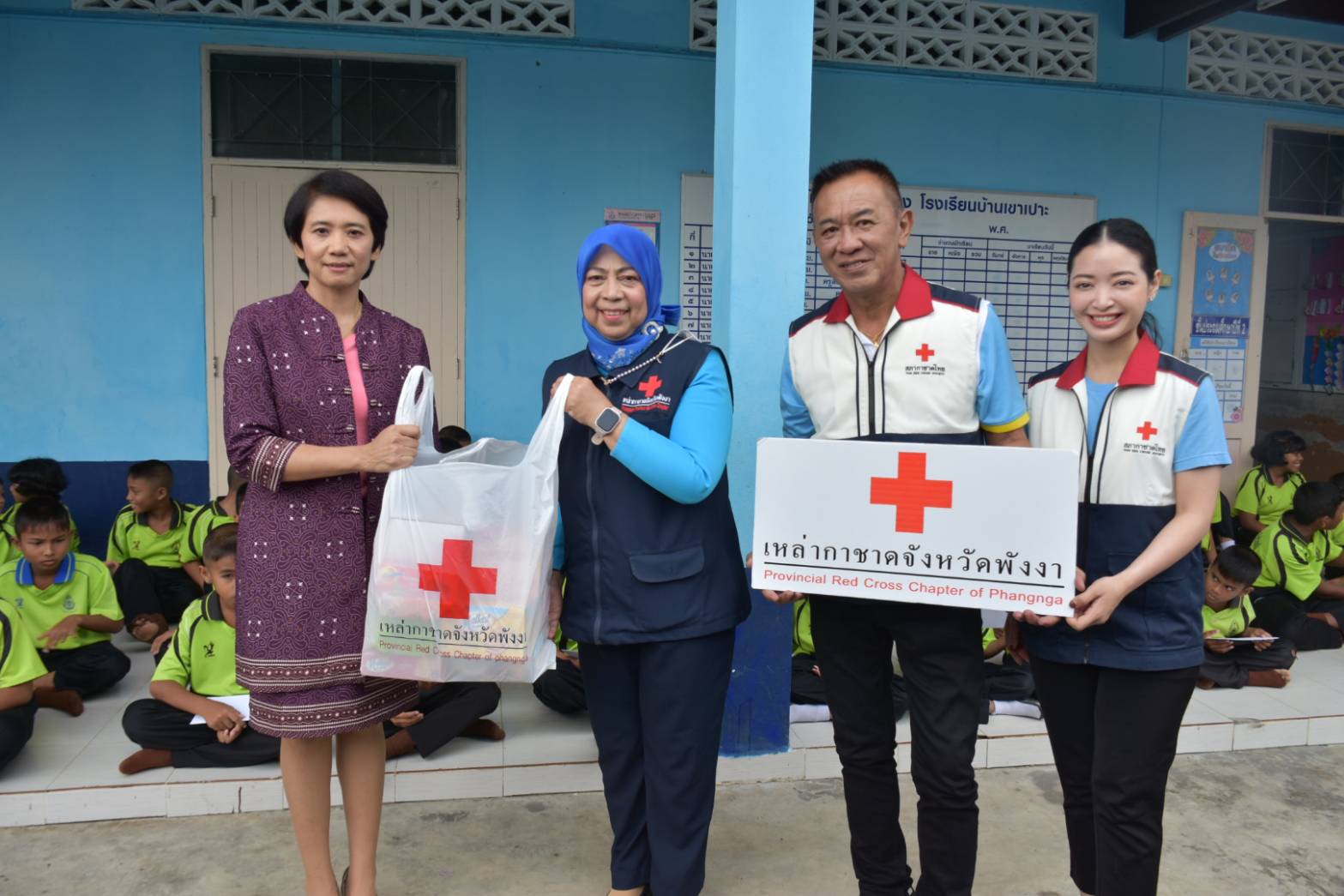 โดยมีนาวาตรีหญิงโนสมา หลีเส็น นายกเหล่ากาชาดจังหวัดพังงา พล.ต.ต.ณฐกรญ์ กาญจนาภรณ์ ผบก.ภ.จว.พังงา นายพิชญพัทธ์ เรืองชาตรี นายอำเภอตะกั่วทุ่ง นายนันท์ สังข์ชุม ศึกษาธิการจังหวัดพังงา ผู้นำท้องถิ่นท้องที่ และภาคีเครือข่าย เข้าร่วมกิจกรรม และนางสาวอณัชฌา เดชเส้ง ผู้อำนวยการโรงเรียนเขาเปาะ นำคณะครู นักเรียน ร่วมให้การต้อนรับ