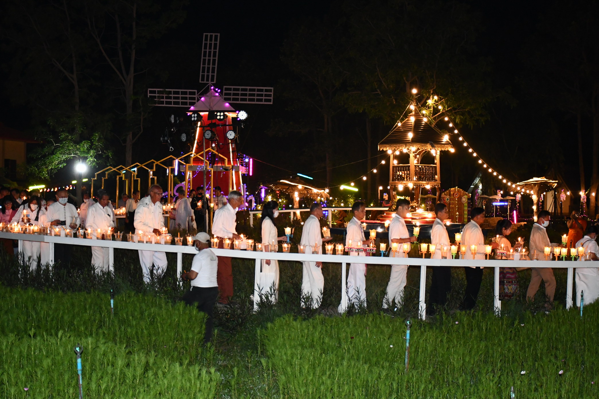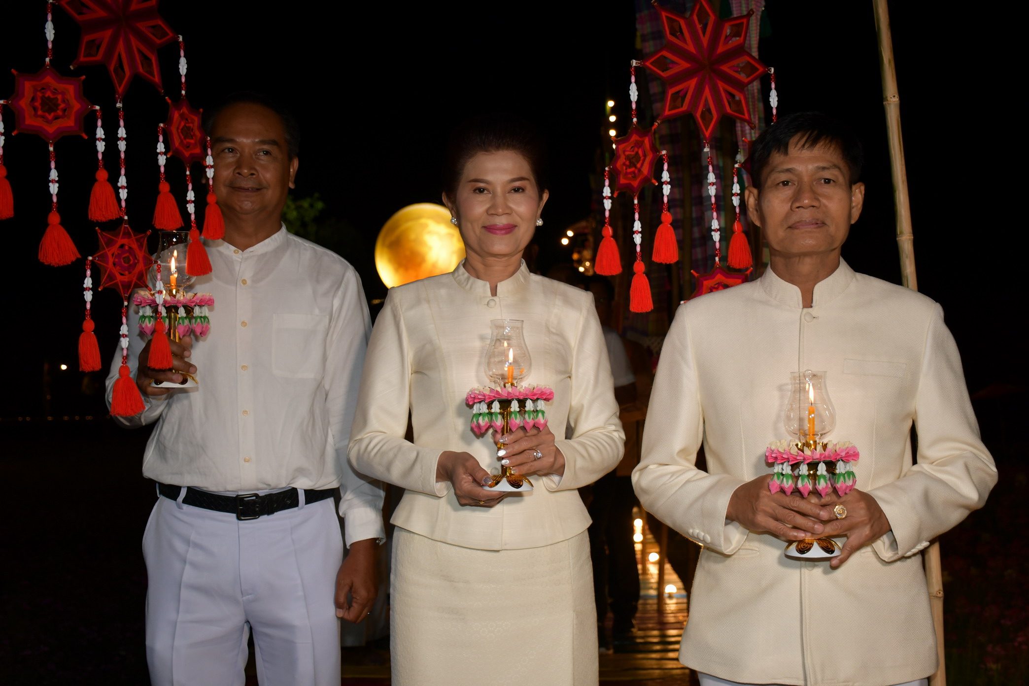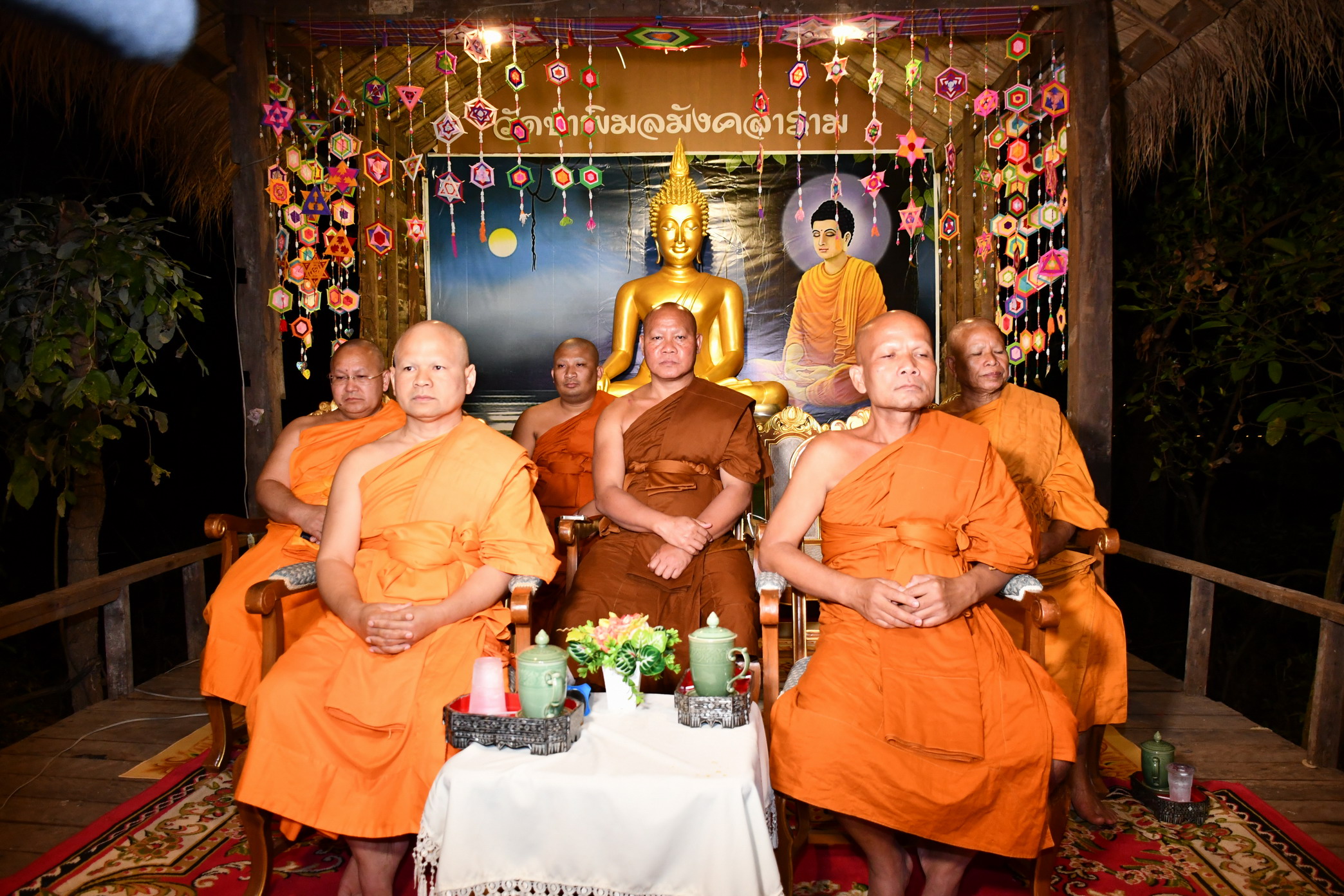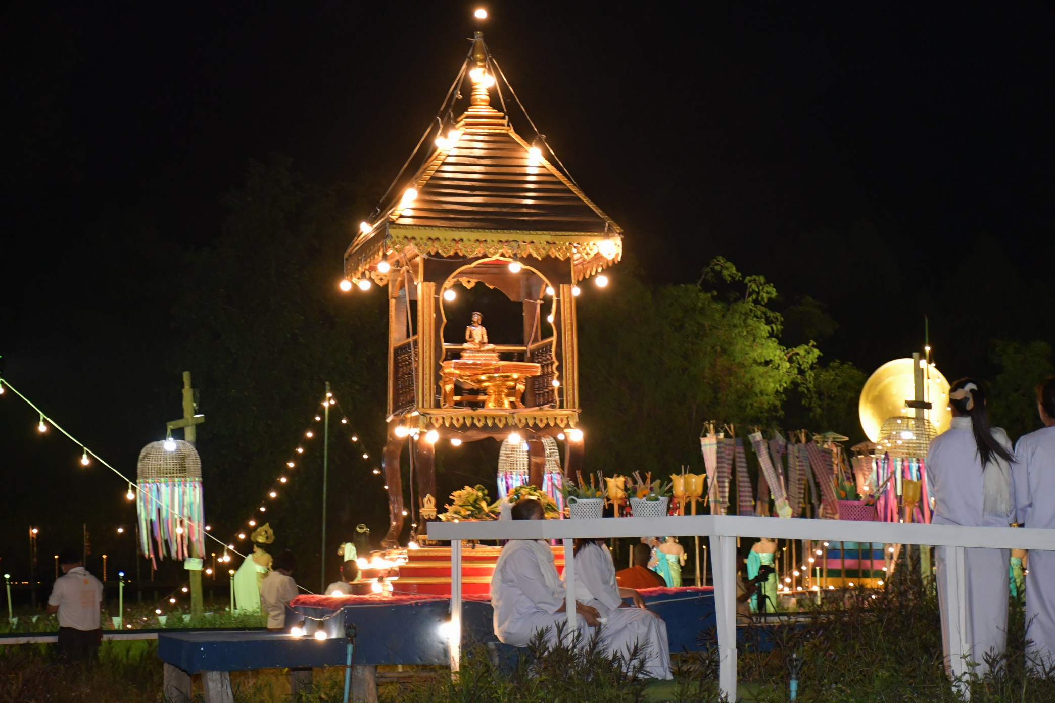 ต่อมา นายสำรวย เกษกุล ผวจ.ศรีสะเกษ พร้อมด้วย นางมัลลิกา เกษกุล นายกเหล่ากาชาดศรีสะเกษ ได้เดินทางมาถึงบริเวณพิธี และได้มีการประกอบพิธี เพ็ญมาฆมาสตักบาตรใต้แสงจันทร์ โดยนำชาวพุทธที่มาร่วมพิธีจำนวนมากกล่าวปฏิญาณตนเป็นพุทธมามกะ จากนั้น ได้นำชาวพุทธที่พากันนุ่งขาวห่มขาวได้นำเอาดอกไม้และปัจจัยมาประกอบพิธีตักบาตรใต้แสงจันทร์ โดยทำบุญใส่บาตรพระเณร จำนวน 109 รูป เพื่อบูชาพระรัตนตรัย โดยการใส่บาตรเพื่อปันสุขให้กับเพื่อนมนุษย์ เมื่อทำบุญตักบาตรเสร็จแล้ว พระศรีญาณวิเทศ ได้นำคณะสงฆ์และชาวพุทธทุกคนประกอบพิธีเวียนเทียนโดยเดินเวียนเทียนไปตามสะพานไม้สายรุ้งที่ทอดยาวลงไปตามแนวริมฝั่งลำห้วยสำราญ ซึ่งมีการปักตะเกียงเอาไว้ตลอดเส้นทาง เดินเวียนเทียนบริเวณวัด จากนั้น นำเทียนมาปักบนราวไม้รอบที่ประดิษฐานของพระอุปคุต ซึ่งมีการตกแต่งสถานที่อย่างยิ่งใหญ่สวยงาม แสงสีเสียง ตระการตาเป็นอย่างมาก