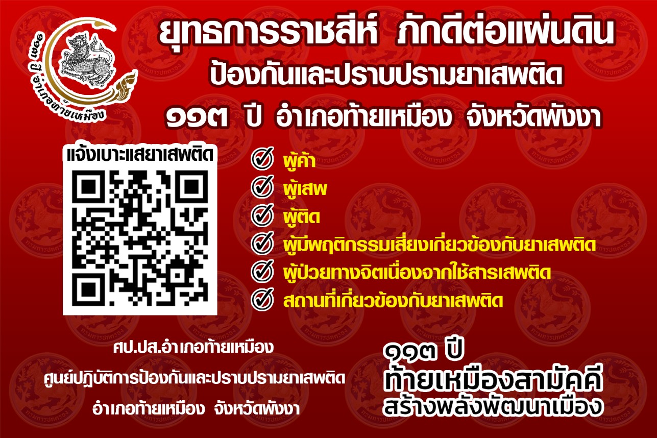 โดยสามารถแจ้งเบาะแสผู้ที่เกี่ยวข้องกับยาเสพติดไม่ว่าจะเกี่ยวข้องกับ ผู้ค้า ผู้เสพ ผู้ติด ผู้ที่ผ่านการบำบัด ผู้ที่มีอาการทางจิตอันเนื่องมาจากการใช้สารเสพติด และสถานที่ที่เกี่ยวข้องยาเสพติด โดยการแจ้งข้อมูลผ่านการสเกล ผ่าน QR CORD เพื่อส่งต่อข้อมูลไปยัง ศป ปส อ ท้ายเหมือง ในการเข้าแก้ไขปัญหาตามแนวทางที่กำหนดได้อย่างรวดเร็วยิ่งขึ้น