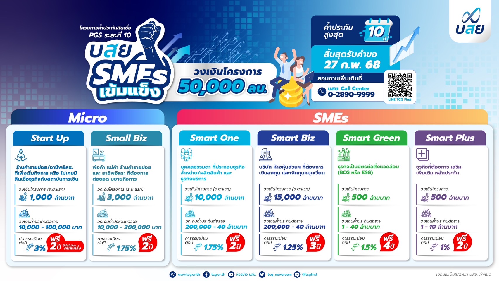โครงการ “บสย. SMEs เข้มแข็ง” (PGS 10) เป็นโครงการต่อเนื่อง 2 ปี ซึ่งจะสิ้นสุดวันรับคำขอ ในวันที่ 27 กุมภาพันธ์ 2568 จะเป็นกลไกขับเคลื่อนเศรษฐกิจที่สำคัญ ช่วยผู้ประกอบการ SMEs เข้าถึงแหล่งทุน ที่จะสร้างผลประโยชน์ทางเศรษฐกิจได้มากกว่า 200,000 ล้านบาท รักษาการจ้างงานกว่า 700,000 อัตรา ผู้ประกอบการ SMEs สามารถลงทะเบียน บริการรับคำปรึกษา ตรวจสุขภาพทางการเงินฟรี ผ่านช่องทาง Line TCG First (@tcgfirst)