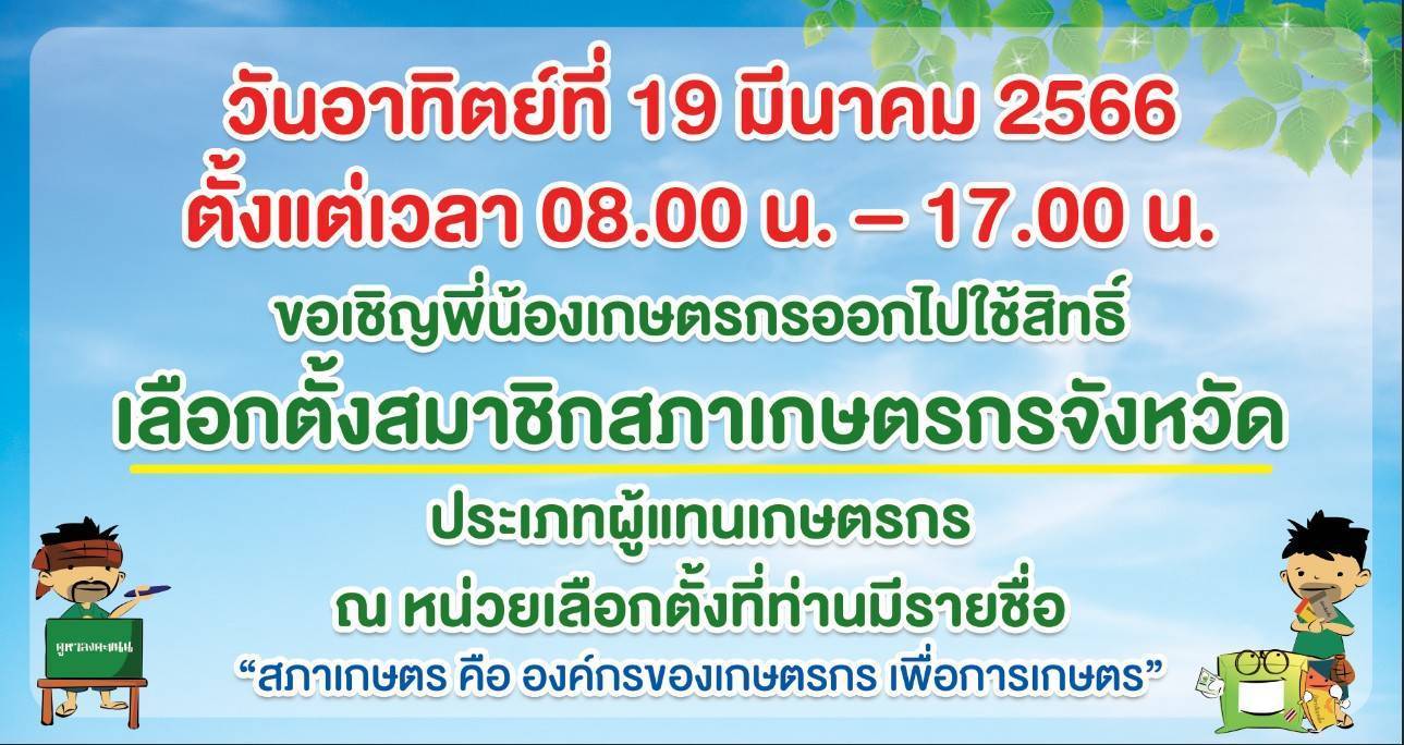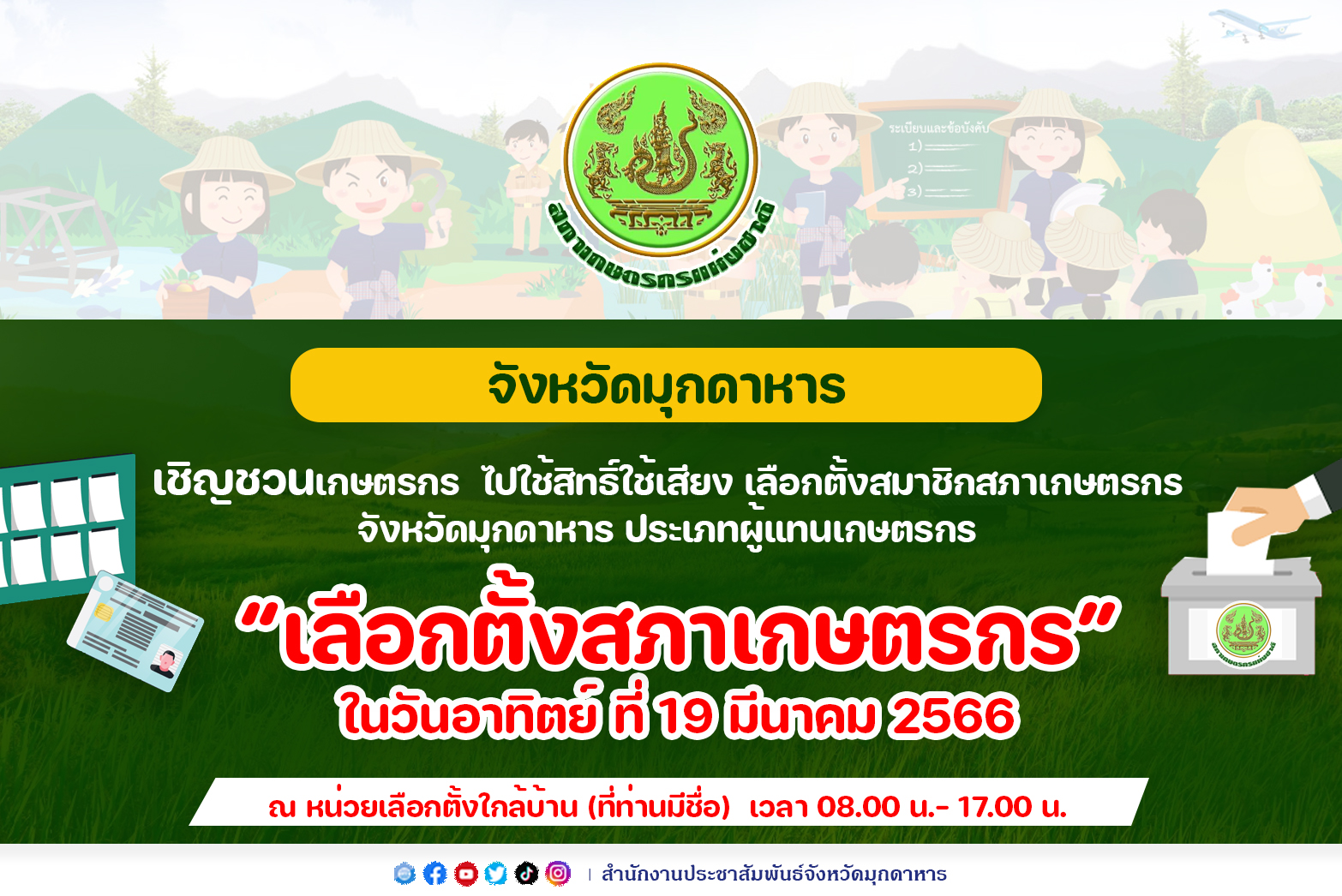 จังหวัดมุกดาหารเชิญชวนผู้มีสิทธิเลือกตั้งสมาชิกสภาเกษตรกรจังหวัดมุกดาหาร วันที่ 19 มีนาคมนี้