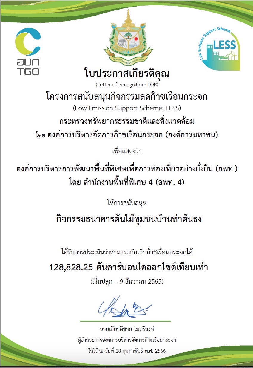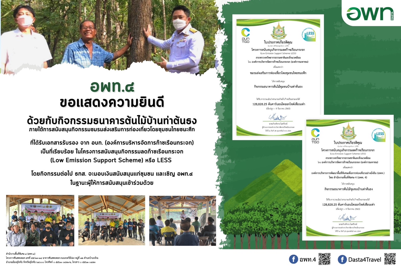 ทั้งนี้ เมื่อวันที่ ๒๘ กุมภาพันธ์ ๒๕๖๖ สำนักงานพื้นที่พิเศษ ๔ (อพท.๔) ผ่านการรับรองตามมาตรฐานและได้รับใบประกาศเกียรติคุณจากโครงการสนับสนุนกิจกรรมลดก๊าซเรือนกระจก หรือ LESS (Low Emission Support Scheme) จากการจัดกิจกรรมพัฒนาเส้นทาง BCG คาร์บอนเครดิต พื้นที่ชมรมส่งเสริมการท่องเที่ยวโดยชุมชนไทยชนะศึก ณ ป่าชุมชนท่าต้นธง ตำบลไทยชนะศึก อำเภอทุ่งเสลี่ยม จังหวัดสุโขทัย ส่งเสริมธนาคารต้นไม้ชุมชนบ้านท่าต้นธง รวบรวมข้อมูลกักเก็บคาร์บอนไดออกไซด์ จากพื้นที่ ๓,๘๐๐ ไร่ และความสามารถในการกักเก็บคาร์บอนไดออกไซด์ได้กว่า ๑๒๘,๘๒๘.๒๕ ตันคาร์บอนไดออกไซด์เทียบเท่า ซึ่งธนาคารต้นไม้ชุมชนบ้านท่าต้นธง ได้รางวัลในครั้งนี้ ถือเป็นครั้งแรกในจังหวัดสุโขทัยและได้เป็นอันดับ ๒ ของประเทศในปี ๒๕๖๖ จากการวัดค่าเฉพาะไม้ป่าหรือไม้ยืนต้น อาทิ ต้นอ้อยช้าง ต้นเต็ง ต้นมะค่า เพื่อสร้างป่า ที่สามารถกักเก็บค่าบอนไดออกไซด์ได้จริงและมีประสิทธิภาพ สะท้อนให้เห็นว่าบ้านท่าต้นธงสามารถฟื้นคืนป่ากลับมาได้สำเร็จอย่างยั่งยืน จากอดีตที่เคยแห้งแล้ง ชาวบ้านส่วนใหญ่ซึ่งมีอาชีพทำไร่ ทำนา กลับกลายเป็นผืนป่าต้นน้ำที่ชุ่มชื้น ได้สร้างอาชีพ สร้างรายได้ และสร้างการรักความสามัคคีและอนุรักษ์ป่าให้กลับคืนมา ส่งต่อให้ลูกหลานต่อไป