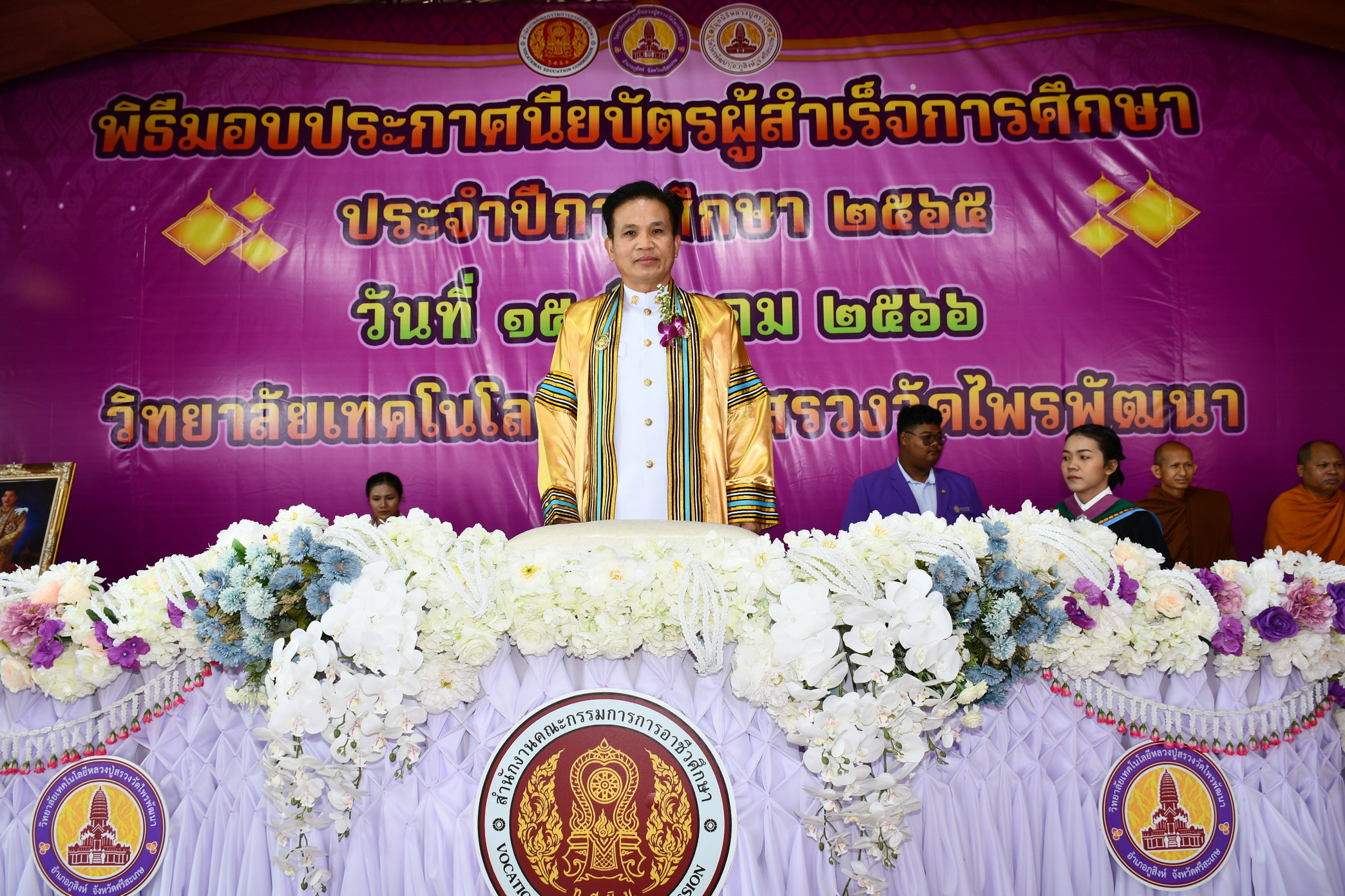 เมื่อวันที่ 15 มี.ค. 66 ผู้สื่อข่าวรายงานว่า ที่วิทยาลัยเทคโนโลยีหลวงปู่สรวงวัดไพรพัฒนา ต.ไพรพัฒนา อ.ภูสิงห์ จ.ศรีสะเกษ ดร.ณัฐวิชญ์ ศิริรัชฎานันท์ ผอ.สำนักงานอาชีวศึกษาจังหวัดศรีสะเกษได้เดินทางไปเป็นประธานในพิธีมอบประกาศนียบัตรแก่ผู้สำเร็จการศึกษาประจำปีการศึกษา 2565 ของวิทยาลัยเทคโนโลยีหลวงปู่สรวงวัดไพรพัฒนา ซึ่งพระครูโกศลสิกขกิจ หรือหลวงพ่อพุฒ วายาโม ประธานมูลนิธิหลวงปู่สรวงเจ้าคณะอำเภอภูสิงห์ (ธ.) และเจ้าอาวาสวัดไพรพัฒนา ในฐานะผู้รับใบอนุญาตจัดตั้งวิทยาลัยเทคโนโลยีหลวงปู่สรวงวัดไพรพัฒนา ได้นำคณะครู นักเรียน ร่วมกันจัดพิธีนี้ขึ้น โดยมีผู้สำเร็จการศึกษาประจำปีการศึกษา 2565 รวมทั้งสิ้น 151 คน แยกเป็นระดับ ปวช.(ประกาศนียบัตรวิชาชีพ) จำนวน 111 คน ระดับ ปวส. (ประกาศนียบัตรวิชาชีพชั้นสูง) จำนวน 40 คน