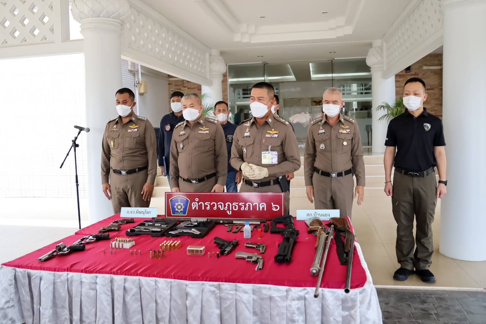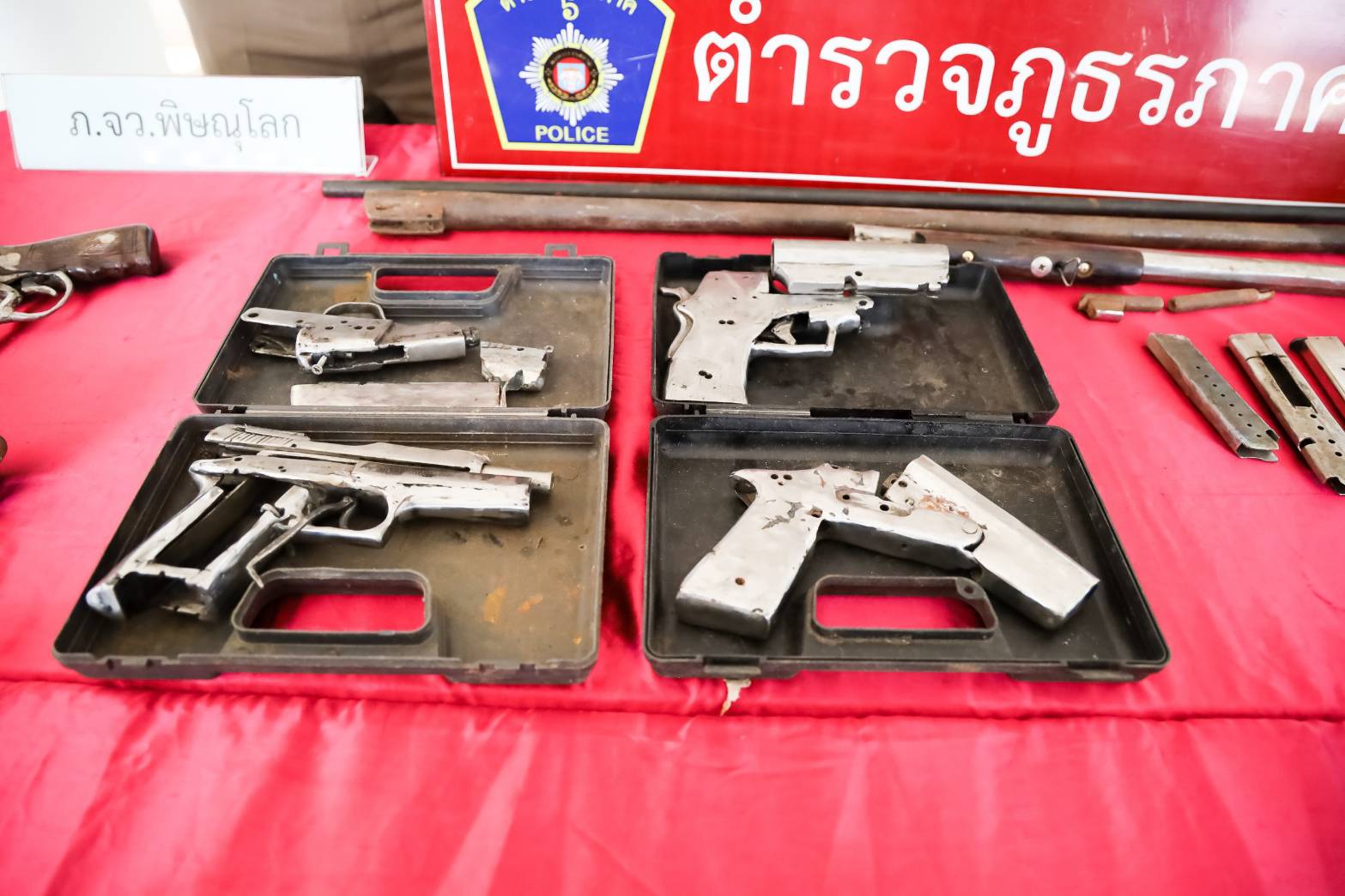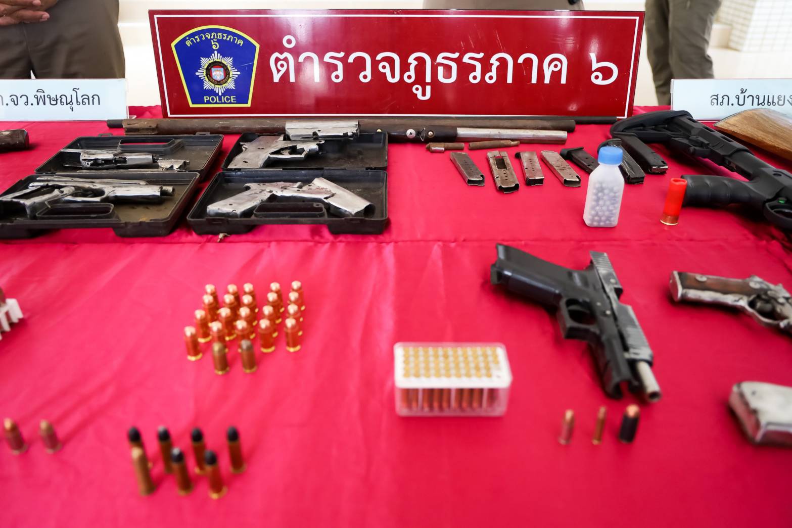 1.อาวุธปืนสั้นลูกโม่ ขนาด .357 จำนวน 1 กระบอก 2.อาวุธปืนสั้นไทยประดิษฐ์ขนาด 9 มม. จำนวน 1 กระบอก 3.อาวุธปืนสั้นไทยประดิษฐ์ จำนวน 1 กระบอก 4.อาวุธปืนสั้นไทยประดิษฐ์ จำนวน 1 กระบอก
