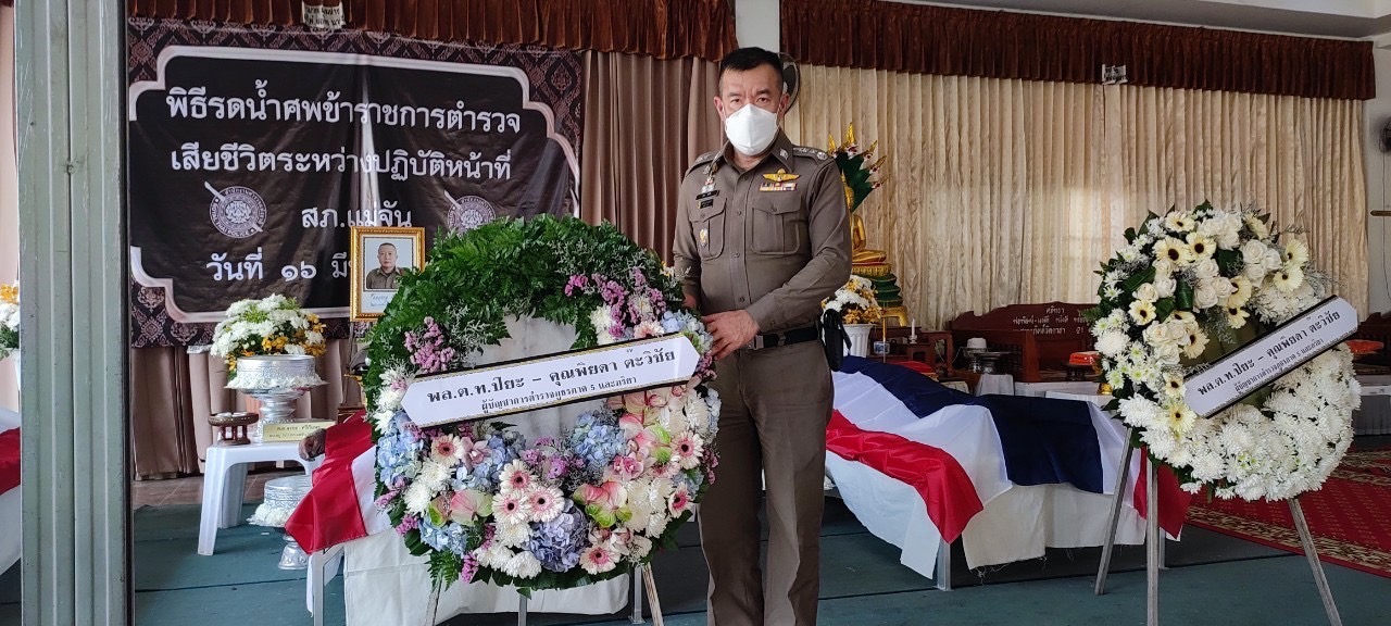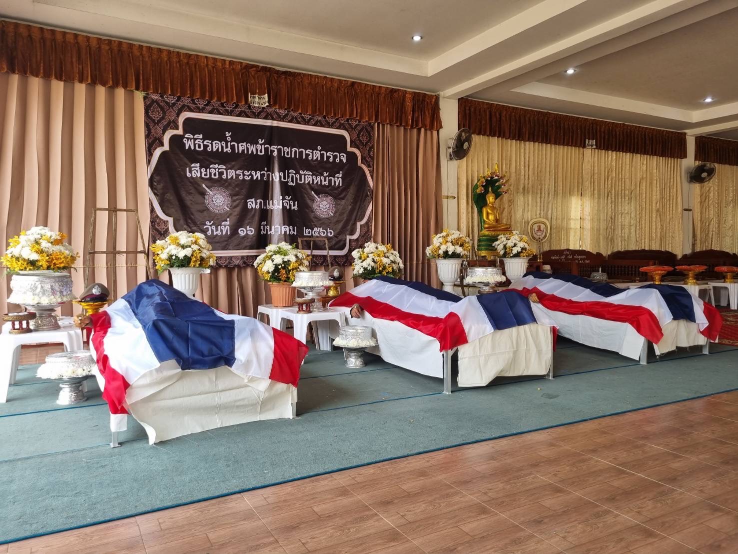 วันที่ 16 มีนาคม 2566 เวลา 14.30 น. พล.ต.ท.ปิยะ ต๊ะวิชัย ผบช.ภ5 ได้เป็นประธานในพิธีรดน้ำศพให้กับข้าราชการตำรวจประกอบ ด้วย ด.ต.เรืองฤทธิ์ ธุวะคำ ผบ.หมู่ (ป)สภ.แม่จัน , ด.ต.พิชยพล จันทร์ต๊ะ ผบ.หมู่ (ป) สภ.แม่จัน และ ด.ต.จงกล ศรีกันทะ ผบ.หมู่ (ป)สภ.แม่จัน ซึ่งทั้งสามนายได้เสียชีวิตในระหว่างการปฏิบัติหน้าที่ เมื่อวันที่ 15 มีนาคม 2566 ณ วัดกาสา อ.แม่จัน จ.เชียงราย