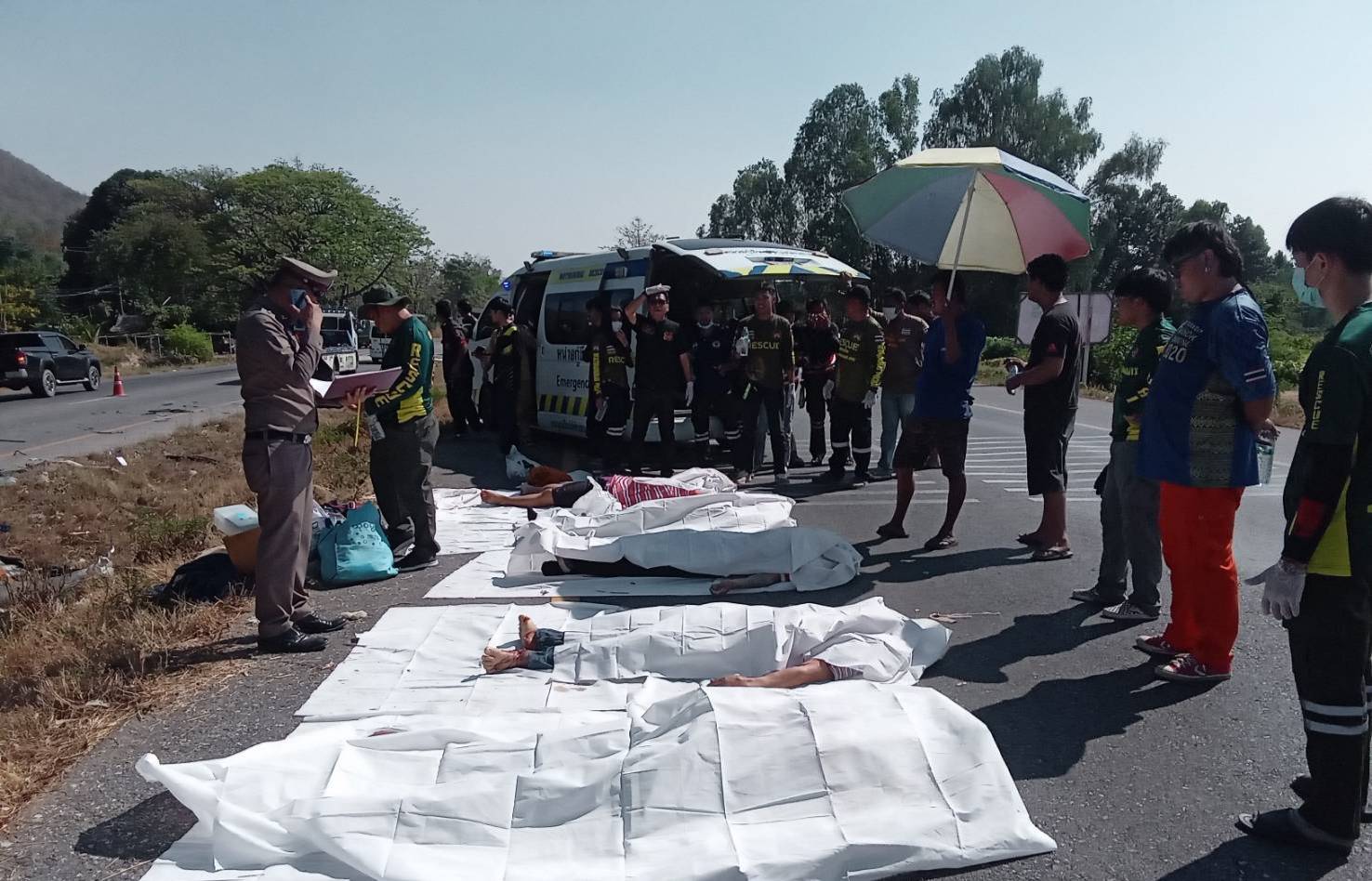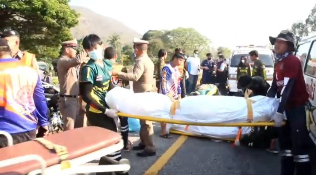 ในที่เกิดเหตุ พบเจ้าหน้าที่สมาคมกู้ภัยวัดหมอนไม้ กำลังนำอุปกรณ์เครื่องตัดถ่าง เพื่อนำร่างของผู้เสียชีวิต และบาดเจ็บออกจากรถยนต์แบบ 7 ที่นั่ง ซึ่งมีผู้เสียชีวิตทั้งหมด 5 ราย 1. นายสมชาย รักษา อายุ 62 ปี ที่อยู่ 124/1 หมู่ 1 ต.เวียง อ.พร้าว จ.เชียงใหม่ 2. นายธวัชชัย เจริญพัฒนกุล อายุ 60 ปี อยู่ที่ 92 หมู่ 5 ต.เวียง .อ พร้าว จ.เชียงใหม่ 3. นายณรงชัย อินธิยา 4. นายนวะพัฒน์ บัวเจนธรรม 5. นายฉลอง นาถ้ำ อายุ 64 ปี ที่อยู่ 54 หมู่ 5 ต.เวียง อ.พร้าว จ.เชียงใหม่ และผู้บาดเจ็บ 1 ราย พระครูโสภณ กิตติญาณ วัดหนองอ้อ ต.เวียง อ.พร้าว เบื้องต้นคาดว่าทั้งหมดน่าจะเป็นญาติพี่น้องกัน และมีภูมิลำเนาอยู่ที่ อ.พร้าว จ.เชียงใหม่ ขณะที่ผู้บาดเจ็บอีก 2 รายคือ เป็นผู้ขับขี่รถบรรทุก 6 ล้อ ชื่อ นายประสิทธ์ นินสิงห์ขร อายุ 36 ปี ที่อยู่ 276 หมู่ 1 ต.ตลาดโพธิ์ อ.ลำปลายมาศ จ.บุรีรัมย์ และนางวันนิดา บุตประลาด ภรรยา นำตัวส่งโรงพยาบาลพิชัย