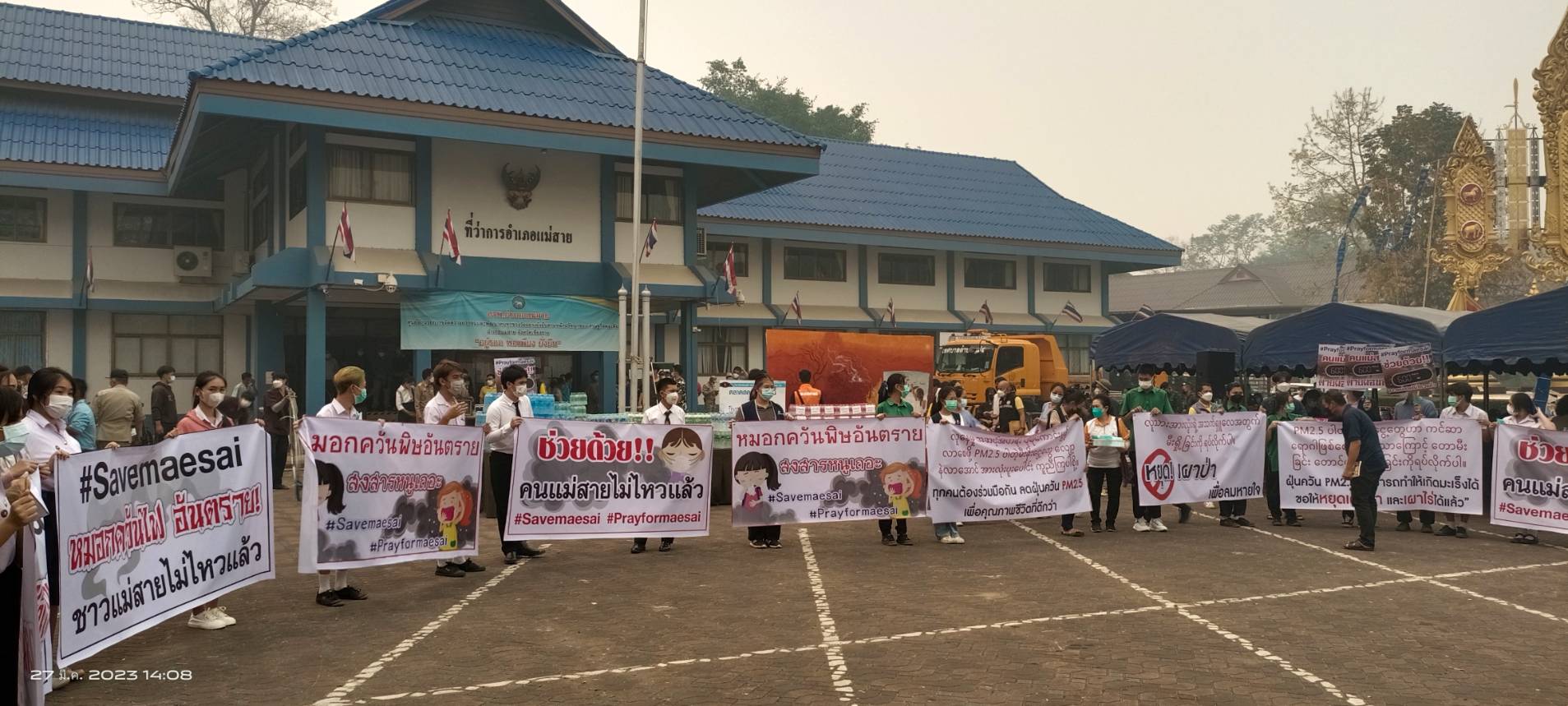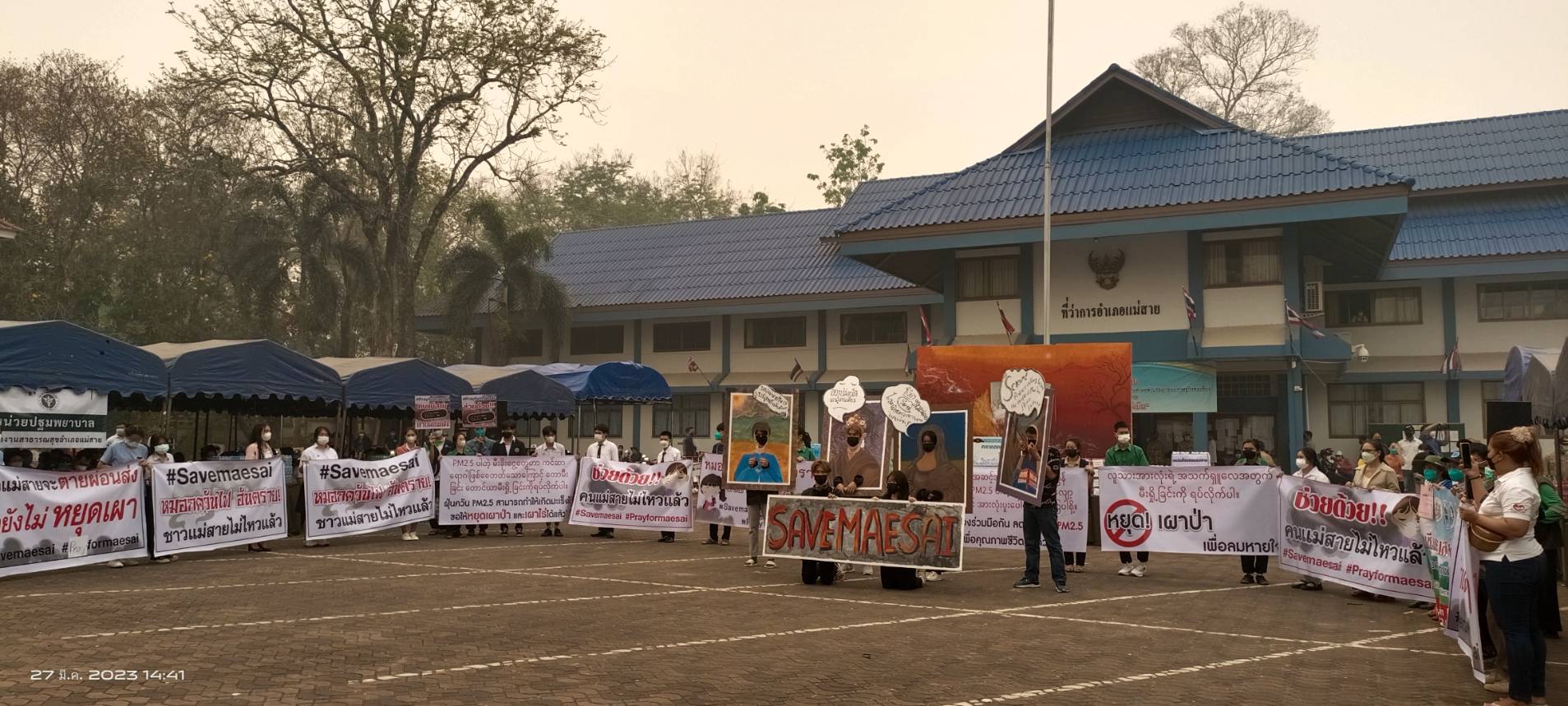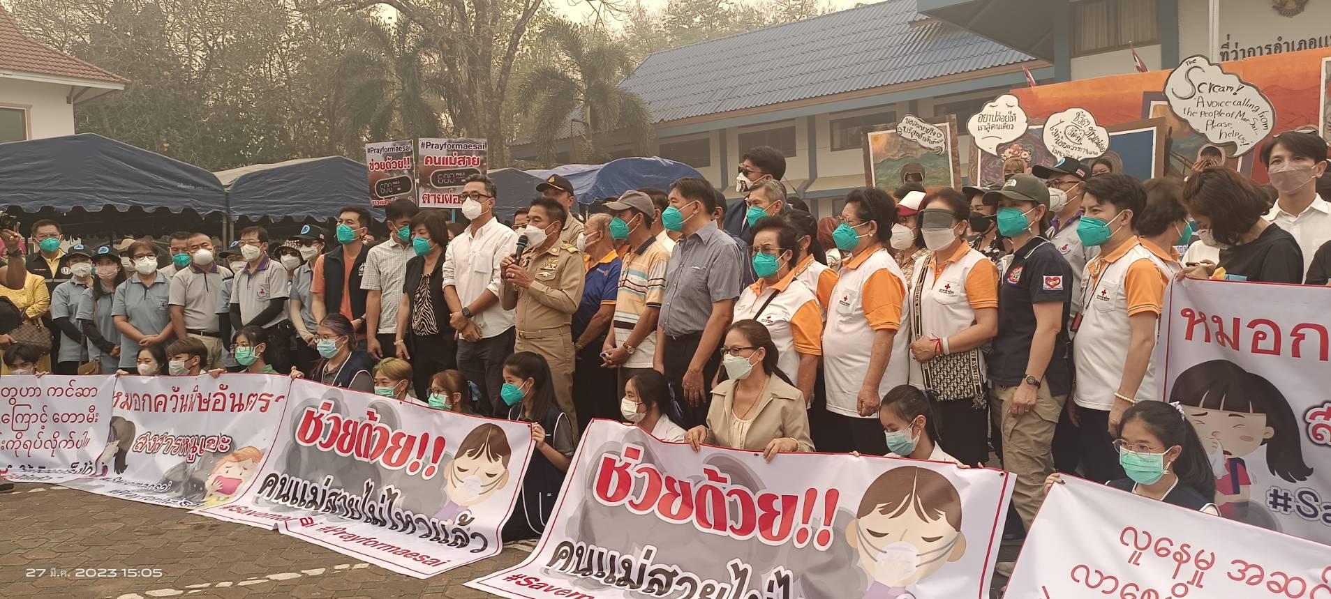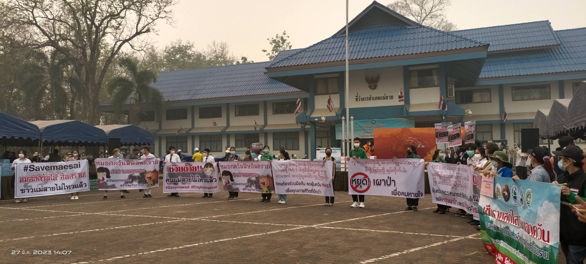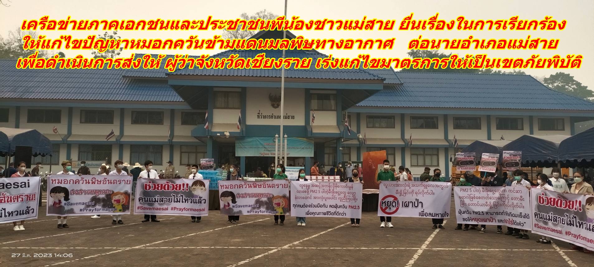 วันนี้ 27 มี.ค. เวลา 14.00 น. ณ ที่ลานหน้าที่ว่าการ อ.แม่สาย จ.เชียงราย กลุ่มพลังมวลชนเครือข่ายภาคเอกชนและพีน้องประชาชน นักเรียนนักศึกษาในเขตพื้นที่ อ.แม่สาย ประมาณกว่า 300 คน โดยมีนายเศวตยนต์ ศรีสมุทร รองประธานหอการค้า จ.เชียงราย นายรชต ไชยวรรณ์ และนายนายตระสัก ศรีธิพรรณ์ ตัวแทนเครือข่ายฯ ได้รวมตัวกันเพื่อจัดกิจกรรมเรียกร้องให้แก้ไขไฟป่าและหมอกควันข้ามแดน ซึ่งมีการรับบริจาคอุปกรณ์ น้ำดื่ม ฯลฯ เพื่อนำไปช่วยเหลือเจ้าหน้าที่ดับไฟป่าในพื้นที่และยื่นหนังสือข้อเรียกร้องต่อนายณรงค์พล คิดอ่าน นายอำเภอแม่สาย เพื่อให้แก้ไขปัญหาทั้งในระยะสั้นและระยะยาวคือเจรจาหารือกับประเทศเพื่อนบ้าน ผลักดันให้เป็นวาระของอาเซียน รวมผลักดันให้ภาคเอกชนที่ไปส่งเสริมทำการเกษตรได้แก้ไขปัญหาเพื่อลดการเผาป่าจนเกิดเป็นฝุ่นละอองหมอกควันมลพิษทางอากาศข้ามมายังฝั่งไทยหนาแน่นในช่วงฤดูการเผาเศษวัชพืชและการเผาป่าของ 2 ประเทศเพื่อนบ้านเรา ที่สร้างปัญหาได้รับผลกระทบสะสมมานานนับ 13 ปี ที่ผ่านมา