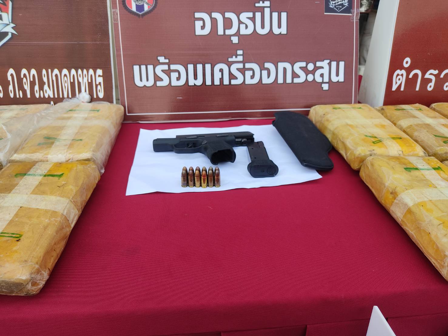 ตำรวจภูธรมุกดาหารจับกุม 2 ผู้ต้องหาพร้อมยาบ้าเกือบล้านเม็ด และอาวุธปืน