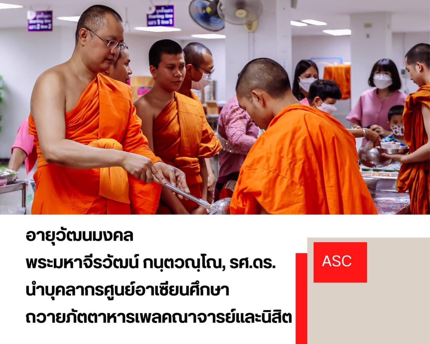 เนื่องในโอกาสอายุวัฒนมงคล พระมหาจีรวัฒน์ กนฺตวณฺโณ, รศ.ดร. , ผู้รักษาการผู้อำนวยการศูนย์อาเซียนศึกษา ผู้บริหาร คณาจารย์ เจ้าหน้าที่ พร้อมด้วยคณะพุทธบริษัทวัดทองและวัดเบญจมบพิตรดุสิตวนาราม นำโดย พระมหาสวัสดิ์ เกสรเมธี เจ้าอาวาสวัดทอง ร่วมถวายภัตตาหารเพลคณาจารย์และนิสิต ณ อาคารหอฉัน มหาวิทยาลัยมหาจุฬาลงกรณราชวิทยาลัย