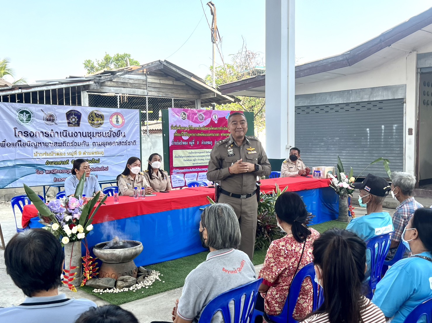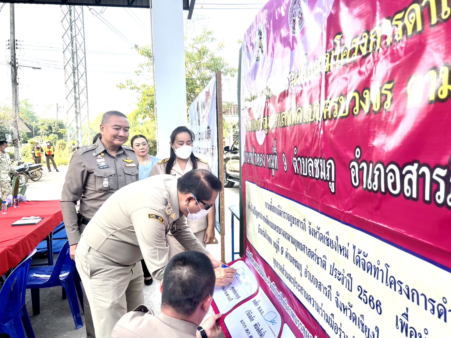 วันนี้ (3 เม.ย. 2566) เวลา 09.00 น. พ.ต.อ.วินิจฉัย พินิจศักดิ์ ผกก.สภ.สารภี , พ.ต.ท.จิตดนัย รัตนไพบูลย์เจริญ รอง ผกก.ป.ฯ , พ.ต.ท.สุชาติ หอมนาน สวป.สภ.สารภี พร้อมชุดปฎิบัติการชุมชนยั่งยืน สภ.สารภี พร้อมด้วยผู้แทนภาคีเครือข่าย ,นางสุภาภรณ์ รัตนโพธิ์ ผอ.รพ.สต.ชมภู , นางดารุณี แก้วโธา รองปลัดนายกเทศบาลตำบลชมภู , ผู้ใหญ่บ้านบ้านร่มป่าตอง ผู้นำชุมชน และ ประชาชนบ้านร่มป่าตอง ม.9 อ.สารภี จ.เชียงใหม่ ได้ร่วมประชุมและ ทำพิธีเปิดโครงการดำเนินงานชุมชนยั่งยืน เพื่อแก้ไขปัญหายาเสพติดแบบครบวงจรตามยุทธศาสตร์ชาติ ประจำปี 2566 และ ได้ร่วมลงนามบันทึกข้อตกลงว่าด้วยความร่วมมือ (MOU) การดำเนินการตามโครงการชุมชนยั่งยืนฯเพื่อ สร้างชุมชนเข้มแข็ง แก้ไขปัญหายาเสพติดอย่างครบวงจร แบบบูรณาการอย่างยั่งยืน