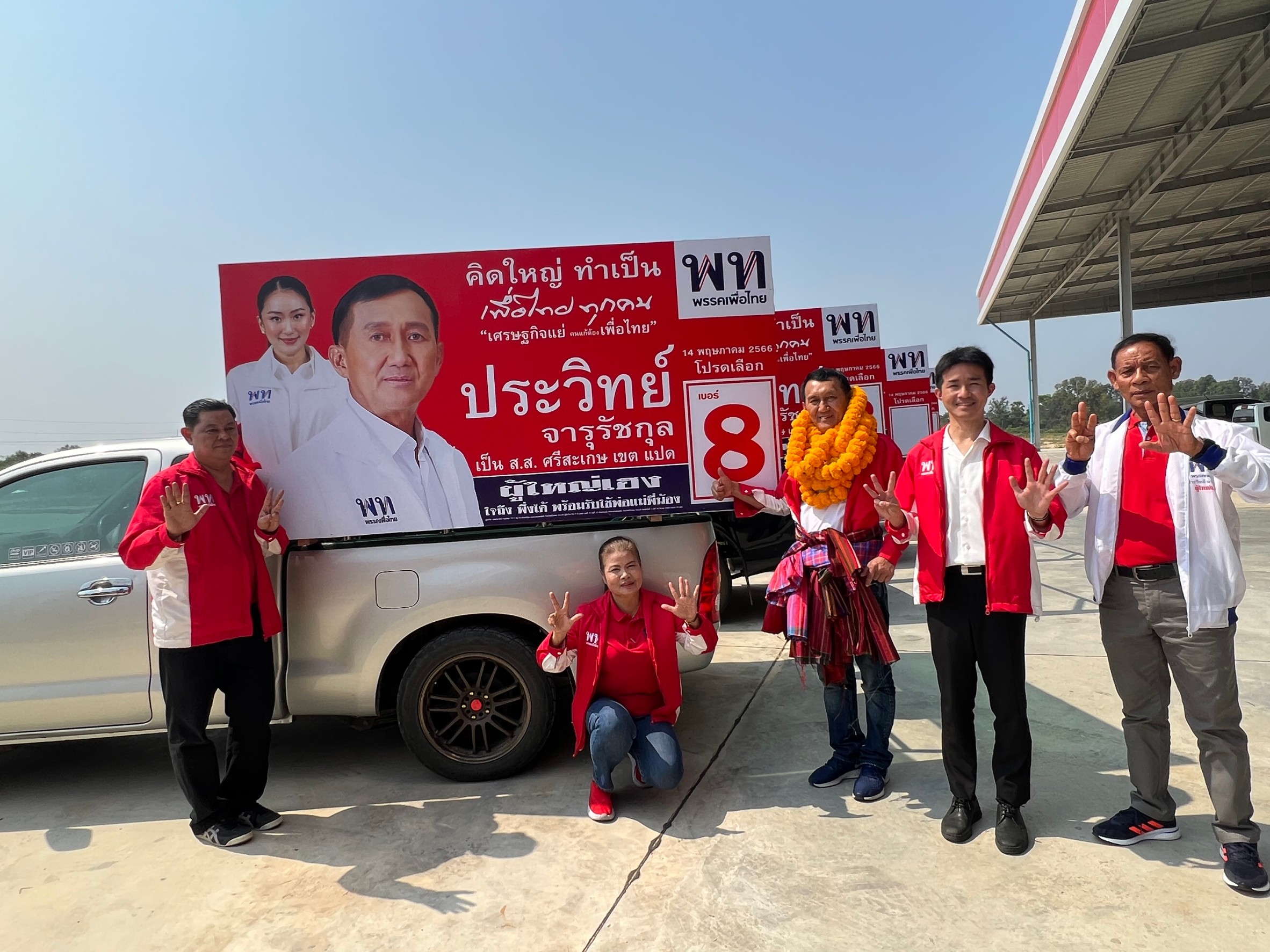 เมื่อวันที่ 5 เม.ย. 66 ผู้สื่อข่าวรายงานว่า ที่ศูนย์ประสานพรรคเพื่อไทย อ.อุทุมพรพิสัย จ.ศรีสะเกษ ได้มีมวลชนคนเสื้อแดงและประชาชนชาวศรีสะเกษในเขตเลือกตั้งที่ 8 จำนวนมาก พากันนำเอาพวงมาลัยดอกดาวเรืองและผ้าขาวม้า มาคล้องคอและผูกเอวให้กับ นายประวิทย์ จารุรัชกุล หรือนายกเฮง อดีต นายก อบต.สำโรง อ.อุทุมพรพิสัย จ.ศรีสะเกษ ซึ่งได้ลาออกจากตำแหน่ง นายก อบต.สำโรงไปสมัครรับเลือกตั้งเป็น ส.ส.ศรีสะเกษ เขต 8 พรรคเพื่อไทย โดยนายประวิทย์และคณะเพิ่งเดินทางกลับมาจากการไปสมัครรับเลือกตั้งเป็น ส.ส.ศรีสะเกษ เขต 8 ที่อาคารหอประชุมศูนย์โอท๊อป อบจ.ศรีสะเกษ อ.เมือง จ.ศรีสะเกษ