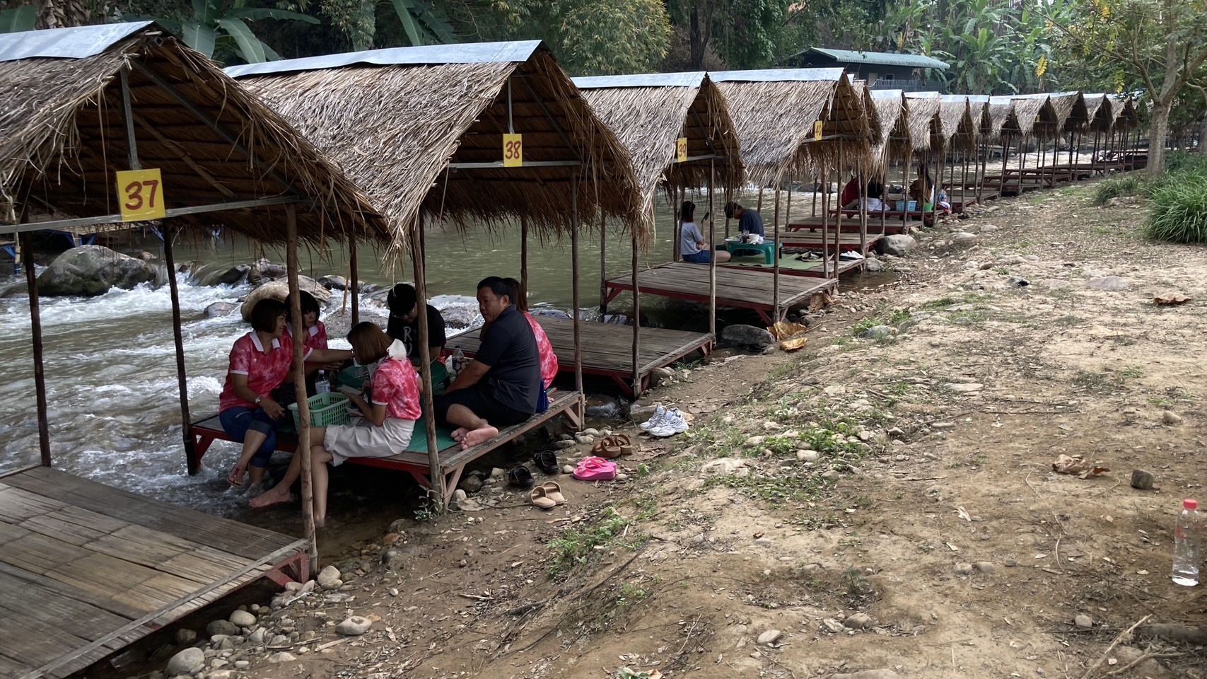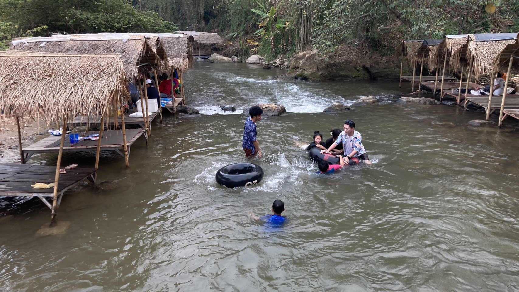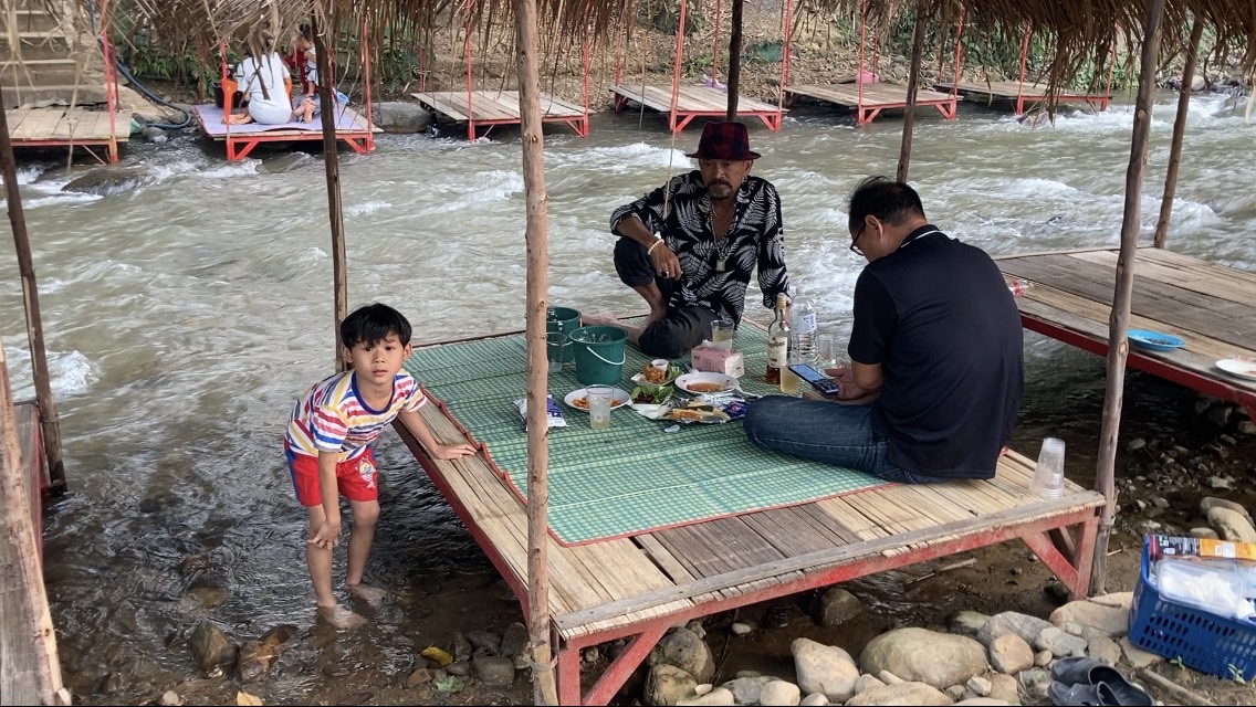 จัดสร้างเพิงพักหลบร้อนในแม่น้ำแบบเคลื่อนย้ายได้ และมีร้านขายอาหารตามสั่ง เครื่องดื่ม นำแข็ง ฯ คอยบริการลูกค้าหรือนักท่องเที่ยวที่หนีฝุ่นควัน หนีร้อนมาเที่ยวเล่นน้ำคลายร้อนและยังเล่นน้ำเย็นๆปลอดฝุ่นควัน จะมาเล่นกันช่วงสายๆนั่งทานอาหารเป็นครอบครัวหรือกลุ่มเพื่อนๆ จะนัดกันมาเที่ยวมาเล่นน้ำ มาหาทานอาหารพวกปิ้งย่าง ตำ ต่างๆ แต่ก็ต้องเช่าเพิงพักเป็นหลังๆ สั่งอาหารมาทานกันหรือจะทำจัดเตรียมจากครัวที่บ้านแล้วนำมารับประทานกันที่นี่กินไปเล่นไป จุดที่จะเล่นน้ำ อยู่ที่สะพานบ้านม่วงชุ่ม หมู่ที่ 10 ตำบลม่อนปิ่น อำเภอฝาง จังหวัดเชียงใหม่