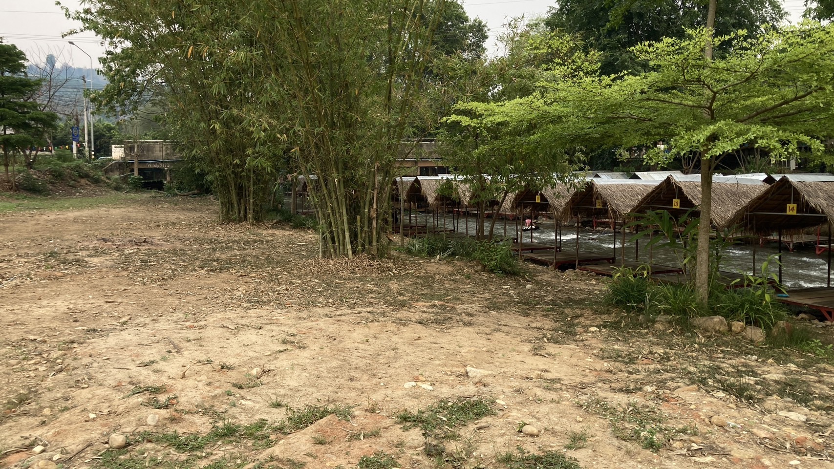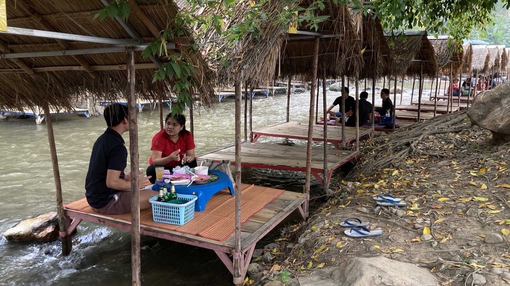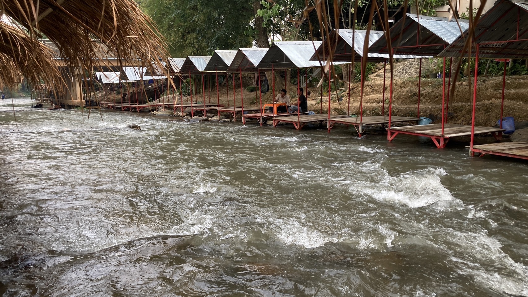 จัดสร้างเพิงพักหลบร้อนในแม่น้ำแบบเคลื่อนย้ายได้ และมีร้านขายอาหารตามสั่ง เครื่องดื่ม นำแข็ง ฯ คอยบริการลูกค้าหรือนักท่องเที่ยวที่หนีฝุ่นควัน หนีร้อนมาเที่ยวเล่นน้ำคลายร้อนและยังเล่นน้ำเย็นๆปลอดฝุ่นควัน จะมาเล่นกันช่วงสายๆนั่งทานอาหารเป็นครอบครัวหรือกลุ่มเพื่อนๆ จะนัดกันมาเที่ยวมาเล่นน้ำ มาหาทานอาหารพวกปิ้งย่าง ตำ ต่างๆ แต่ก็ต้องเช่าเพิงพักเป็นหลังๆ สั่งอาหารมาทานกันหรือจะทำจัดเตรียมจากครัวที่บ้านแล้วนำมารับประทานกันที่นี่กินไปเล่นไป จุดที่จะเล่นน้ำ อยู่ที่สะพานบ้านม่วงชุ่ม หมู่ที่ 10 ตำบลม่อนปิ่น อำเภอฝาง จังหวัดเชียงใหม่