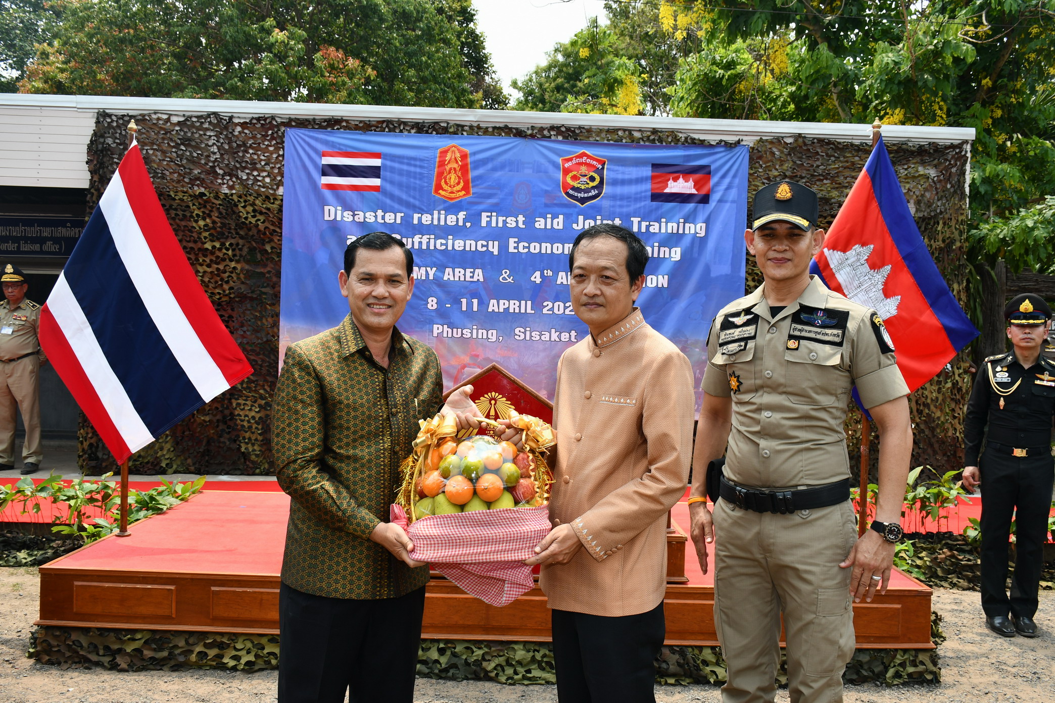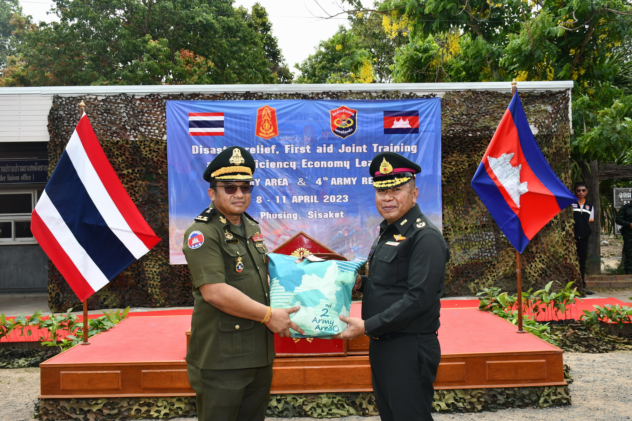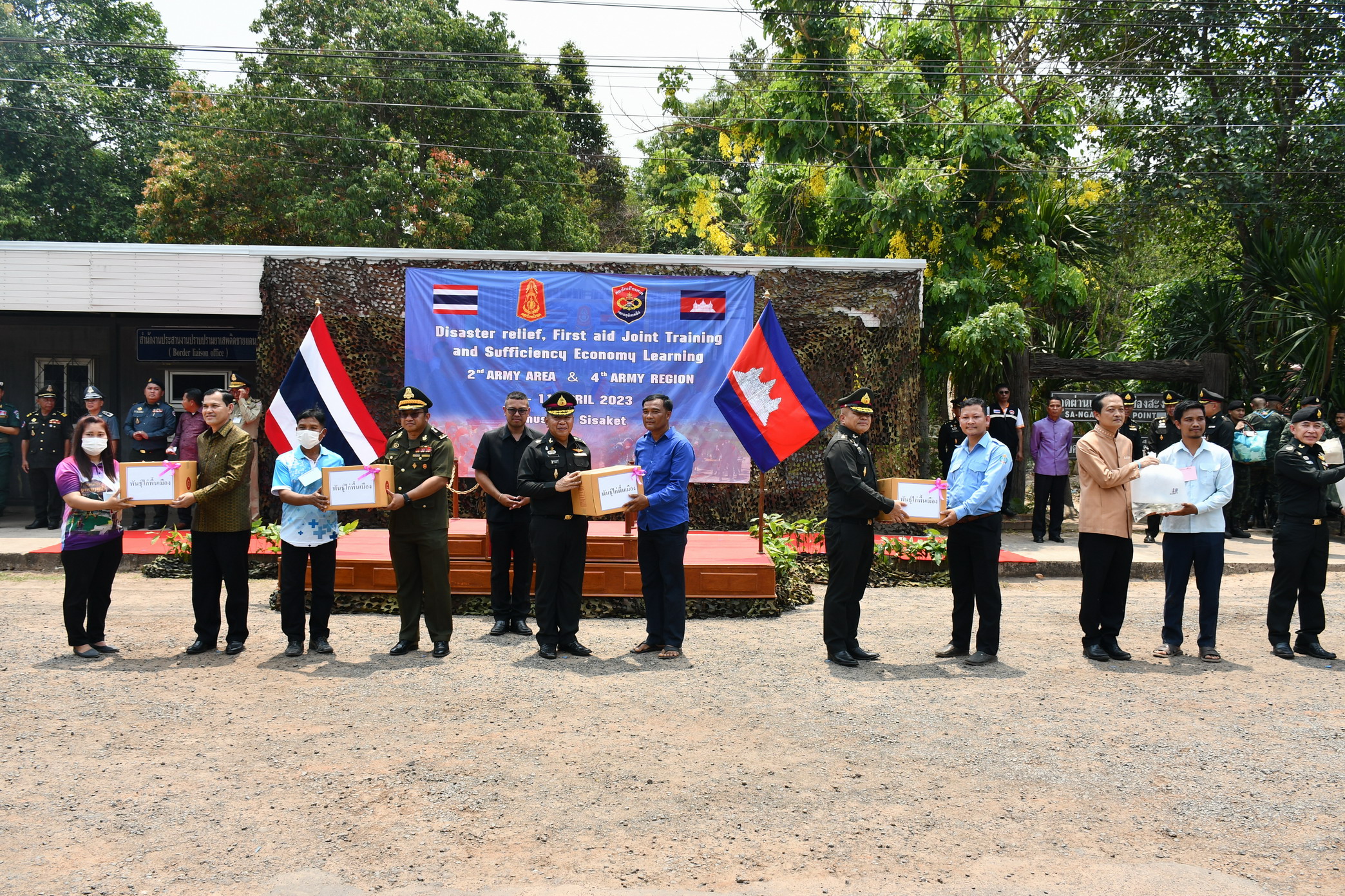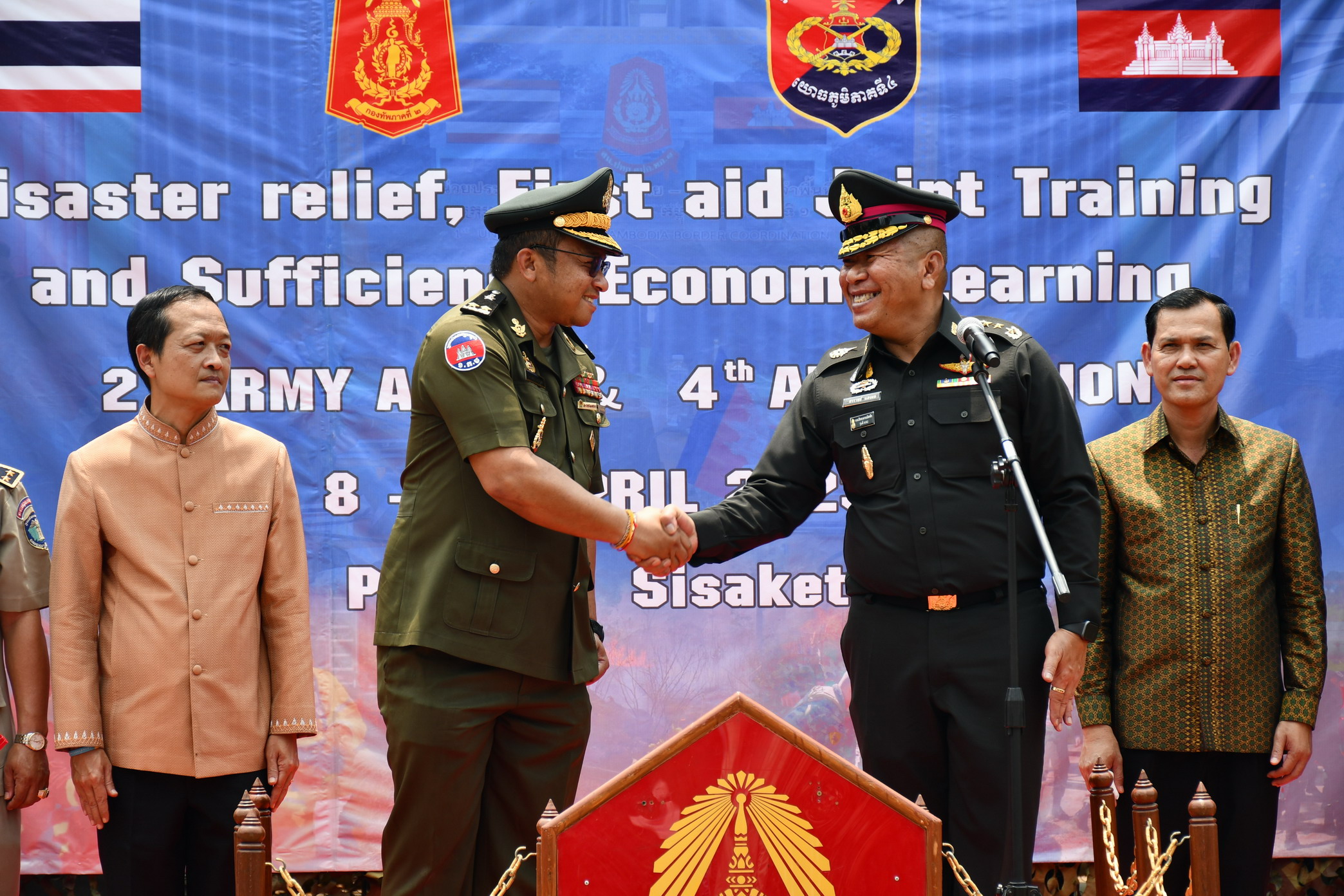 ศรีสะเกษ แม่ทัพ 2 ชาติจับมือปิดการฝึกอบรมบรรเทาสาธารณภัยและการปฐมพยาบาล พร้อมทั้งมอบพันธุ์ปลานิลจิตรดา พันธุ์ไก่พื้นเมือง กิ่งพันธุ์ไม้ผลให้กับประชาชนชาวไทยและชาวกัมพูชา