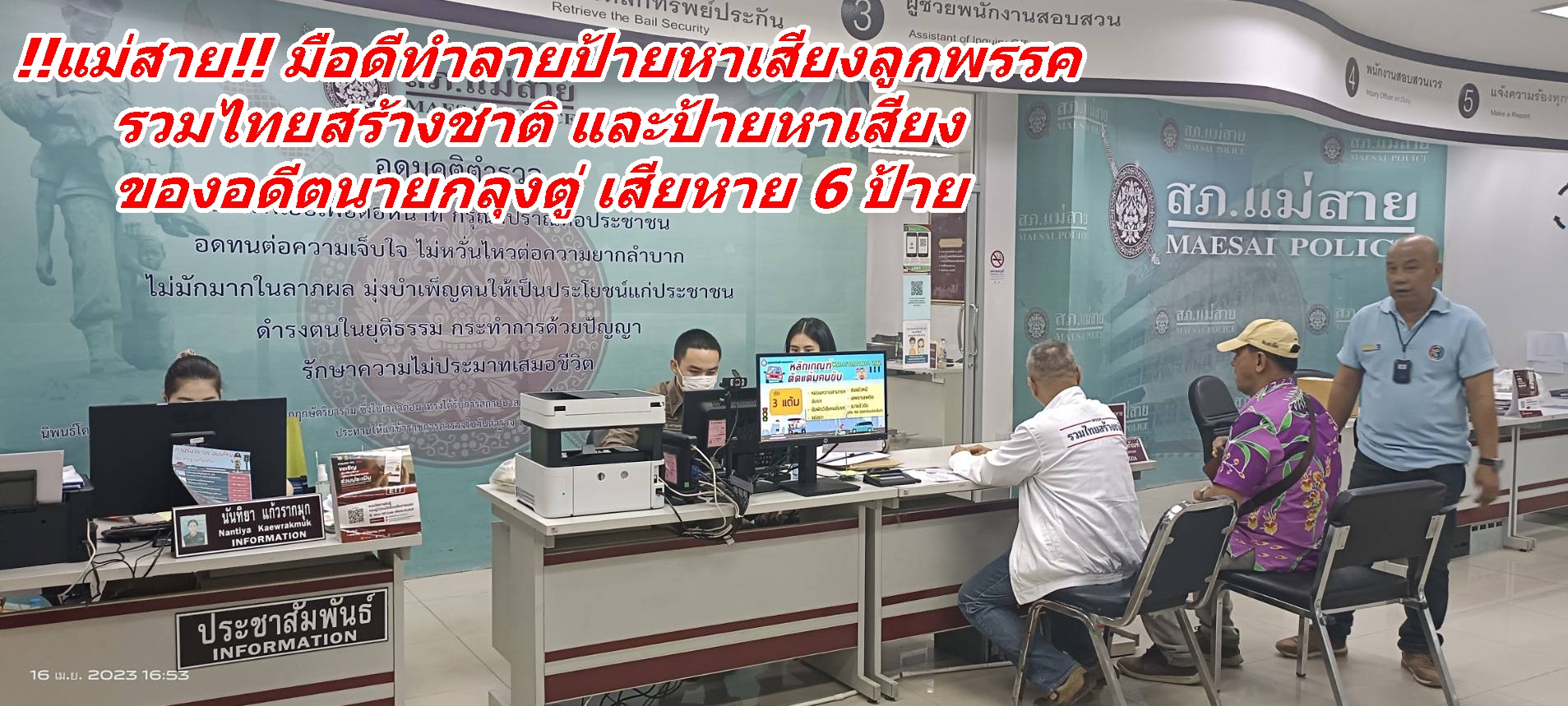 !!แม่สาย!! มือดีทำลายป้ายหาเสียงลูกพรรค รวมไทยสร้างชาติ และป้ายหาเสียงของอดีตนายกลุงตู่ เสียหาย 6 ป้าย