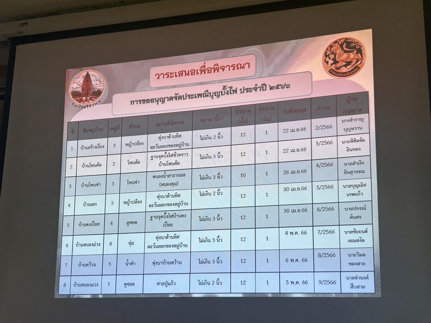 นายคมป์ สังข์วงษ์ นายอำเภอเมืองศรีสะเกษ กล่าวว่า มติที่ประชุมพิจารณาเห็นชอบให้หมู่บ้านทั้ง 8 แห่ง ดำเนินการจัดงานประเพณีบุญบั้งไฟในหมู่บ้าน และอนุญาตให้มีการจุดและปล่อยบั้งไฟ ภายใต้มาตรการด้านความปลอดภัยและรักษาความสงบเรียบร้อย ระเบียบกฎหมายที่เกี่ยวข้อง และประกาศจังหวัดศรีสะเกษฯ อย่างเคร่งครัดโดยมีผู้แทนผู้กำกับการสถานีตำรวจภูธรเมืองศรีสะเกษ ประธานสภาวัฒนธรรมอำเภอเมืองศรีสะเกษ ผู้แทนสาธารณสุขอำเภอเมืองศรีสะเกษ ท้องถิ่นอำเภอเมืองศรีสะเกษ ปลัดอำเภอ นายกองค์กรปกครองส่วนท้องถิ่น กำนัน ผู้ใหญ่บ้าน เข้าร่วมการประชุม////