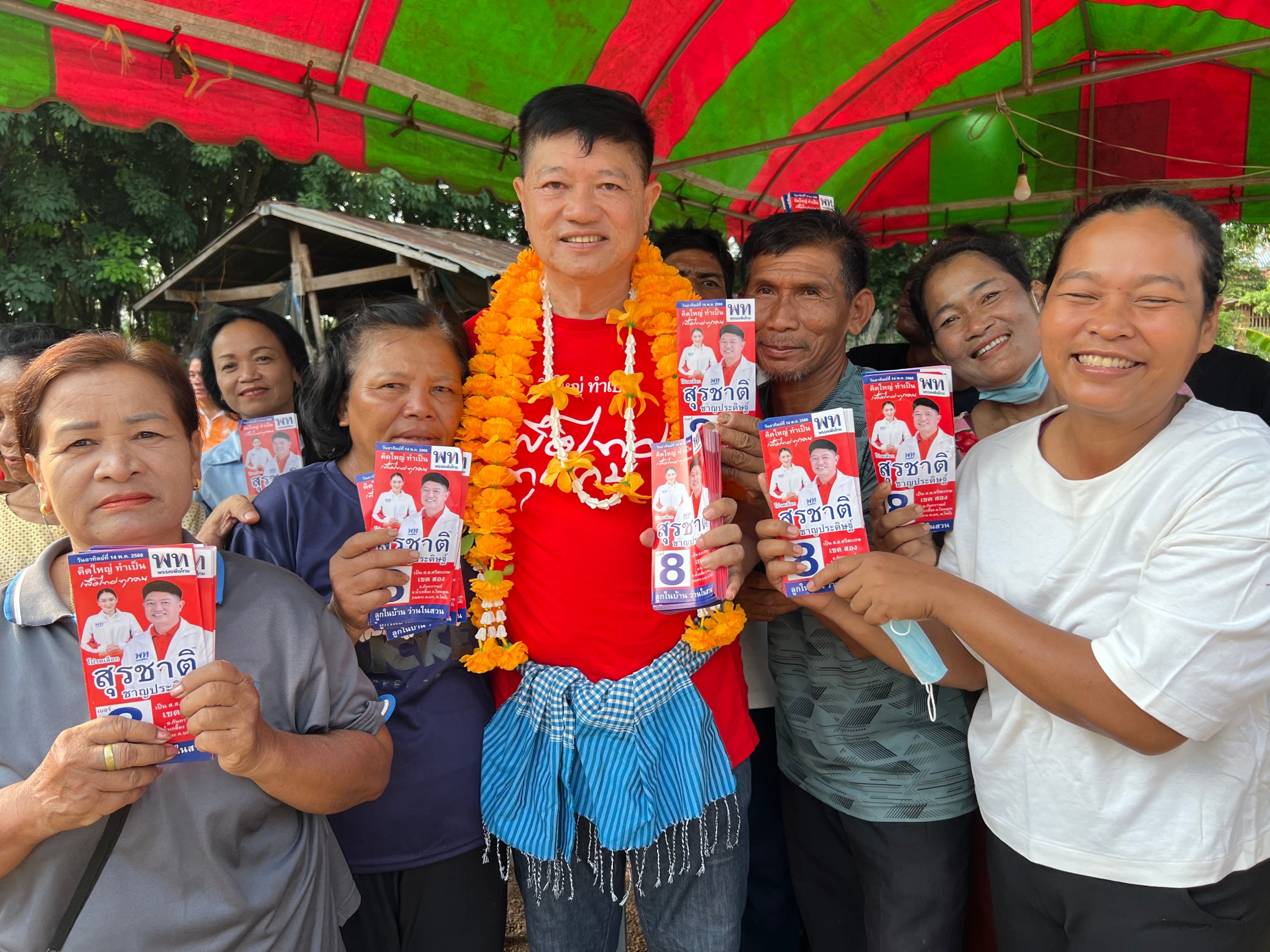 เมื่อวันที่ 19 เม.ย. 2566 ผู้สื่อข่าวรายงานว่า ที่บ้านเขิน หมู่ 11 ต.เขิน อ.น้ำเกลี้ยง จ.ศรีสะเกษ นายสุรชาติ ชาญประดิษฐ์ ผู้สมัคร ส.ส.ศรีสะเกษ เขต 2 หมายเลข 8 พรรคเพื่อไทย พร้อมด้วยกลุ่มผู้สนับสนุน ซึ่งเป็นแกนนำประชาชนในหมู่บ้านเขิน ได้พากันไปบ้านทุกหลังในหมู่บ้านเพื่อนำเอาแผ่นพับหาเสียงของ นายสุรชาติ ชาญประดิษฐ์ และนโยบายของพรรคเพื่อไทย ไปแจกจ่ายให้กับประชาชนทุกคนที่อยู่ภายในบ้านเรือนของตนเอง ทั้งนี้เพื่อให้ประชาชนทุกคนได้รับทราบถึงนโยบายของพรรคเพื่อไทยว่า มีนโยบายที่ดีมีประโยชน์มากต่อประชาชนชาวศรีสะเกษและชาวไทยทั่วประเทศอย่างไรบ้าง โดยนายสุรชาติ จะเดินนำหน้ากลุ่มผู้สนับสนุนไปยังบ้านเรือนทุกหลังในหมู่บ้าน เพื่อหาเสียงและขอคะแนนเสียงในการเลือกตั้งครั้งนี้ จากนั้น ได้มาปราศรัยกับพี่น้องประชาชนบริเวณสี่แยกกลางหมู่บ้านเกี่ยวกับนโยบายของพรรคเพื่อไทย ปรากฏว่าได้รับความสนใจจากพี่น้องประชาชนมาร่วมรับฟังการปราศรัยอย่างคึกคักมาก และพากันประกาศพร้อมหนุนเลือกผู้สมัคร ส.ส.และพรรคเพื่อไทยแบบแลนด์สไลด์ เพื่อจะได้เข้าไปเป็นรัฐบาลบริหารประเทศต่อไป