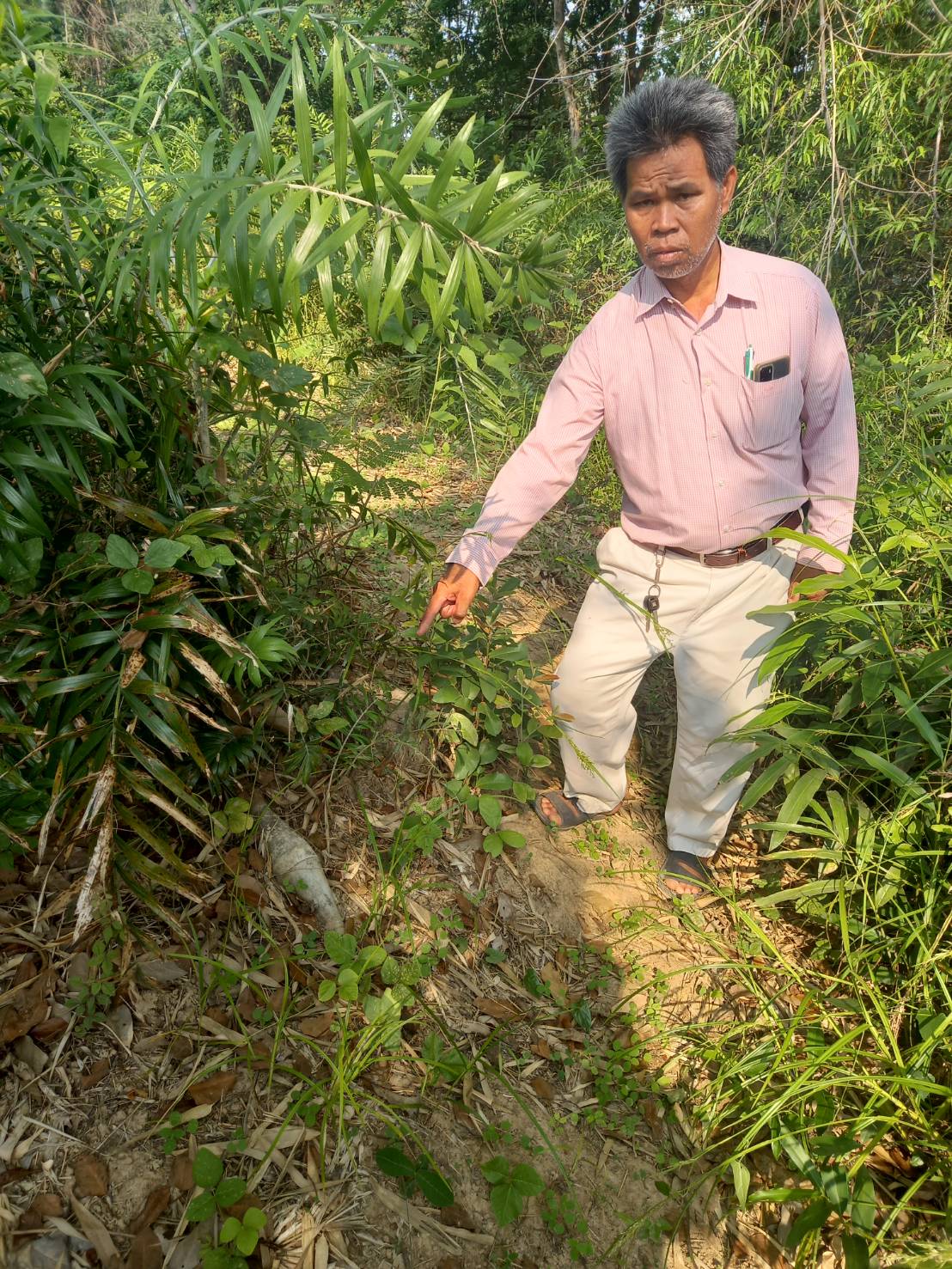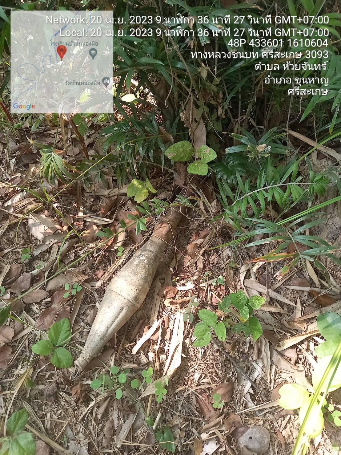 เมื่อวันที่ 20 เม.ย. 66 ผู้สื่อข่าวรายงานว่า ที่บริเวณทุ่งนาริมห้วยจันทร์ บ้านหนองผือ ต.ห้วยจันทร์ อ.ขุนหาญ จ.ศรีสะเกษ นายประมวล แดงเลี่ยม กำนัน ต.ห้วยจันทร์ พร้อมด้วย นายสีใส มีวงษ์ ผู้ใหญ่บ้านหนองผือ และนายสรพงษ์ กันมิดา ผรส.ม.3ต.ห้วยจันทร์ ได้เดินทางไปตรวจสอบที่บริเวณดังกล่าว เนื่องจากได้รับแจ้งจาก นางสงบ สายจันทร อายุ 62 ปี ชาวบ้านหนองผือว่า ขณะที่กำลังมาเดินดูทุ่งนาของตนเองและหาเก็บของป่าด้วย ปรากฏว่าได้พบวัตถุคล้ายกับลูกระเบิด จึงได้แจ้งให้ผู้ใหญ่บ้านทราบเพื่อให้มาทำการตรวจสอบ เมื่อไปถึงที่เกิดเหตุพบว่า เป็นป่าละเมาะและพบลูกระเบิดจำนวน 1 ลูก ความยาวประมาณ 1 ฟุต วางอยู่ในกอหญ้าริมทางเดินในป่า จึงได้แจ้งให้เจ้าหน้าที่ตำรวจ สภ.ขุนหาญ และเจ้าหน้าที่ทหารซึ่งอยู่ใกล้ที่เกิดเหตุทราบโดยด่วน และได้ทำการกั้นรอบบริเวณเอาไว้เพื่อความปลอดภัย