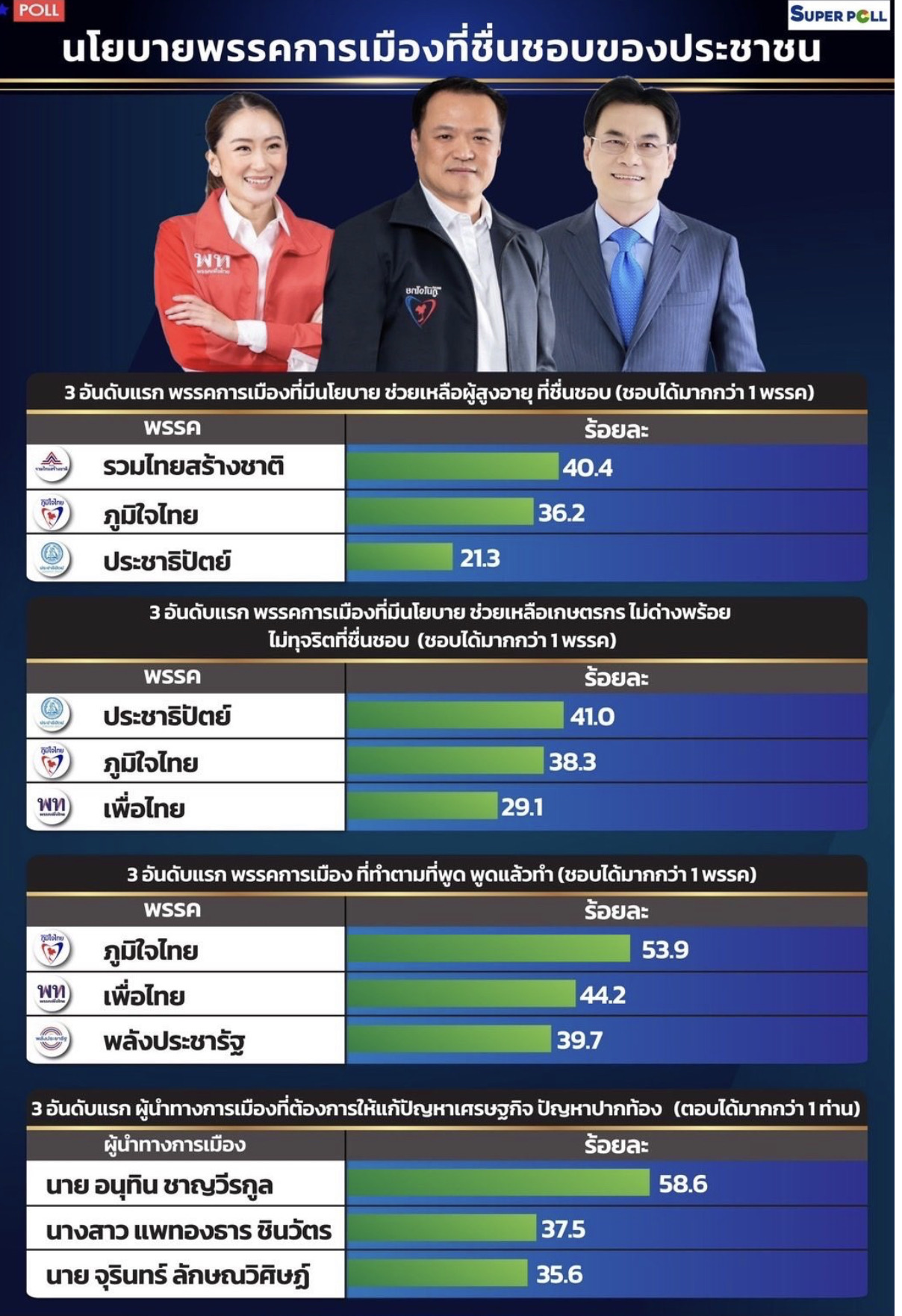 ทั้งนี้ผลสำรวจของสำนักวิจัยซูเปอร์โพล (SUPER POLL) เรื่อง “นโยบายพรรคการเมืองที่ชื่นชอบของประชาชน” กรณีศึกษาตัวอย่างประชาชนทุกสาขาอาชีพทั่วประเทศ ดำเนินโครงการทั้งการวิจัยเชิงปริมาณ (Quantitative Research) และการวิจัยเชิงคุณภาพ (Qualitative Research) จำนวน 1,322 ตัวอย่าง ระหว่างวันที่ 15 – 21 เมษายน พ.ศ.2566