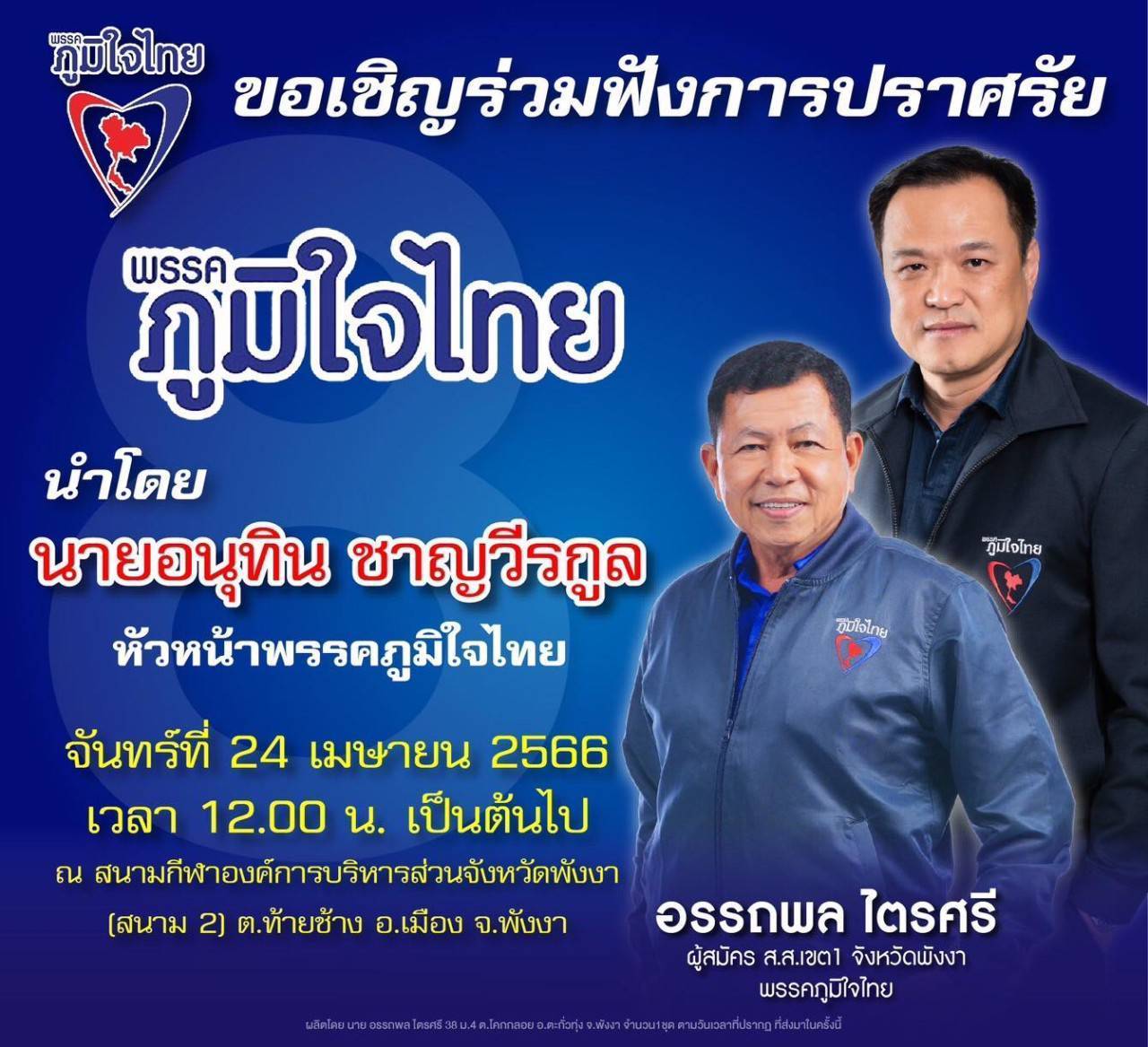 เมื่อเวลา 14.00 น.วันที่ 24 เม.ย.66 ที่บริเวณสนามกีฬากลางจังหวัดพังงา ต.ถ้ำน้ำ อำเภอเมืองพังงา นำโดยนายอนุทิน ชาญวีรกูล หัวหน้าพรรคภูมิใจไทย พร้อมด้วย นายศุภชัย ใจสมุทร นายทะเบียนพรรคภูมิใจไทย, ดร.นาที รัชกิจประการ เหรัญญิกพรรคฯ ประธานที่ปรึกษารัฐมนตรีว่าการกระทรวงสาธารณสุข, นายสรอรรถ กลิ่นประทุม ผู้บริหารพรรค พร้อม ผู้สมัครสส.พังงา นายอรรถพล ไตรศรี “โก้ชัย” ผู้สมัคร ส.ส.เขต 1 เบอร์ 8 และนายอำนาจ ดำรงพิทยากุล ผู้สมัครสส. เขต 2 เบอร์ 1 อดีตรองประธานสภาอบจ.พังงา ร่วมกันปราศรัยใหญ่ในประเด็นต้องเปลี่ยนพังงาให้เป็นเมืองท่องเที่ยวในมิติใหม่เพื่อการกระตุ้นเศรษฐกิจ, ส่งเสริมนโยบายสร้างเสริมอาชีพให้คนพังงามีรายได้เพิ่มขึ้น, ถนนหนทางในพื้นที่พังงาต้องพัฒนา ลั่น ! ต้องเปลี่ยนพังงาให้ดีกว่าเดิม ท่ามกลางกองเชียร์พรรคภูมิใจไทยจำนวนกว่า 3.000กว่า คน ร่วมกันส่งเสียงสนั่นทั้งสนามกีฬาฯ