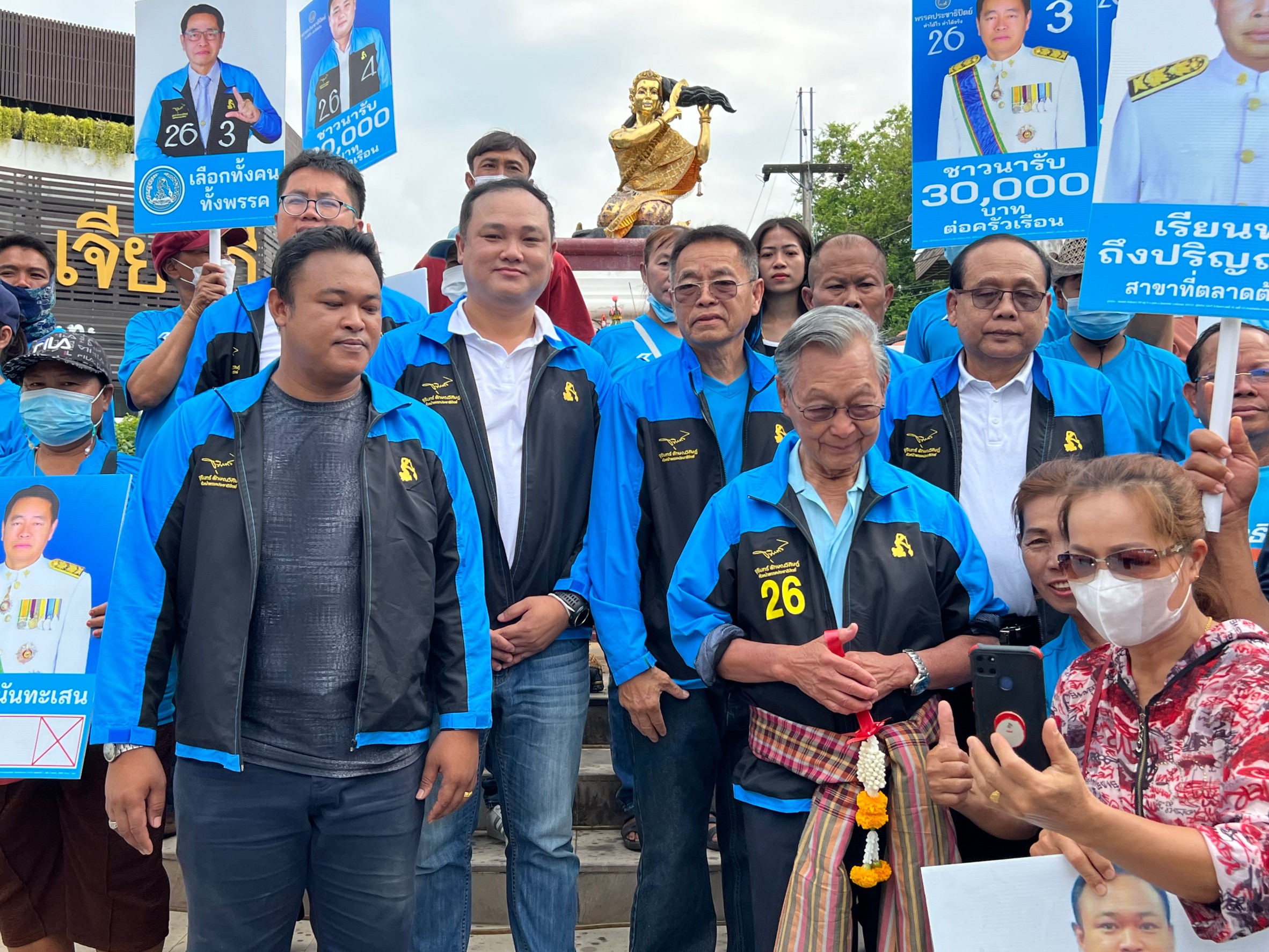 นายชวน หลีกภัย ประธานที่ปรึกษาพรรคประชาธิปัตย์ กล่าวต่อไปว่า นมีความยินดีที่พรรคประชาธิปัตย์มีนโยบายเอาไว้แล้วพี่น้องประชาชนชาวศรีสะเกษได้ประโยชน์ทุกเรื่อง แม้กระทั่งรัฐบาลทุกวันนี้ก็ยังทำนโยบายส่งสินค้าไปต่างประเทศในรอบ 2 – 3 ปีที่ผ่านมาโรคโควิด-19 ได้ทำให้การท่องเที่ยวซึ่งเป็นรายได้ใหญ่ของเราหายไปหมดเลย แต่โชคดีว่าคุณจุรินทร์ ลักษณะวิศิษฎ์ หัวหน้าพรรคประชาธิปัตย์เป็นคนเก่งที่สามารถทำให้การส่งออกชดเชยความเสียหายไปได้มาก อย่างที่เราทราบว่าทุเรียนภูเขาไฟของเราที่ศรีสะเกษนี้ก็ได้ประโยชน์ไปด้วยเพราะว่าทุเรียนภูเขาไฟและทุเรียนต่างๆ ส่งออกได้เป็นเงินกว่า 100,000,000,000 บาท แพงได้มากกว่าข้าว กว่ามันสำปะหลังและยางพาราซึ่งเป็นสิ่งที่น่าภาคภูมิใจ แต่ว่าสภาพอย่างนี้เศรษฐกิจอย่างนี้ก็ต้องดูกันต่อไป เพราะว่าประเทศเพื่อนบ้านของเราเค้าก็แข่งกัน ตอนนี้เวียดนามก็ผลิตทุเรียนแข่งกับเรา มาเลเซียก็ปลูกทุเรียนพันธุ์ของเขาเองแข่งกับเราเช่นกัน เพราะฉะนั้นทุกประเทศเค้าก็รู้หมดว่าใครเป็นยังไง เราจึงต้องรักษาคุณภาพผลผลิตทุเรียนของเราเอาไว้ ตนย้ำว่าต้องรักษาวินัย รักษาคุณภาพของสิ่งที่เราคิดขึ้นมาให้ดีเพื่อไม่ให้เป็นเงื่อนไขคนเลิกซื้อทุเรียนเช่นทุเรียนอ่อนก็มีปัญหา แต่ว่าน่าดีใจที่เดี๋ยวนี้เกษตรกรของเราเป็นระบบดีขึ้น ขอให้ดีขึ้นเรื่อย ๆ และสิ่งที่น่าจะภูมิใจสำหรับพี่น้องศรีสะเกษที่ทำนาก็คือนโยบายประกันรายได้ ตนว่าเกษตรกรทำได้จริงและเงินไม่รั่วไหล แต่ว่าไม่ค่อยเป็นข่าวเพียงเพราะว่าไม่รั่วไหล หากมีการโกงก็จะเป็นข่าวขึ้นมาทันที เงินทุกบาทที่ชาวนาได้ ฝ่ายการเมืองไม่สามารถที่จะไปหักไปถอนเอาไว้ได้เลยไปถึงชาวนาจริงๆร้อยทั้งร้อย//////
