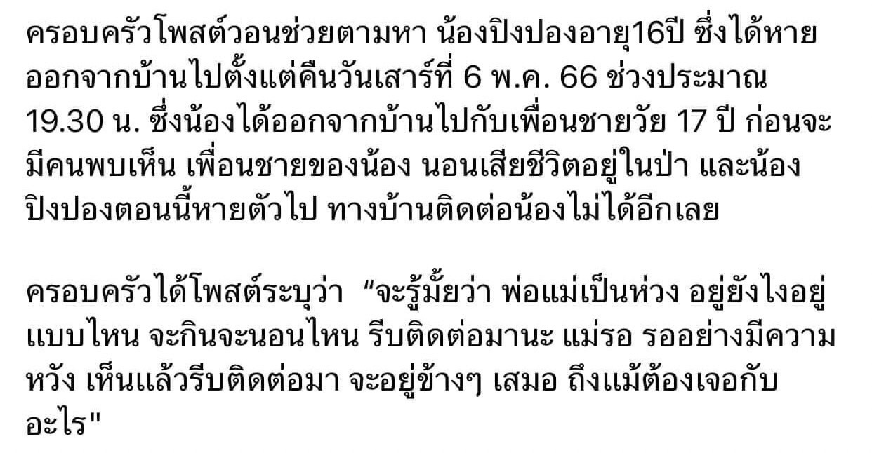 สภาพศพถูกของแข็งตีบริเวณศีรษะและใบหน้า เมื่อวัน อาทิตย์ที่ 7 พฤษภาคม 66 ส่วนน้องปิงปอง อายุ 16 ปี ที่ออกจากบ้านไปพร้อมกันกับผู้เสียชีวิต ตั้งแต่ค่ำวันเสาร์ที่ 6 พฤษภาคมได้หายตัวไปและติดต่อไม่ได้
