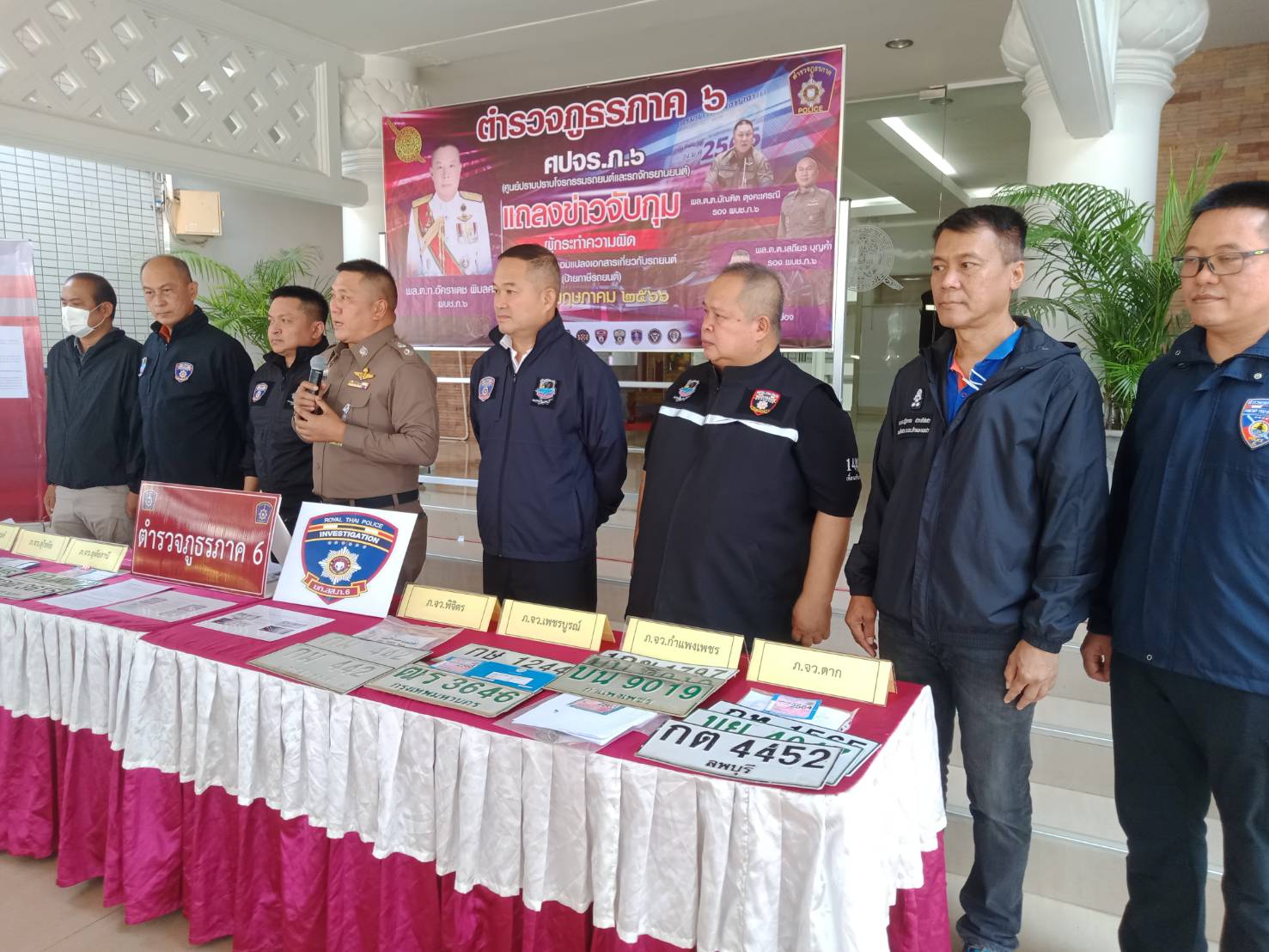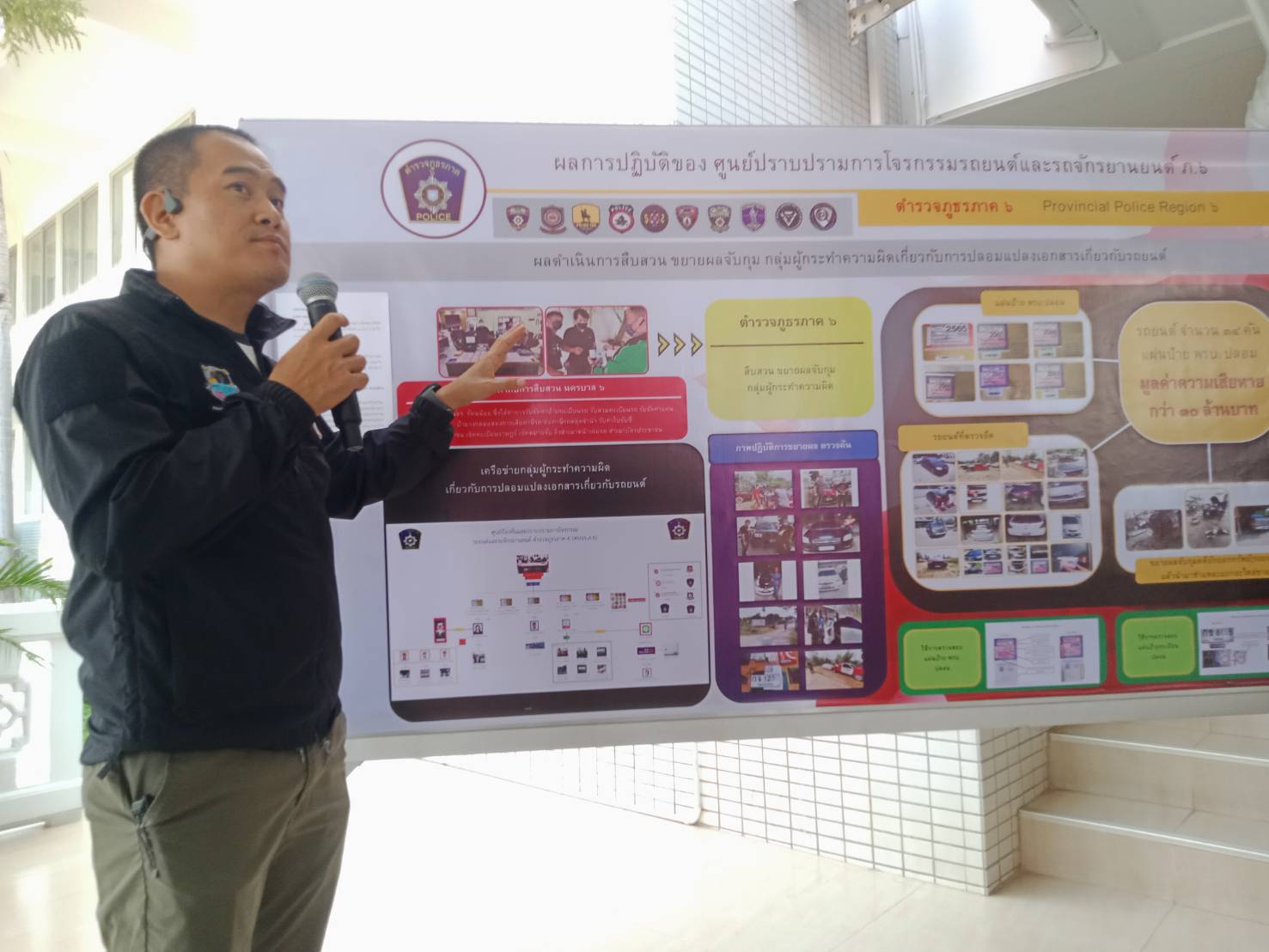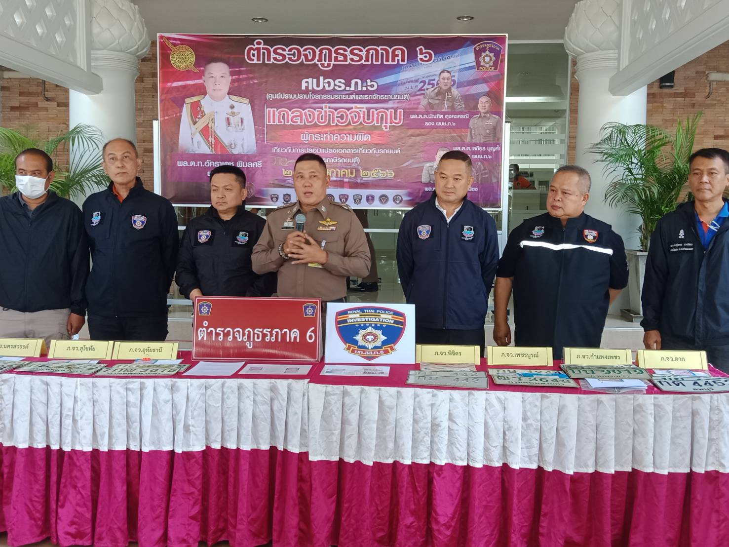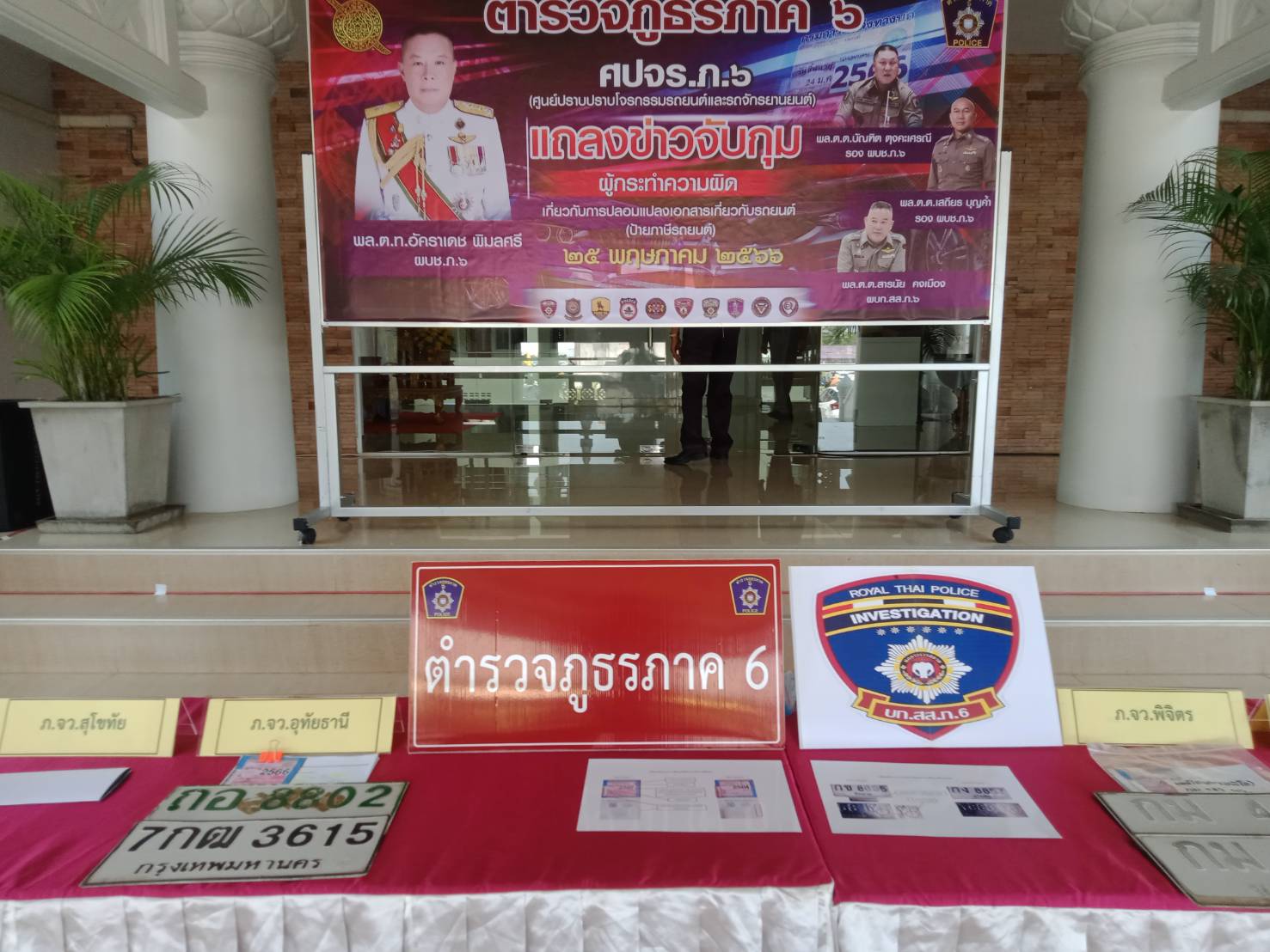 พิษณุโลก ตำรวจภูธรภาค 6 แถลงข่าวการจับกุมผู้กระทำความผิดเกี่ยวกับการปลอมแปลงเอกสารเกี่ยวกับรถยนต์ (ป้ายภาษีรถยนต์)
