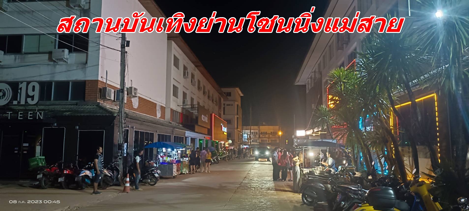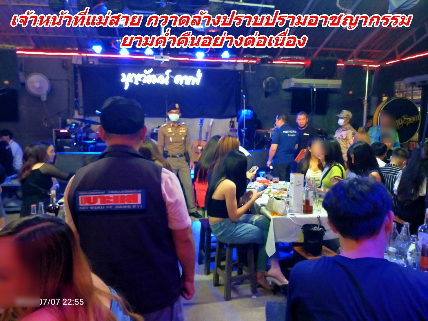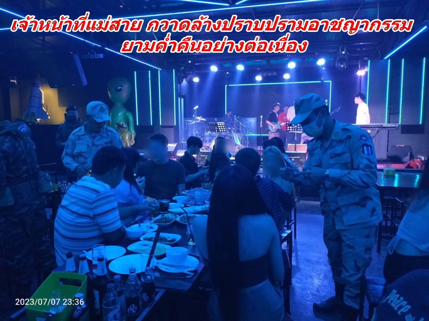 ซึ่งพบมีการเปิดเป็นร้านอาหารและเครื่องดื่มรวมทั้งเป็นสถานบันเทิงในยามค่ำคืน ทั้งนี้เจ้าหน้าที่ได้ขอตรวจเอกสารใบขออนุญาตประกอบกิจการ ใบอนุญาตการจำหน่ายเครื่องดื่มแอลกอฮอล์ บุคคลที่เป็นพนักงานร้าน ลักษณะการให้บริการ ฯลฯ ว่าถูกต้องตามกฎหมายหรือไม่ซึ่งพบว่าสถานบริการส่วนใหญ่ดำเนินการไปตามปกติโดยไม่พบการกระทำผิดกฎหมายซึ่งทางเจ้าหน้าที่แม่สายบูรณาการร่วมหลายฝ่ายตรวจเข้มสถานบริการและสถานประกอบการอย่างต่อเนื่องเพื่อเป็นการกวาดล้างปราบปราบอาชญากรรมในพื้นที่…