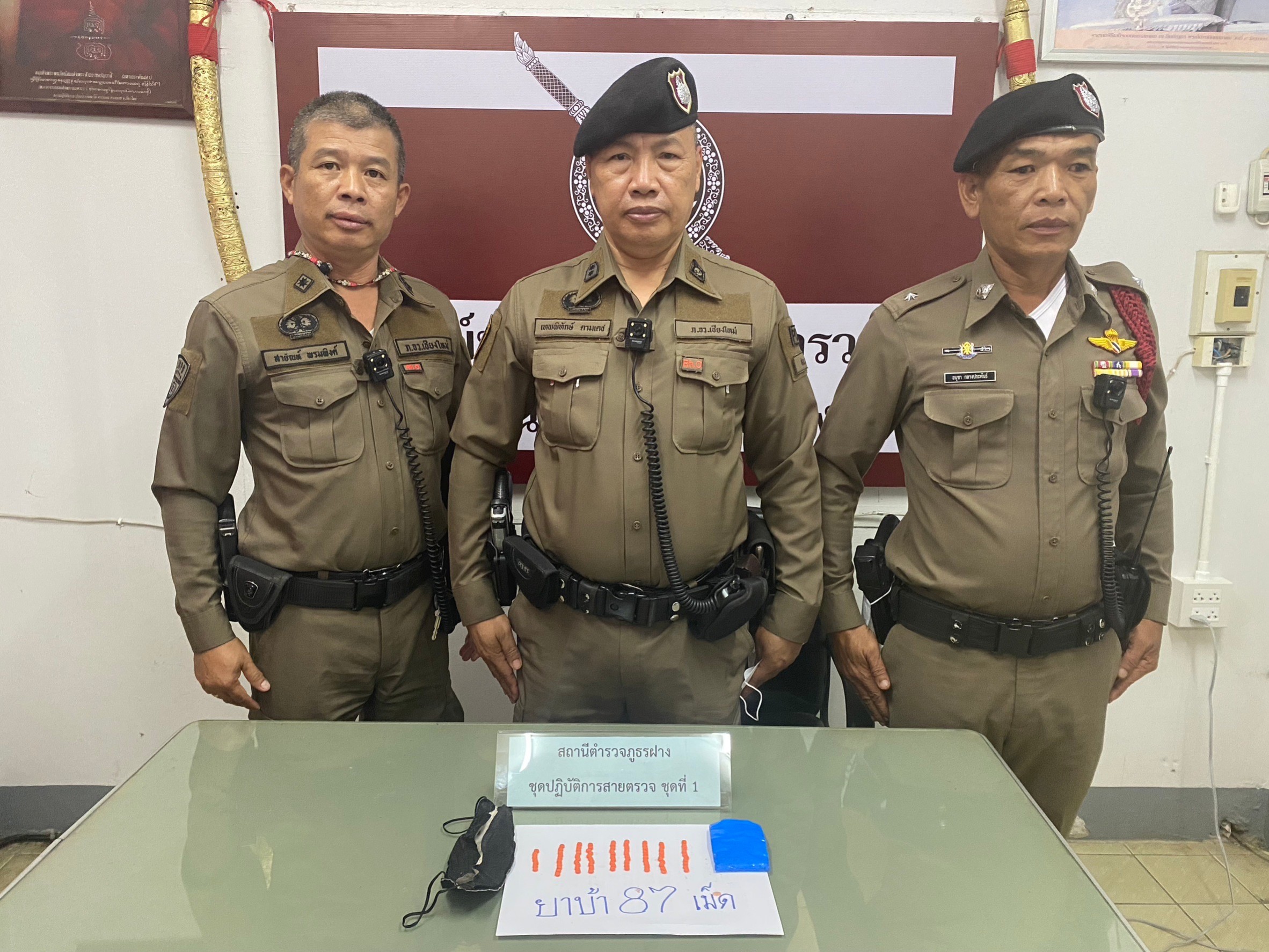 ร.ต.อ.กฤษณะ มั่นกันนาน ,ร.ต.ท.เทพพิทักษ์ ตามเดช ,ร.ต.ต.อนุชา กลางประพันธ์ ,ร.ต.ต.สายัญห์ พรหมพิงค์ ,ด.ต.พีรพัฒน์ สุหล้า ได้ออกตรวจพื้นที่ตามปกติและได้ขึ้นตรวจในพื้นที่เส้นทางขึ้นดอยผ้าห่มปก เห็นถุงทิ้งไว้ในป่าละเมาะได้เดินมาดูพบว่าเป็นถุงใส่ยาบ้าทิ้งไว้ได้ร่วมตรวจยึดยาบ้า จำนวน 87 เม็ด ที่บริเวณหน้าด่านห้วยบอนที่ทำการอุทยานดอยผ้าห่ม ม.13 บ้านห้วยบอน ต.เวียง อ.ฝาง จ.เชียงใหม่ ข้างอ่างเก็บน้ำห้วยบอน ผู้กระทำผิดไหวตัวหนีไปก่อนและรอดตัวไปได้ ทางเจ้าหน้าที่สายตรวจได้นำของกลางส่ง พงส.สภ.ฝาง เพื่อดำเนินคดีต่อไป