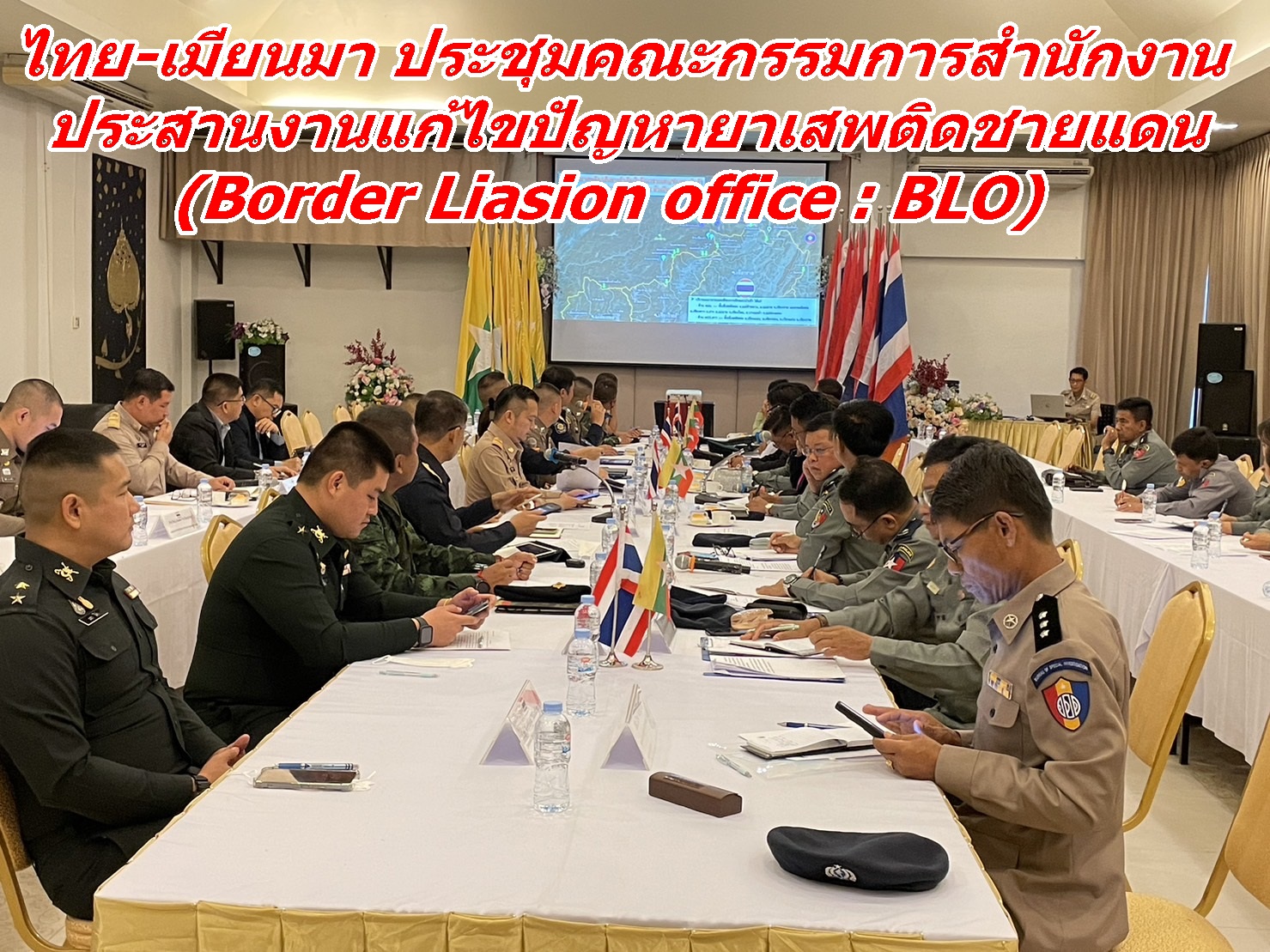 เมื่อวันที่ 8 ส.ค.66 เวลา 09.30 น. เจ้าหน้าที่ฝ่ายปกครอง ทหาร ตำรวจ ตรวจคนเข้าเมือง ปปส. ตชด. และหน่วยงานที่เกี่ยวข้องในพื้นที่ตะเข็บชายแดน อ.แม่สาย-ท่าขี้เหล็ก ได้เข้าร่วมวาระการประชุมคณะกรรมการสำนักงานประสานงานแก้ไขปัญหายาเสพติดชายแดน (Border Liasion office : BLO) ณ ห้องประชุม โรงแรม ปุณยมันตรา ตำบลแม่ไร่ อำเภอแม่จัน จังหวัดเชียงราย โดยมีวัตถุประสงค์เพื่อกำหนดแนวทางในการแก้ไขปัญหาและปราบปรามกลุ่มขบวนการยาเสพติด และและปัญหาต่างๆ ของเมืองชายแดนทั้งของประเทศในข้อมูลข่าวสารของสถานการณ์ปัจจุบัน