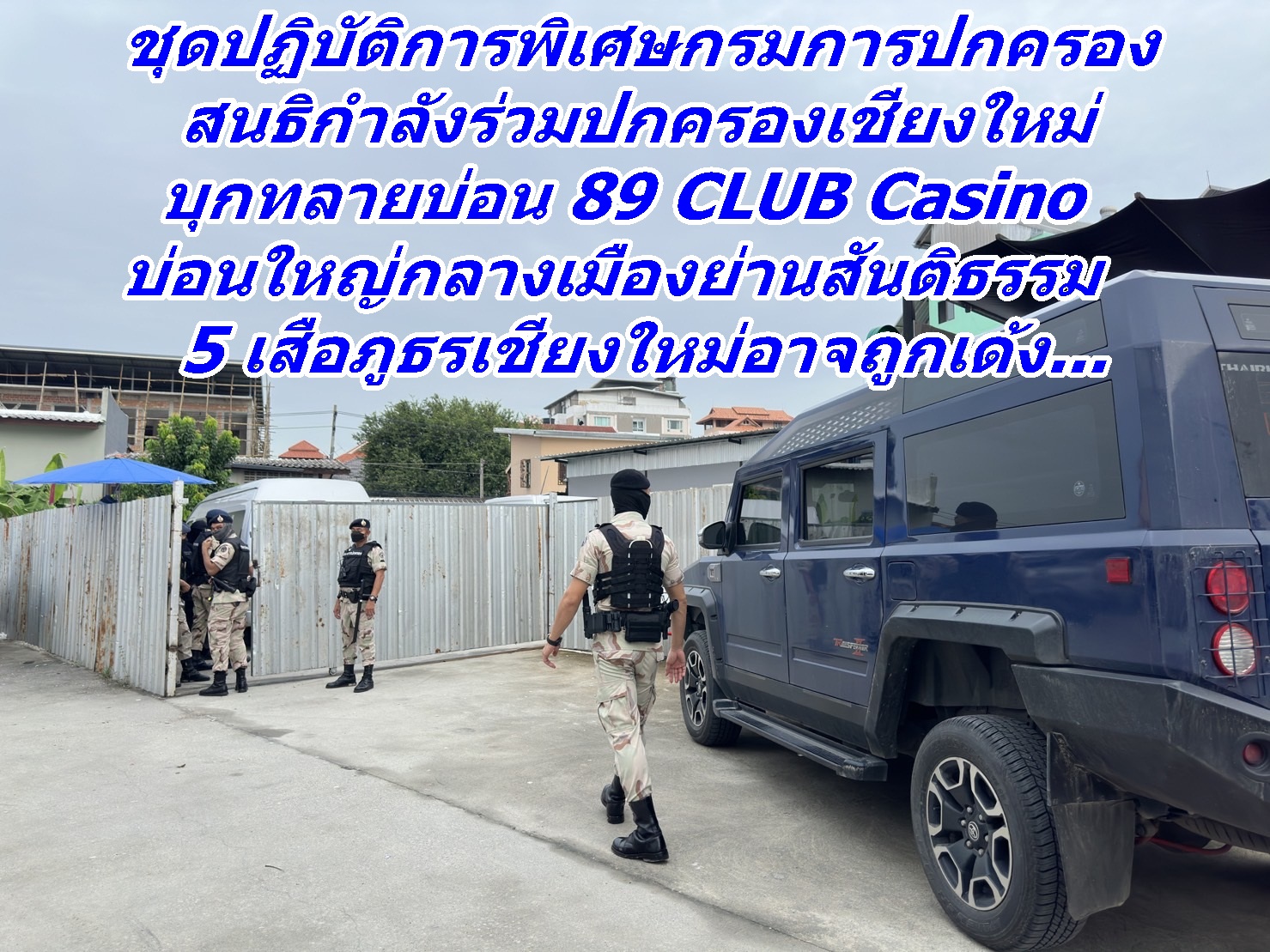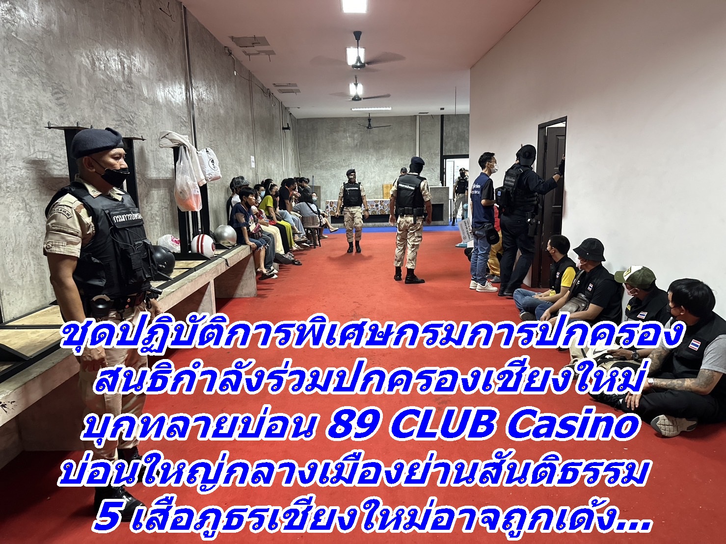 เชียงใหม่ – ชุดปฏิบัติการพิเศษกรมการปกครอง สนธิกำลังร่วมปกครองเชียงใหม่ บุกทลายบ่อน 89 CLUB Casino บ่อนใหญ่กลางเมืองย่านสันติธรรม 5 เสือภูธรเชียงใหม่อาจถูกเด้ง…ชุดปฏิบัติการพิเศษกรมการปกครอง ร่วมกับฝ่ายปกครองจังหวัดเชียงใหม่ บุกทลายบ่อน 89 CLUB Casino บ่อนใหญ่กลางเมืองเชียงใหม่ ย่านสันติธรรม พบเงินหมุนเวียนต่อวันกว่าล้านบาท นักพนันกว่าร้อยคน
