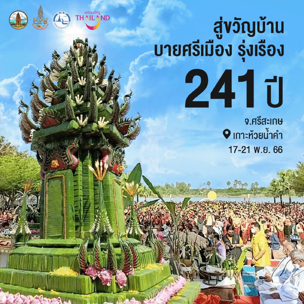 เมื่อวันที่ 17 พ.ย.2566 ผู้สื่อข่าวรายงานว่า จากการที่ จ.ศรีสะเกษได้มีกำหนดการณ์จัดงานฉลอง 241 ปี ศรีสะเกษ “สู่ขวัญบ้าน บายศรีเมือง รุ่งเรือง ๒๔๑ ปี จังหวัดศรีสะเกษ” ระหว่างวันที่ 17 – 21 พฤศจิกายน 2566 ณ บริเวณสวนสาธารณะลานออดหลอด “อนุสรณ์ 238 ปี จังหวัดศรีสะเกษ และบริเวณสวนเฉลิมพระเกียรติ พระบาทสมเด็จพระเจ้าอยู่หัว เฉลิมพระชนมพรรษา 80 พรรษา (เกาะห้วยน้ำคำ) อ.เมืองศรีสะเกษ จ.ศรีสะเกษ โดยการจัดงานครั้งนี้เพื่อร่วมแสดงออกถึงความตระหนักและความภาคภูมิใจในประวัติศาสตร์อันเจริญรุ่งเรืองของเมืองศรีสะเกษ ตลอดทั้งเพื่อสืบสานรักษาพัฒนาและต่อยอดมรดกภูมิปัญญาอัตลักษณ์ทางวัฒนธรรมของ 4 ชนเผ่า จ.ศรีสะเกษ ประกอบด้วย เผ่าเขมร เผ่ากูย เผ่าเยอและเผ่าลาว