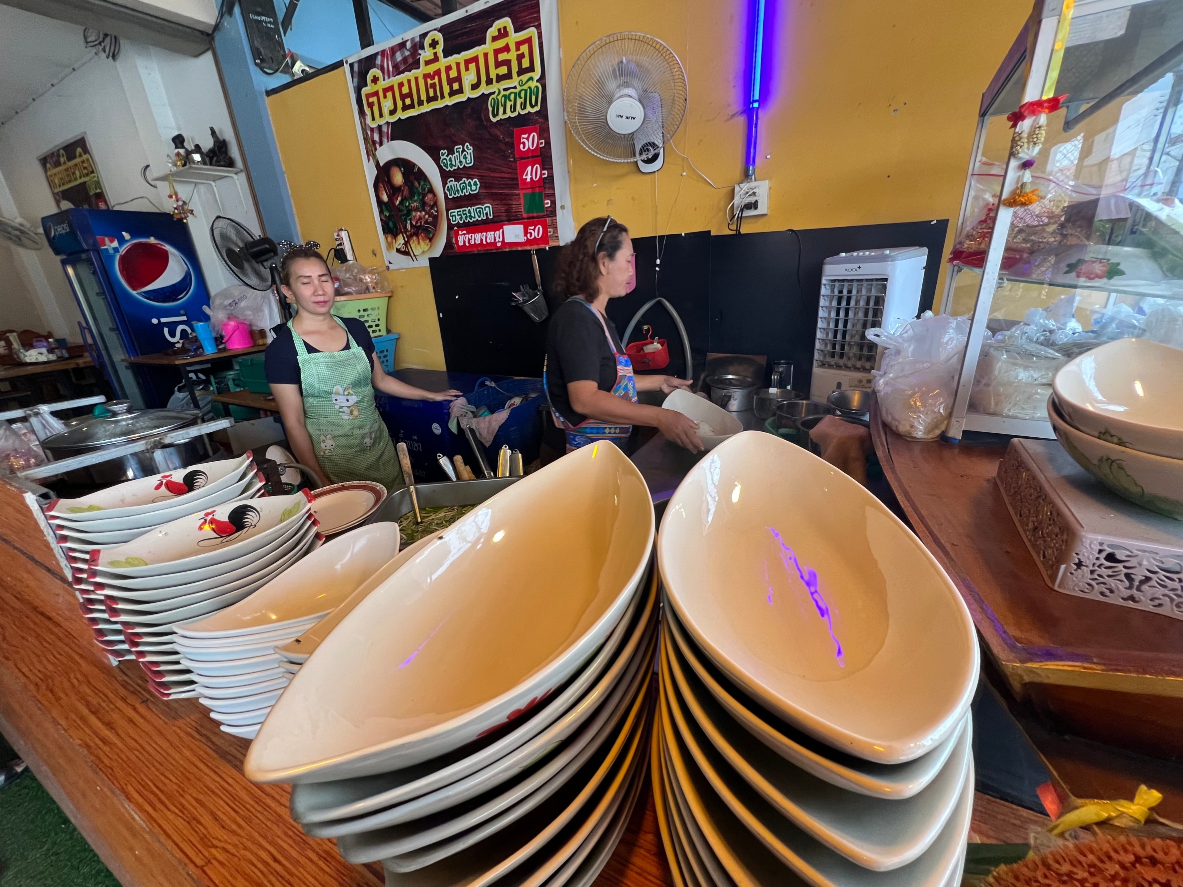 นางสุณารัตน์ บุญญะวงษ์ อายุ 43 ปี เจ้าของร้านก๋วยเตี๋ยวชาววัง เล่าว่า การที่ตนใช้ชามก๋วยเตี๋ยวแบบนี้เนื่องจากว่ามันใหญ่ สวย แล้วดูดี ดูสะอาดสอ้าน ล้างง่ายและดูเหมือนว่ามันเป็นบรรยากาศของก๋วยเตี๋ยวเรือจริงๆ ทำให้ก๋วยเตี๋ยวอร่อยดี และที่สำคัญคือความแปลกใหม่นี้ทำให้ดึงดูดเรียกลูกค้าได้ดีมาก ที่ร้านของตนจะขายเฉพาะก๋วยเตี๋ยวเรือมีแต่เนื้อหมูเท่านั้น และมีข้าวขาหมูด้วย ราคาก๋วยเตี๋ยวจะถูกมาก ราคาจะเริ่มตั้งแต่แบบธรรมดาราคาชามละ 40 บาท และแบบพิเศษจัมโบ้ซึ่งใช้ชามแบบใหญ่พิเศษนี้ ราคาเพียงชามละ 50 บาท เท่านั้น ซึ่งชามก๋วยเตี๋ยวเรือนี้แบบใหญ่สุดนี้ ตนซื้อมาในราคาใบละ 500 บาท แบบเรือเล็กราคาใบละ 70 บาท ตามลำดับ