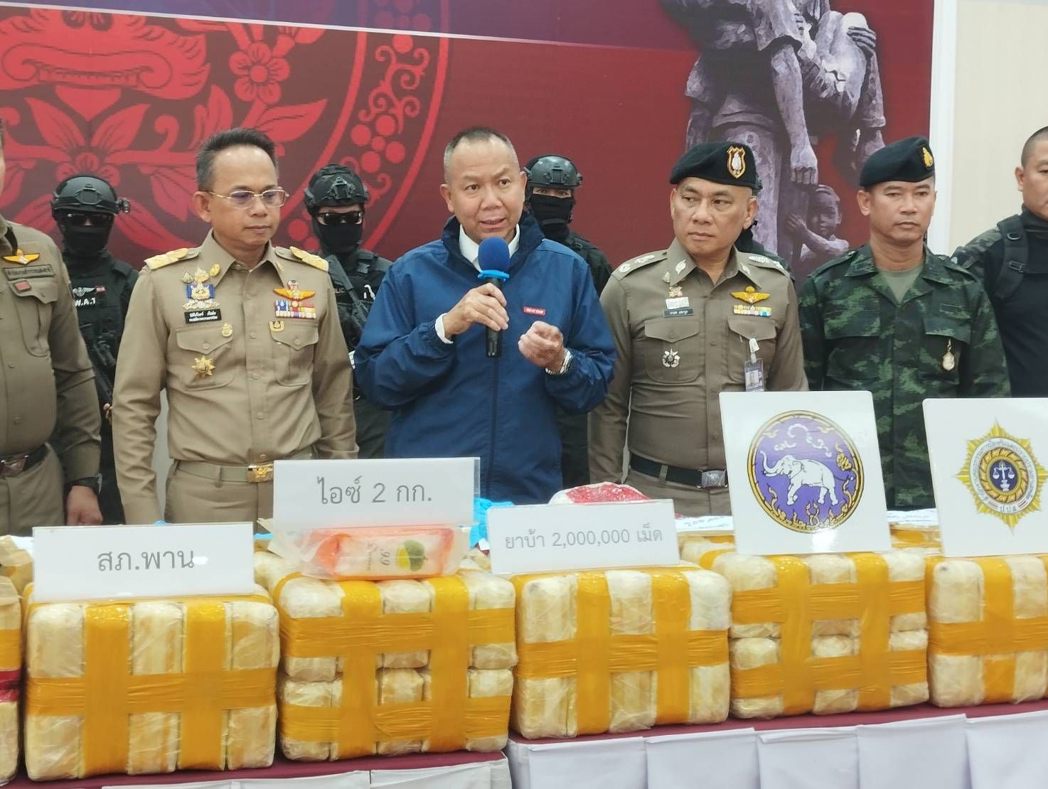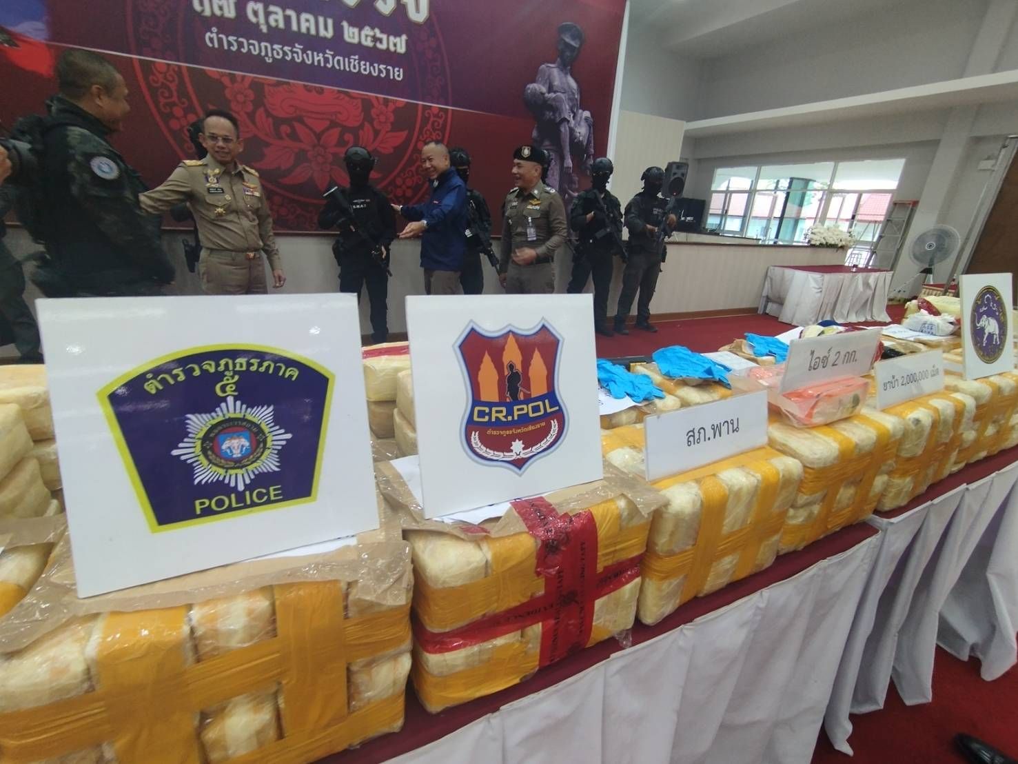 วันนี้ (17 ต.ค.67) ที่ ภ.จว.เชียงราย พล.ต.ท.กฤตธาพล ยี่สาคล ผบช.ภ.5 นายโชตินรินทร์ เกิดสม รองปลัดกระทรวงมหาดไทยและรักษาราชการผู้ว่าราชการ จ.เชียงราย พล.ต.ต.มานพ เสนากุล ผบก.ภ.จว.เชียงราย พ.ต.อ.จิตรกร ปาลกะวงศ์ ณ อยุธยา ผกก.สภ.พาน จ.เชียงราย พร้อมฝ่ายปกครอง ทหารกองกำลังผาเมือง สำนักงานป้องกันยาเสพติ (ป.ป.ส.5 ) พร้อมหน่วยงานที่เกี่ยวข้อง ได้แถลงข่าวความคืบหน้ากรณีเจ้าหน้าที่ตำรวจด่านตรวจปูแกง ต.แม่เย็น อ.พาน ได้จับกุมชายชาว จ.พัทลุง จำนวน 1 คน และชาว จ.นครศรีธรรมราช จำนวน 1 คน พร้อมของกลางยาบ้าจำนวน 2,000,000 เม็ด ไอซ์น้ำหนัก 2 กิโลกรัม ขณะพากันขับรถยนต์กระบะป้ายทะเบียน จ.นครศรีธรรมราช ไปบนถนนพหลโยธินและจะผ่านด่านตรวจปูแกงดังกล่าวเหตุเกิดเช้าของวันที่ 15 ต.ค.67 ที่ผ่านมา